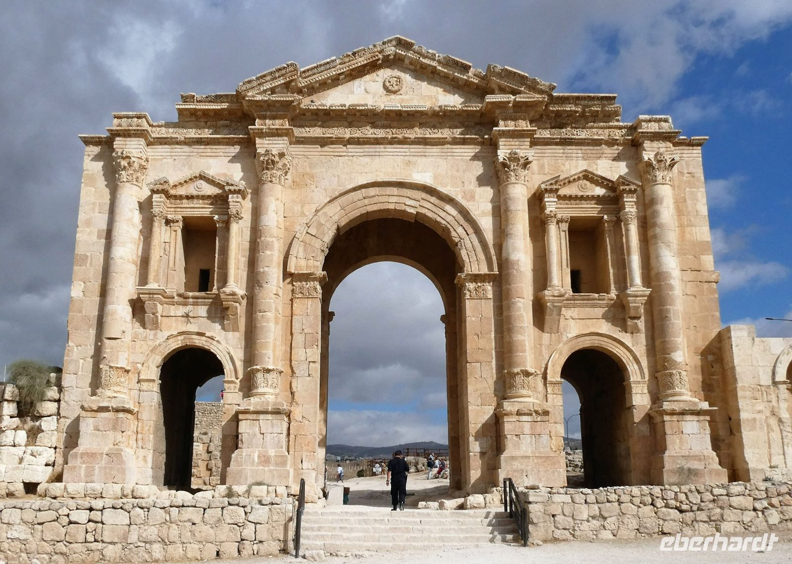 Heute sind alle richtig ausgeschlafen, denn der fehlende Schlaf am ersten Tag war doch gestern zu spüren. Heute unternehmen wir eine Reise in die Zeit als Jordanien zum römischen Reich gehörte. 10 dieser Städte unterstellten sich nach wissenschaftlicher Meinung der nördlich gelegenen römischen Provinz Syrien um der Abhängigkeit vom herodianisch regierten jüdischen Staat zu entgehen und so ihre Autonomie zu waren. Man bezeichnet sie auch als die "Dekapolis" (Zehnerstädtebund) zwischen Damaskus und Amman, welches übrigens als antikes Philadelphia auch dazu gehörte. So ist diese antike Stätte auch als grandios zu bezeichnen. Nach einem Gang durch durchaus notwendige Geschäfte, die ein Angebot aus Tüchern, frisch gepressten Säften und allerlei dies und das anbieten, gelangen wir zu dem restaurierten und beeindruckenden „Hadriansbogen“ welcher nicht den Stadteingang markierte, sondern anlässlich seines Besuches der Stadt im Jahr 129/130 n. Chr. errichtet wurde. Zum eigentlichen Stadteingang müssen wir noch ein Stückchen laufen. Dabei besuchen wir das Hippodrom, die Pferderennbahn die 15000 Besuchern Platz bietet und auch heute noch für Veranstaltungen genutzt wird. Danach kommen wir zum Südtor wo die eigentliche Stadt beginnt. Auf der linken Seite bietet der „Zeustempel“ einen guten Ausblick und weiter voran liegt ein ovaler Platz, ein Forum, welches von Kolonaden mit ionischen Kapitellen gesäumt ist. Wie soll man diesen Platz fotografieren? Nun - die Fotografen in unserer Gruppe, und wir haben einige Experten, stellen sich der Herausforderung und sind immer irgendwie verschwunden. Aber sie haben die Sache im Griff und wir bekommen besonders schöne Bilder für unsere neu gegründete „what’s app“ Gruppe.