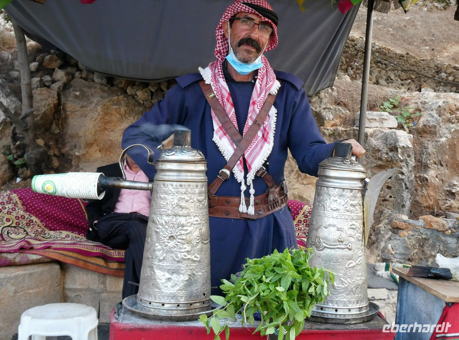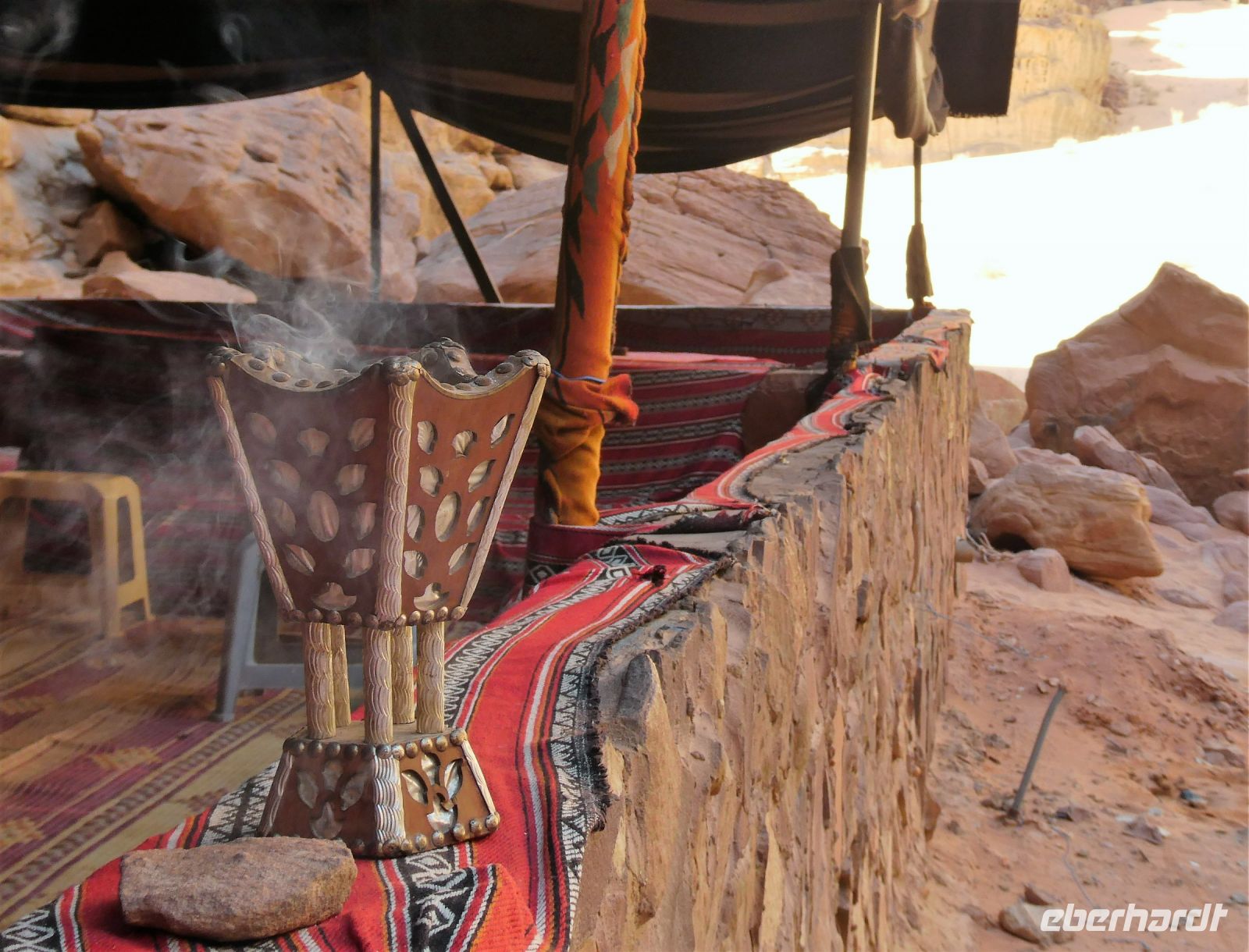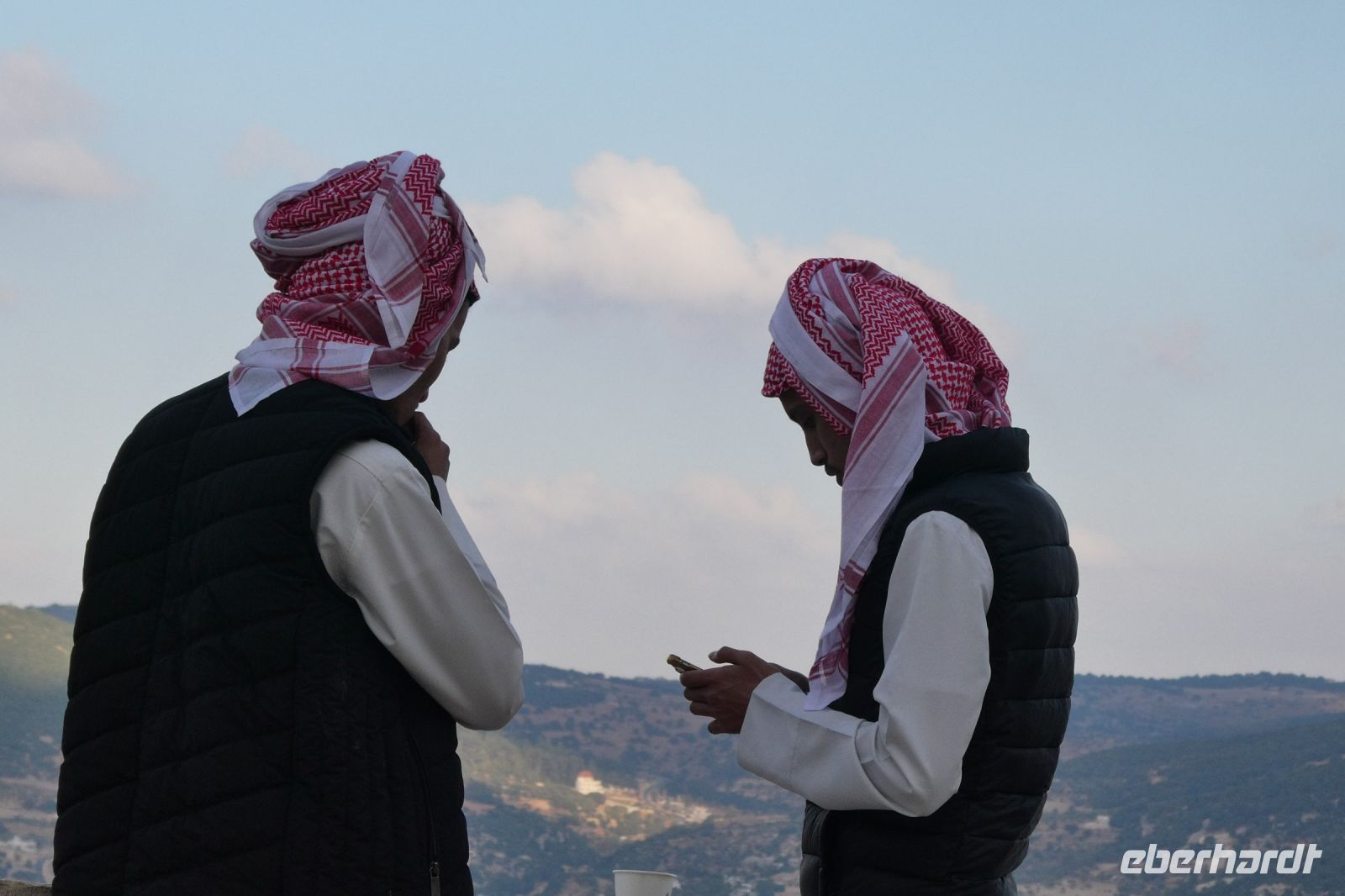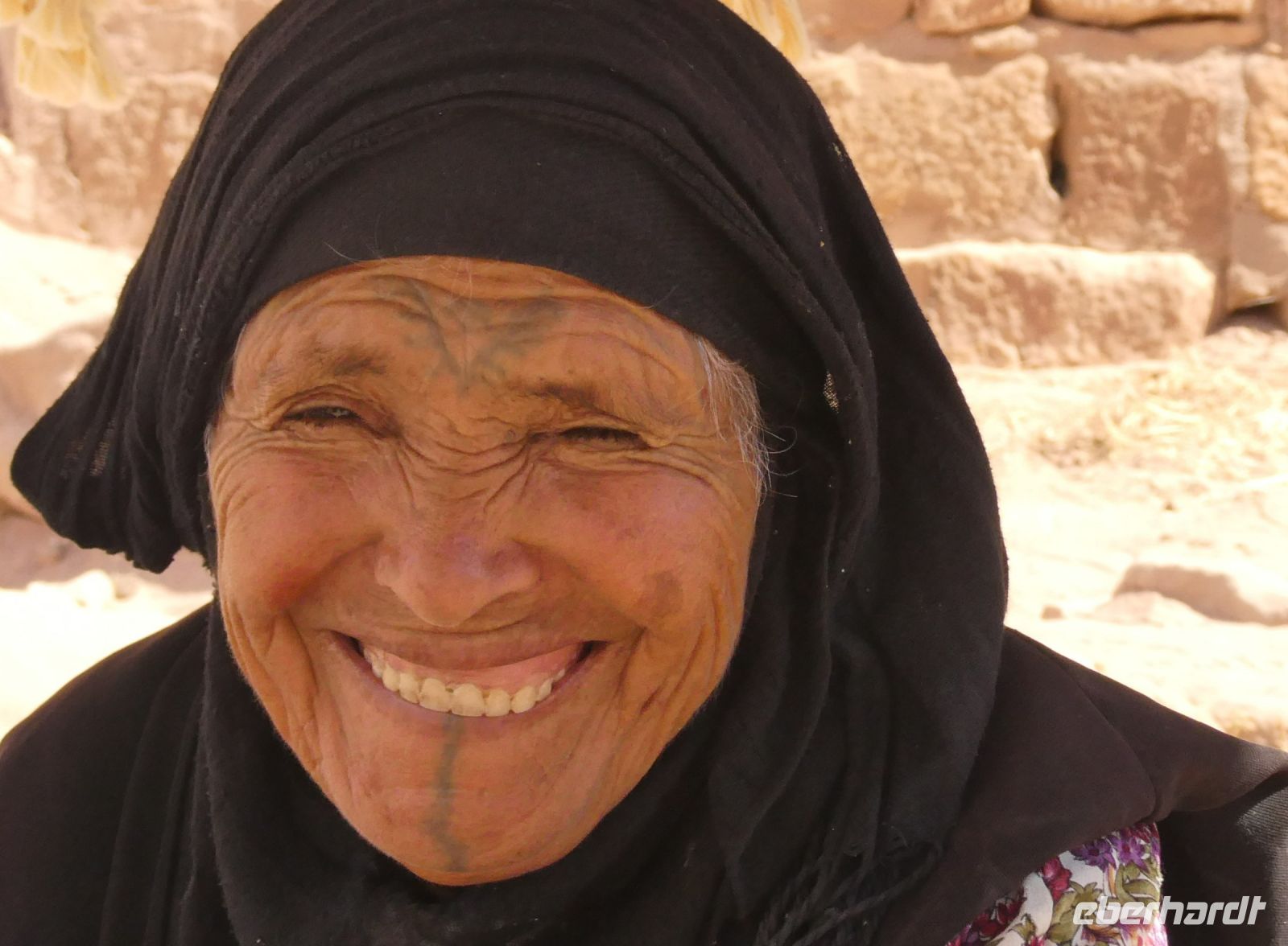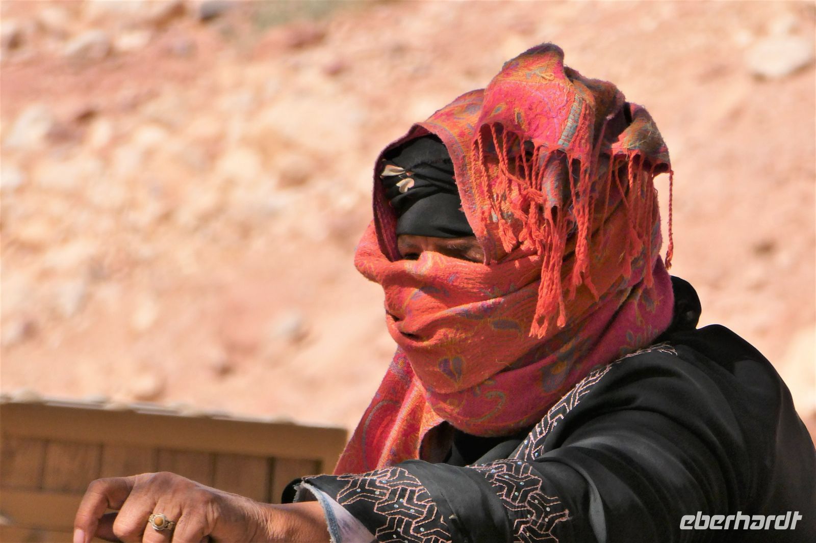 Der eigentliche Opferaltar ist an der Seite über Treppen zu erreichen und in der runden Vertiefung daneben wurde wahrscheinlich das Blut der Opfertiere aufgefangen. Allerdings ist der Platz so klein, dass wahrscheinlich keine Großveranstaltungen durchgeführt werden konnten. Nach einer Weile ausgiebiges betrachten der Aussicht und der Umgebung gehen wir noch zu einem weiteren Aussichtspunkt bevor wir wieder den Abstieg auf der gleichen Route antreten. Von einer Beduinenfrau, der wir versprachen sie auf dem Rückweg zu besuchen, bietet uns Tee an, den wir nicht ablehnen können.