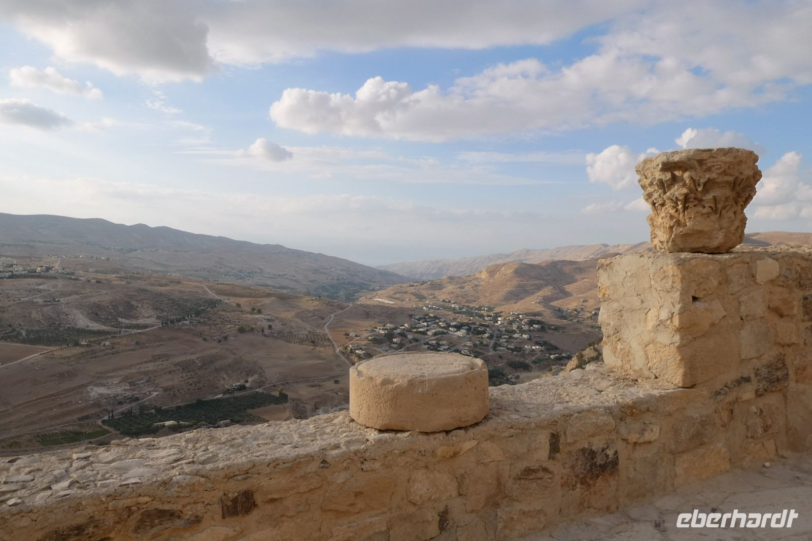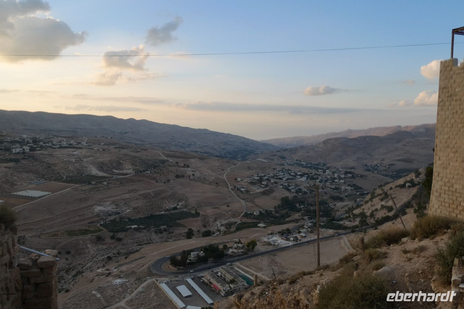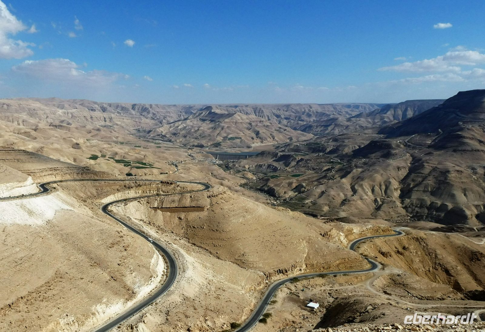 Wir spazieren ein wenig durch "Madaba" zu unserem Restaurant. Dort bekommen wir wieder wunderbare jordanische Vorspeisen und ein wahlweises Hauptgericht. So gestärkt fahren wir weiter durch die jordanische Landschaft und erreichen das "Wadi Mujib". Dieses Trockental im Bergland von Jordanien endet am Toten Meer, 410 m unter dem Meeresspiegel. Es gibt auch ein Naturschutzgebiet dessen Artenvielfalt noch nicht komplett dokumentiert wurde. Auch Grundwasser tritt hier teilweise an die Oberfläche in diesem verhältnismäßig wasserreichen, geschützten Gebiet. Es soll sogar einen kleinen Sumpf geben. Wir fahren über die "Königsstraße" welche an der "Mujib-Talsperre" den Fluss überquert. Der Stausee dämmt die gefährlichen Sturzbäche des Wadis. Etwas was man sich angesichts des generellen Wassermangels kaum vorstellen kann. An einem Aussichtspunkt machen wir Halt für ein Foto.