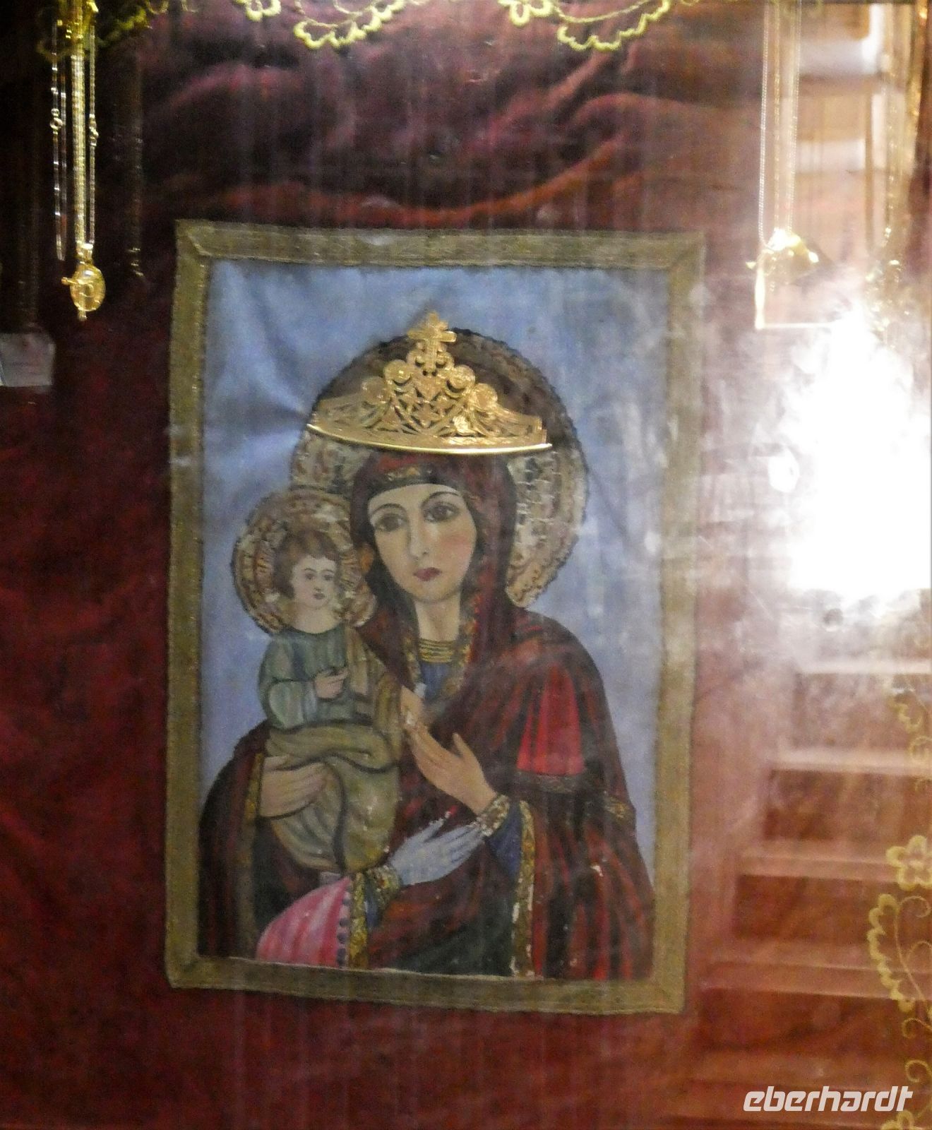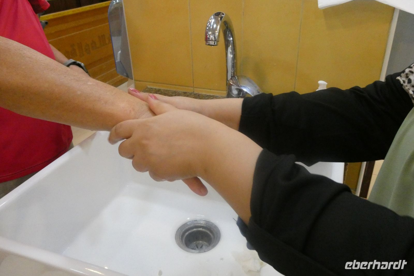 Danach fahren wir weiter nach "Madaba", die Stadt der Mosaike – und die Stadt der Christen. Hier befindet sich das berühmteste Mosaik der gesamten Region, das Bodenmosaik in der "St.Georgs-Kirche". Sie stammt von der Mitte des 6.Jahrhunderts und ist die älteste kartographische Darstellung des sog. „Heiligen Landes“, insbesondere Jerusalems. Durch diese Darstellung war eine ziemliche genaue Datierung der Karte möglich, da einige Bauwerke, die nach 570 errichtet wurden, fehlen. Im 19.Jahrhundert wurde das Mosaik für den Bau der griechisch-orthodoxen Kirche an der Stelle spätantiker Ruinen freigelegt. Wir betrachten die Karte und bekommen eine Erklärung der einzelnen Bestandteile von Kareem. Auch die Kirche ist sehenswert, wir können aber das Rätsel der blauen Hand auf den Bildern nicht endgültig lösen. Die Hand ist ja ein starkes religiöses Symbol und taucht in vielen Religionen, auch denen des Fernen Ostens, auf. Meistens bedeutet sie Schutz und Stärke wird aber auch als Gottessymbol eingesetzt.
