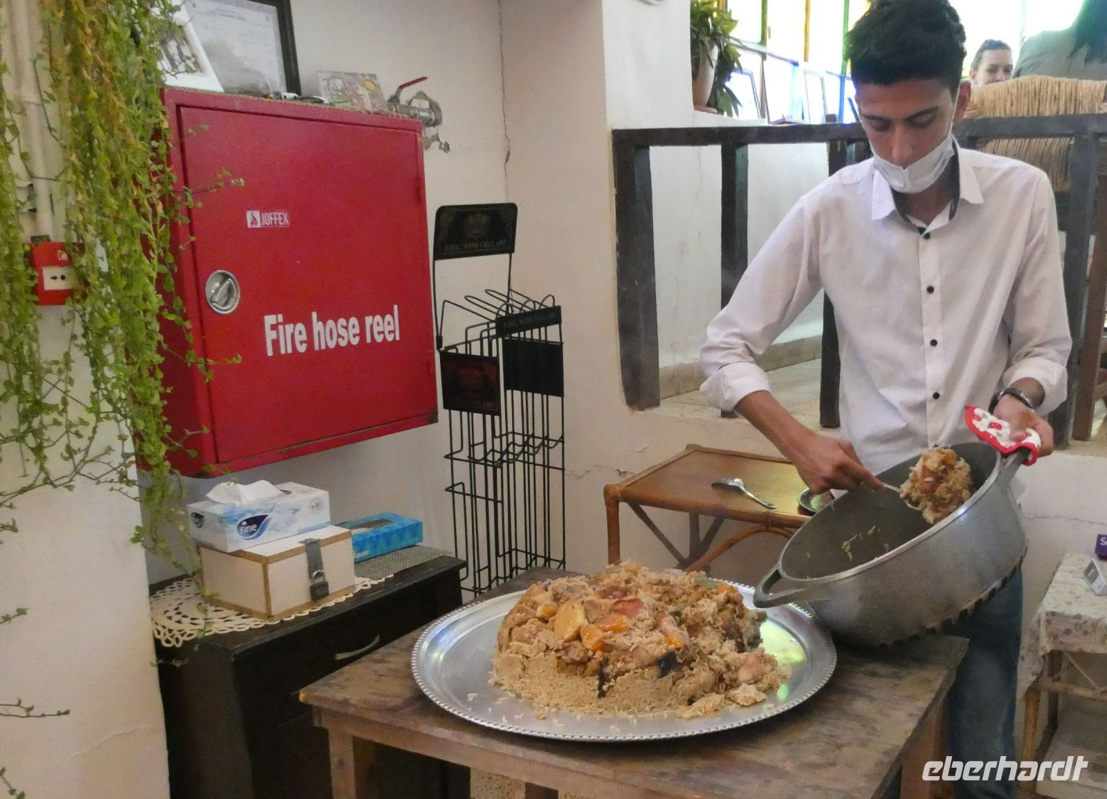 So langsam meldet sich bei allen der Hunger und es war ja auch eine jordanische Spezialität angekündigt: „Maqluba“ ein verbreitetes Gericht in der „Levante“. Der Name bedeutet: „auf den Kopf gestellt“. Wir fahren in das Restaurant in der Nähe und da kommt auch schon einer der Kellner mit einem riesigen Kochtopf, welcher vor unseren Augen umgedreht wird. Eine schmackhafte Mahlzeit aus Hähnchen, gebratenem Gemüse und Reis. Das Rezept geht wohl auf das 13.Jahrhundert zurück. Dazu können wir Zitronensaft mit Minze oder frisch gepressten Granatapfelsaft bestellen. Das Ganze wird durch einen arabischen Kaffee mit Kardamom abgerundet. So kann es weitergehen.