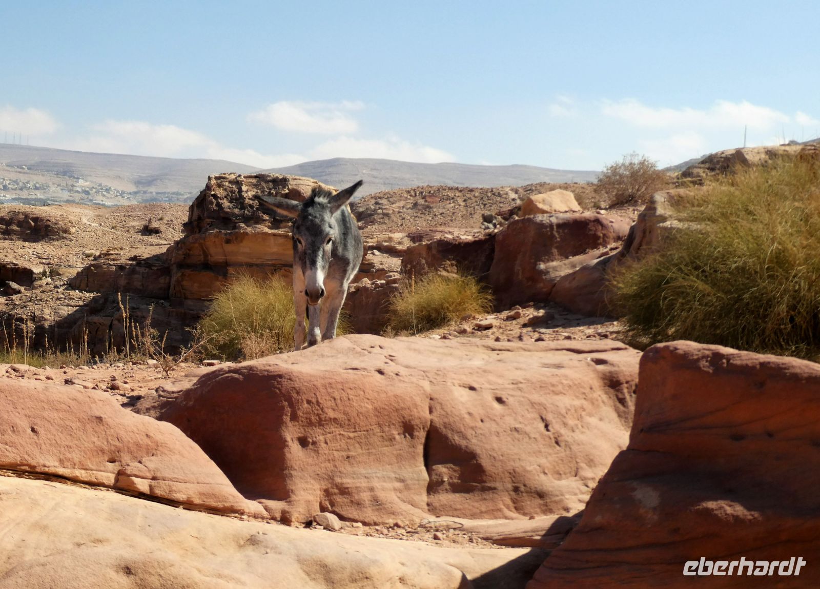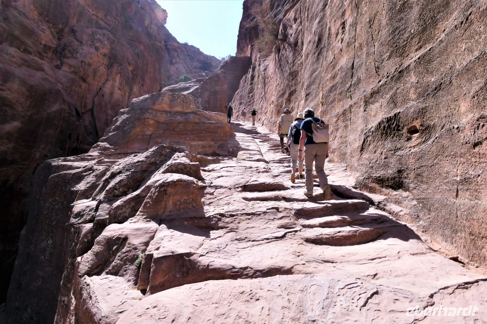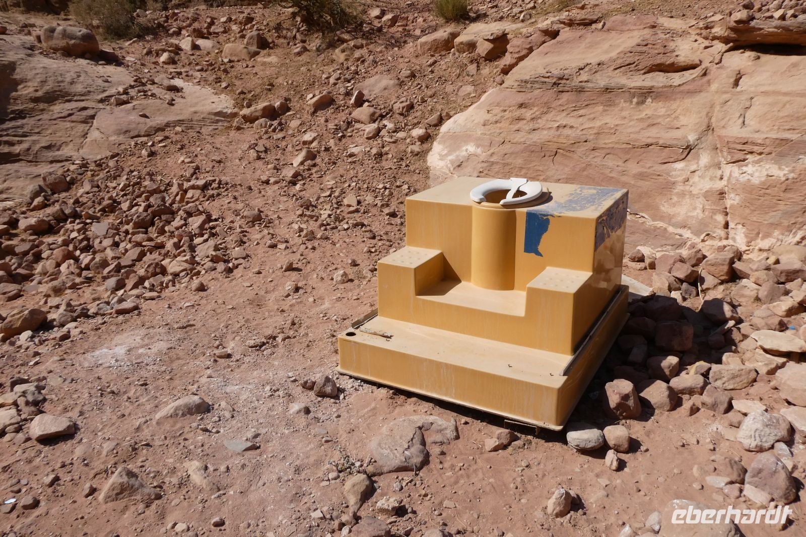 Am nächsten Tag treffen sich einige aus der Gruppe um den "hohen Opferplatz" zu besteigen. Wieder laufen wir durch den Siq und bewundern noch einmal das „Schatzhaus“ welches vor allem durch Filme wie "Indiana-Jones bei uns berühmt wurde. Unser Weg aber führt uns weiter bis kurz vor dem Theater wo der Aufstieg zum Opferplatz beginnt. Stetig führen die Stufen nach oben. Es sollen über 800 Stufen insgesamt sein. Der Weg ist kurzweilig und zwei Damen aus unserer Gruppe wollen doch lieber unten bleiben und lieber noch einmal selber herumspazieren. Wir anderen gehen nach oben. Unsere Gruppe ist fast ganz alleine unterwegs. Auf dem Weg begegnen uns Beduinenfrauen, welche Schmuck und andere Souvenirs verkaufen. Auf dem Weg steht plötzlich ein besonderes „Örtchen“ mitten in der Landschaft, ohne Sichtschutz und Wände. Wir mutmaßen, dass es wohl eher für Menschen mit langen Gewändern aufgestellt wurde.