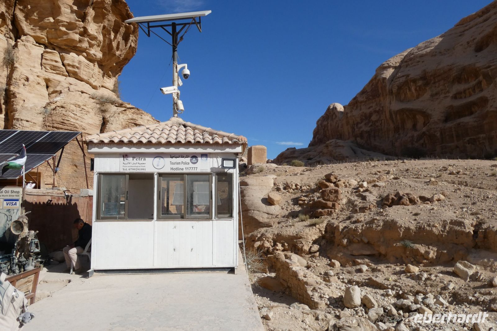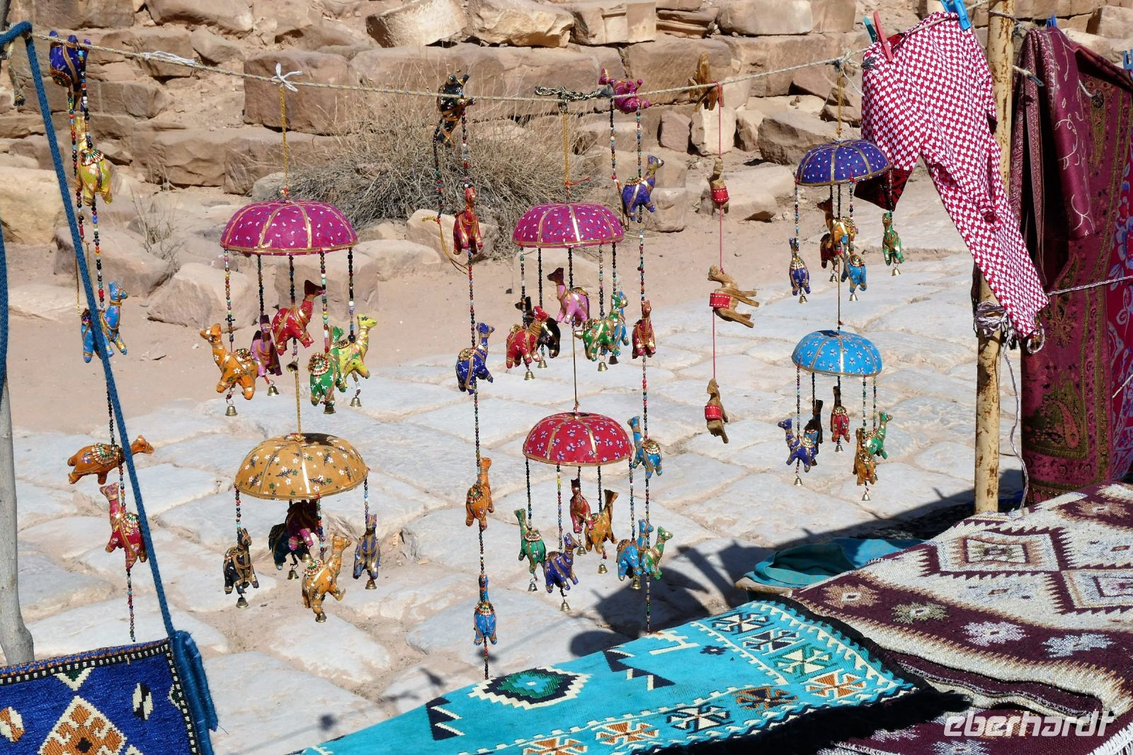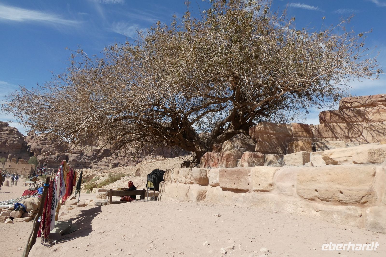 Am nächsten Tag treffen sich einige aus der Gruppe um den "hohen Opferplatz" zu besteigen. Wieder laufen wir durch den Siq und bewundern noch einmal das „Schatzhaus“ welches vor allem durch Filme wie "Indiana-Jones bei uns berühmt wurde. Unser Weg aber führt uns weiter bis kurz vor dem Theater wo der Aufstieg zum Opferplatz beginnt. Stetig führen die Stufen nach oben. Es sollen über 800 Stufen insgesamt sein. Der Weg ist kurzweilig und zwei Damen aus unserer Gruppe wollen doch lieber unten bleiben und lieber noch einmal selber herumspazieren. Wir anderen gehen nach oben. Unsere Gruppe ist fast ganz alleine unterwegs. Auf dem Weg begegnen uns Beduinenfrauen, welche Schmuck und andere Souvenirs verkaufen. Auf dem Weg steht plötzlich ein besonderes „Örtchen“ mitten in der Landschaft, ohne Sichtschutz und Wände. Wir mutmaßen, dass es wohl eher für Menschen mit langen Gewändern aufgestellt wurde.