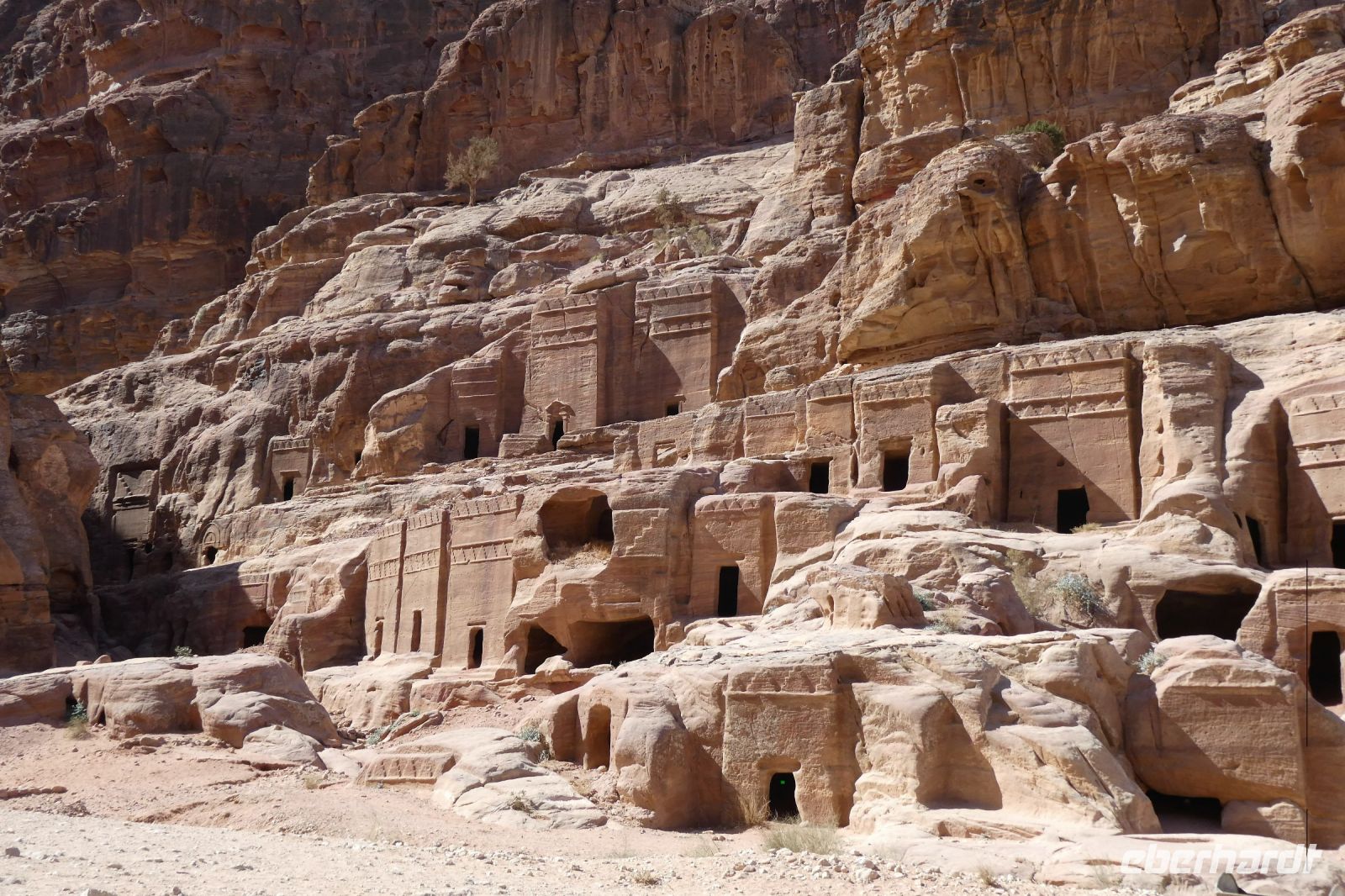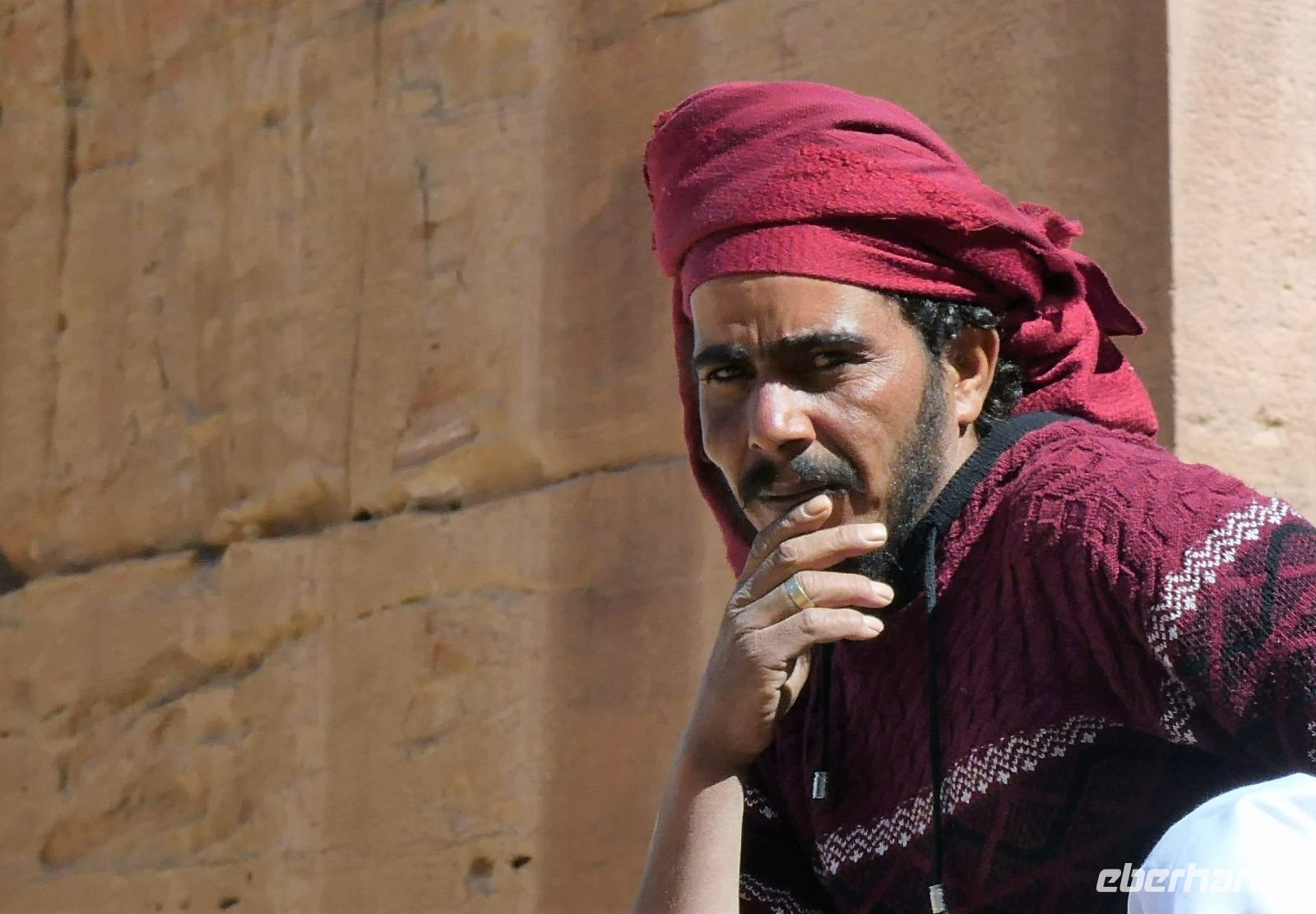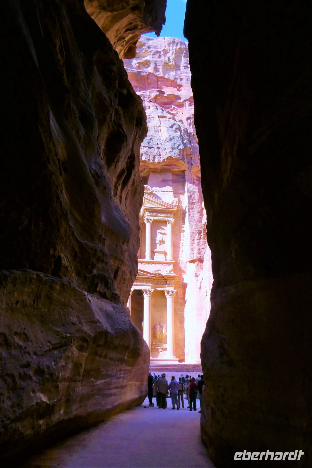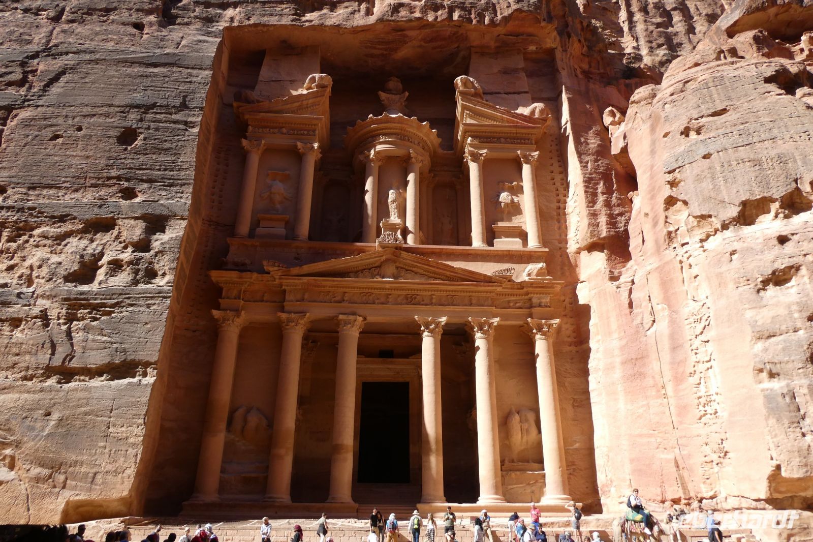 Nach unserem Frühstück treffen wir uns am Eingang dieser sagenhaften Stadt "Petra", welche zu Beginn des 19.Jahrhunderts von dem Schweizer Johann Ludwig Burckhardt für die Europäer wiederentdeckt wurde. Zu Beginn des 20. Jahrhunderts begann man mit Ausgrabungen und der Freilegung dieser historischen Stätte. Von den 70er bis in die 80er Jahre hinein wurden die Beduinen vom "Stamm der B’doul", welche in den Felskammern lebten, umgesiedelt, um Petra touristisch nutzen zu können. Allerdings musste man Zugeständnisse an die Beduinen machen. Sie leben heute von den Einnahmen und unterhalten kleine Geschäfte, wie Souvenirshops und kleine Imbisse bzw. Getränkestände. Die Nabatäer, welche ein für ihre Zeit wohlhabendes Händlervolk waren, behalten trotz aller historischer Forschungen und Bemühungen der Wissenschaft, einige Geheimnisse für sich. Trotz Inschriften und erhaltenen Artefakten stützt sich die Wissenschaft auf die Archäologie und die wenigen schriftlichen historischen Zeugnisse, die natürlich auch schon zu ihrer Entstehung propagandistisch gefärbt waren. Vorbei an den ersten Gräbern, die in die Höhlen gemeißelt sind,erreichen wir die "Djinn-Gräber" (Geister-Gräber) die so heißen, weil sie ab und zu bei bestimmten Windverhältnissen gespenstische Töne von sich geben. Wir kommen zum Eingang des "Siq", der Schlucht die einer der wenigen Zugänge zur Stadt ist und durchqueren sie, die teilweise ziemlich eng wird. Wir betrachten die nabatäischen Wasserleitungen und die Technik die hinter Allem stand. Sie waren Meister darin und wussten die Wasserkraft zu nutzen. Plötzlich erspähen wir das wohl berühmteste Bauwerk Petras: „das Schatzhaus“ oder „Khazne al-Firaun“. Fast unwirklich erscheint die von der Sonne erleuchtete Fassade. Auf die Steinurne wurde schon in früher Zeit geschossen, da man einen Schatz in ihr vermutete, daher auch der Name. Beduinen bieten Kamelritte an und so ist der Platz sehr belebt: Beduinen, Kamele und Touristen. Dabei einige Kaffees und junge Männer die eine Kletterpartie zur besten Aussicht auf den Tempel anbieten. Davon wird allerdings dringend abgeraten da es durch Steinschlag schon Todesopfer hier gegeben hat.