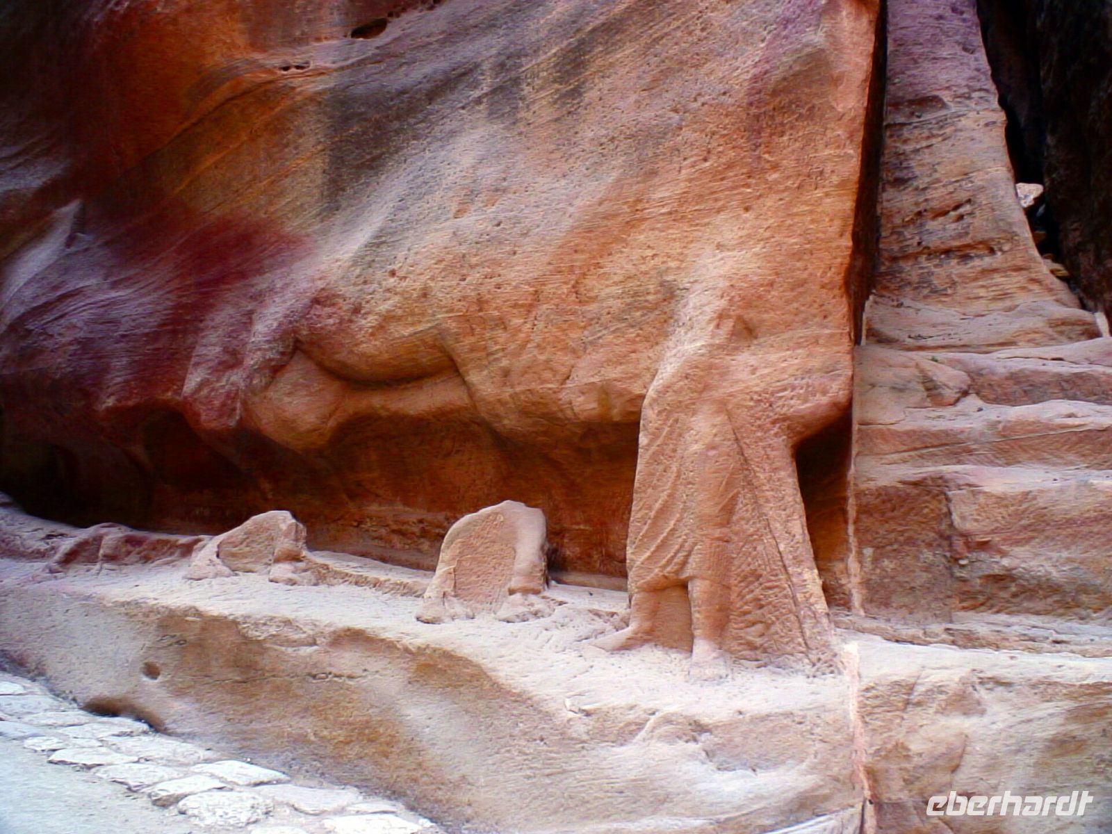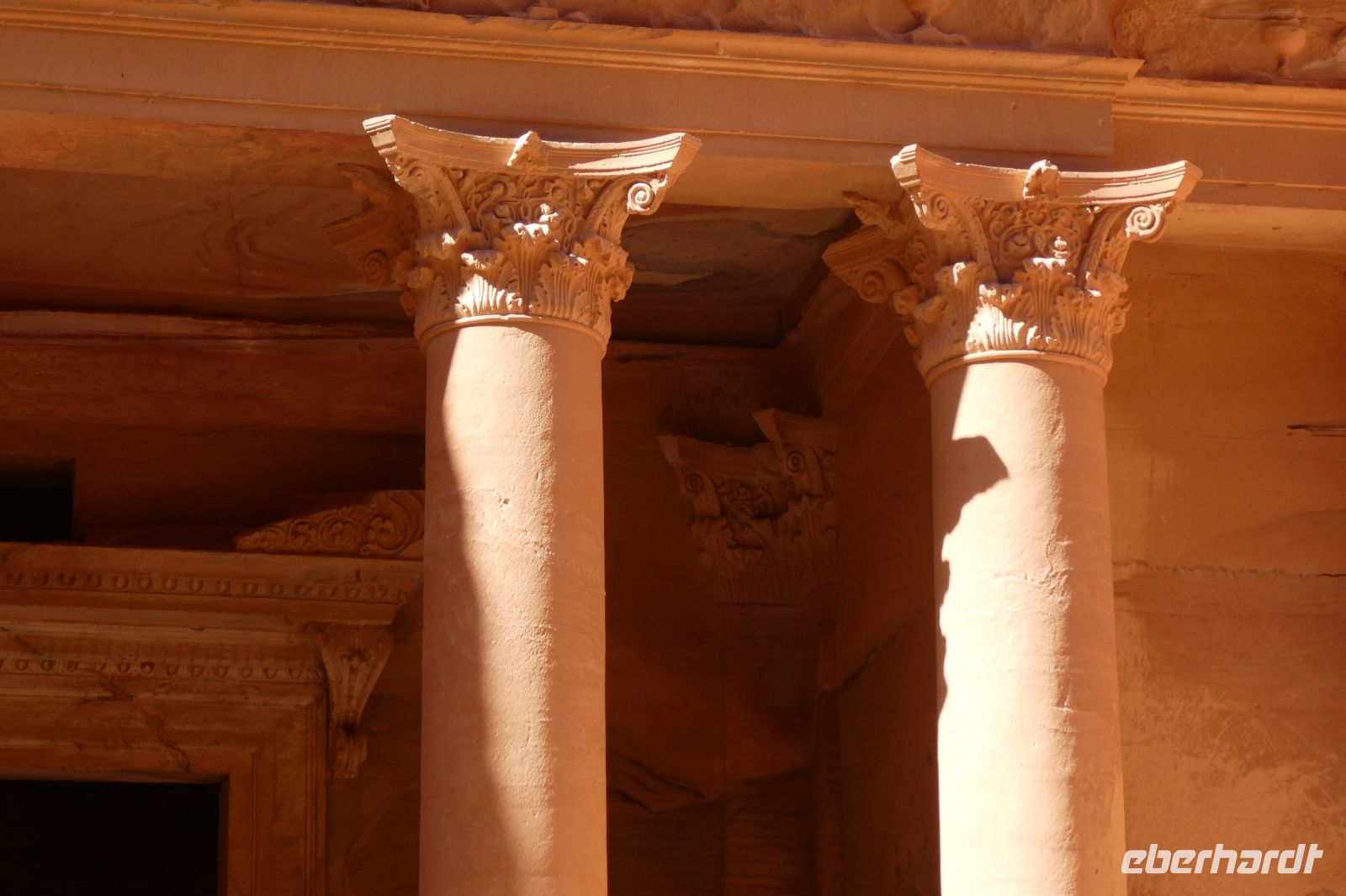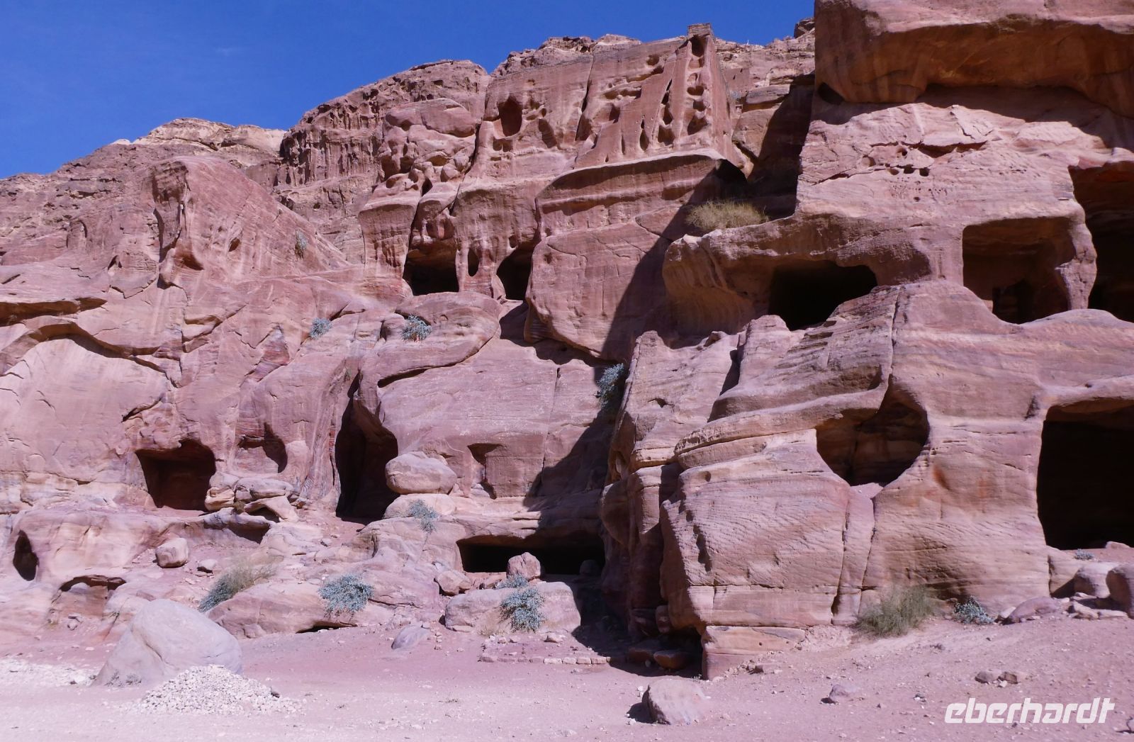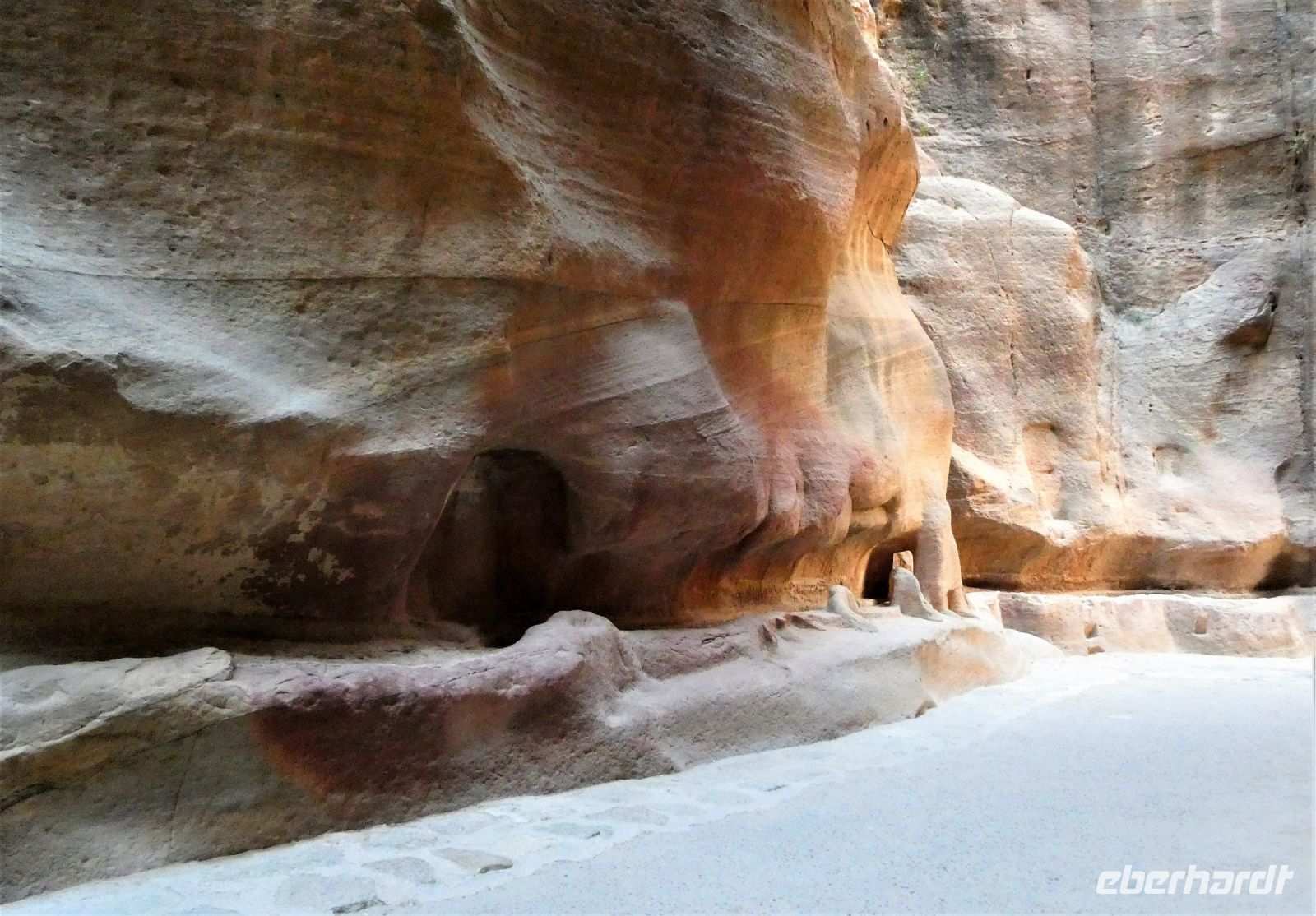 Nach unserem Frühstück treffen wir uns am Eingang dieser sagenhaften Stadt "Petra", welche zu Beginn des 19.Jahrhunderts von dem Schweizer Johann Ludwig Burckhardt für die Europäer wiederentdeckt wurde. Zu Beginn des 20. Jahrhunderts begann man mit Ausgrabungen und der Freilegung dieser historischen Stätte. Von den 70er bis in die 80er Jahre hinein wurden die Beduinen vom "Stamm der B’doul", welche in den Felskammern lebten, umgesiedelt, um Petra touristisch nutzen zu können. Allerdings musste man Zugeständnisse an die Beduinen machen. Sie leben heute von den Einnahmen und unterhalten kleine Geschäfte, wie Souvenirshops und kleine Imbisse bzw. Getränkestände. Die Nabatäer, welche ein für ihre Zeit wohlhabendes Händlervolk waren, behalten trotz aller historischer Forschungen und Bemühungen der Wissenschaft, einige Geheimnisse für sich. Trotz Inschriften und erhaltenen Artefakten stützt sich die Wissenschaft auf die Archäologie und die wenigen schriftlichen historischen Zeugnisse, die natürlich auch schon zu ihrer Entstehung propagandistisch gefärbt waren. Vorbei an den ersten Gräbern, die in die Höhlen gemeißelt sind,erreichen wir die "Djinn-Gräber" (Geister-Gräber) die so heißen, weil sie ab und zu bei bestimmten Windverhältnissen gespenstische Töne von sich geben. Wir kommen zum Eingang des "Siq", der Schlucht die einer der wenigen Zugänge zur Stadt ist und durchqueren sie, die teilweise ziemlich eng wird. Wir betrachten die nabatäischen Wasserleitungen und die Technik die hinter Allem stand. Sie waren Meister darin und wussten die Wasserkraft zu nutzen. Plötzlich erspähen wir das wohl berühmteste Bauwerk Petras: „das Schatzhaus“ oder „Khazne al-Firaun“. Fast unwirklich erscheint die von der Sonne erleuchtete Fassade. Auf die Steinurne wurde schon in früher Zeit geschossen, da man einen Schatz in ihr vermutete, daher auch der Name. Beduinen bieten Kamelritte an und so ist der Platz sehr belebt: Beduinen, Kamele und Touristen. Dabei einige Kaffees und junge Männer die eine Kletterpartie zur besten Aussicht auf den Tempel anbieten. Davon wird allerdings dringend abgeraten da es durch Steinschlag schon Todesopfer hier gegeben hat.