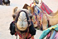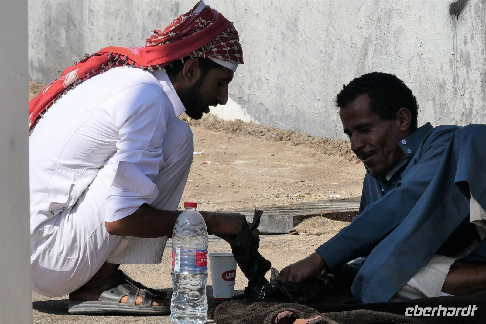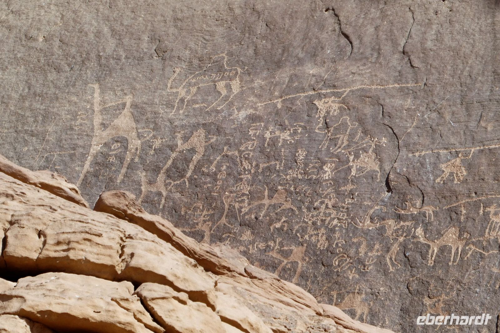 Es geht weiter zu einem Felsen, auf dem zahlreiche Felsbilder zu sehen sind, wie Kamele und Inschriften. Leider halten sich Menschen immer für so wichtig um ihre eigenen Graffitis zu hinterlassen, was natürlich ein Teil des Alten zerstört. Hier besteigen zwei aus unserer Gruppe Dromedare um ein Stück des Weges zu reiten. Diese Tiere die wie kein anderes an Wüstenbedingungen angepasst sind waren für den früheren Karawanenhandel unabdingbar. Sie halfen dem Überleben in diesen unwirtlichen Weiten. Wir treffen unsere 2 tapferen Reiterinnen dann in einem Kaffeehaus wieder. Dort, in der Nähe eines Reliefbildes von T.E.Lawrence, machen wir eine gemeinsame Tee- oder Kaffeepause bei den Beduinen. Einladend prasselt das Feuer und symbolisiert auch die Gastlichkeit der Menschen, was in früheren Zeiten in Wüstengebieten überlebenswichtig war. Denn das Gastrecht war unantastbar und musste jedem der aus der Wüste kam gewährt werden. Dieses und viele andere Rituale der Beduinengesellschaft hat auch Einzug in die arabische Kultur gefunden und spiegelt sich ebenfalls in der islamischen Religion wider. Leider kann unser Besuch im Wadi Rum nur kurz sein, denn wir wollen heute noch nach Aqaba. Viele von uns freuen sich auf ein Bad im Roten Meer. Deshalb gibt es heute keine große Mittagspause, sondern auf Wunsch Sandwiches, welche Kareem für uns an einer Tankstelle organisiert. Dafür schmecken sie aber sehr gut. Bei einem kleinen Smalltalk mit einem Fahrer eines Kleinlasters erfahren wir, dass es Fremdarbeiter aus Pakistan sind, die als Fahrer ihren Lebensunterhalt verdienen.