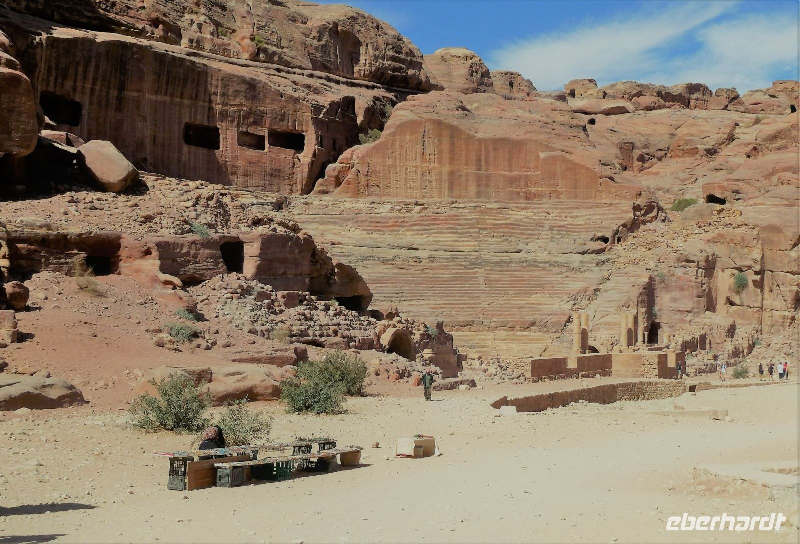 Wir klettern noch ein wenig bergan und stehen dann auf einem Plateau mit dem eigentlichen sog. „Hohen Opferplatz“. Er ist einer von mehreren Kultplätzen in Petra, aber der am besten erhaltene. In der Mitte befindet sich ein Hof an dessen Umrandung die Zuschauer wahrscheinlich Platz nehmen konnten. In der Mitte die leichte Erhöhung war eine Art Opfertisch, auf dem Speisen und Getränke als Opfergabe dargeboten wurden.