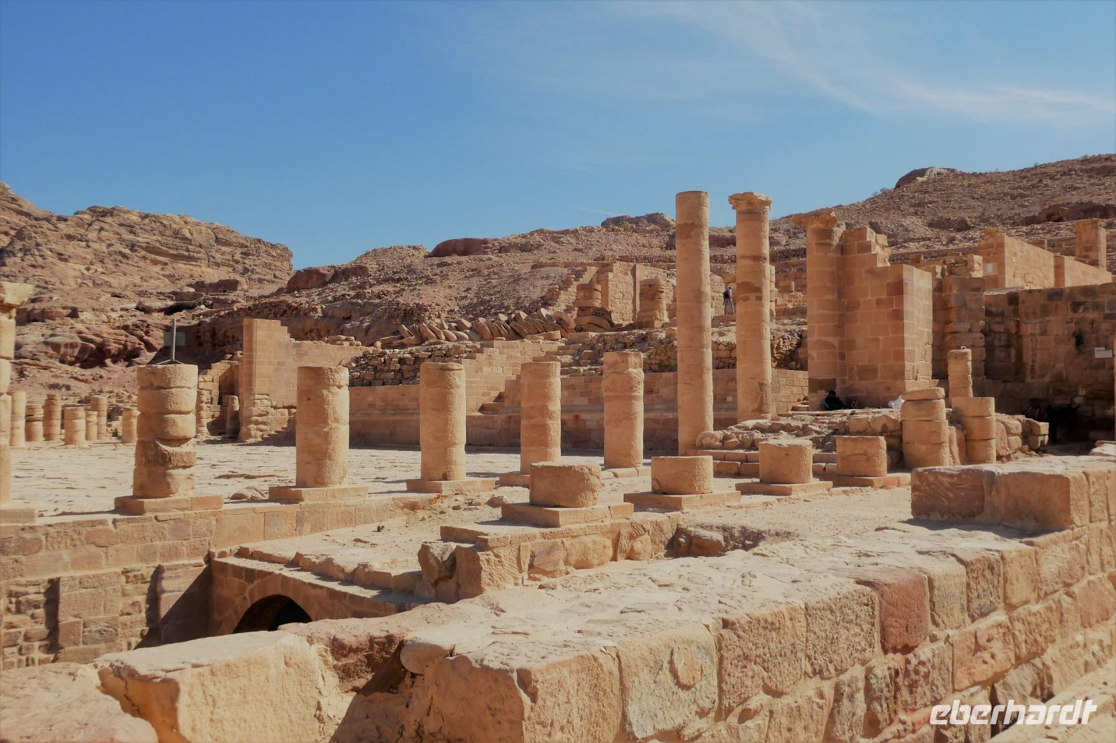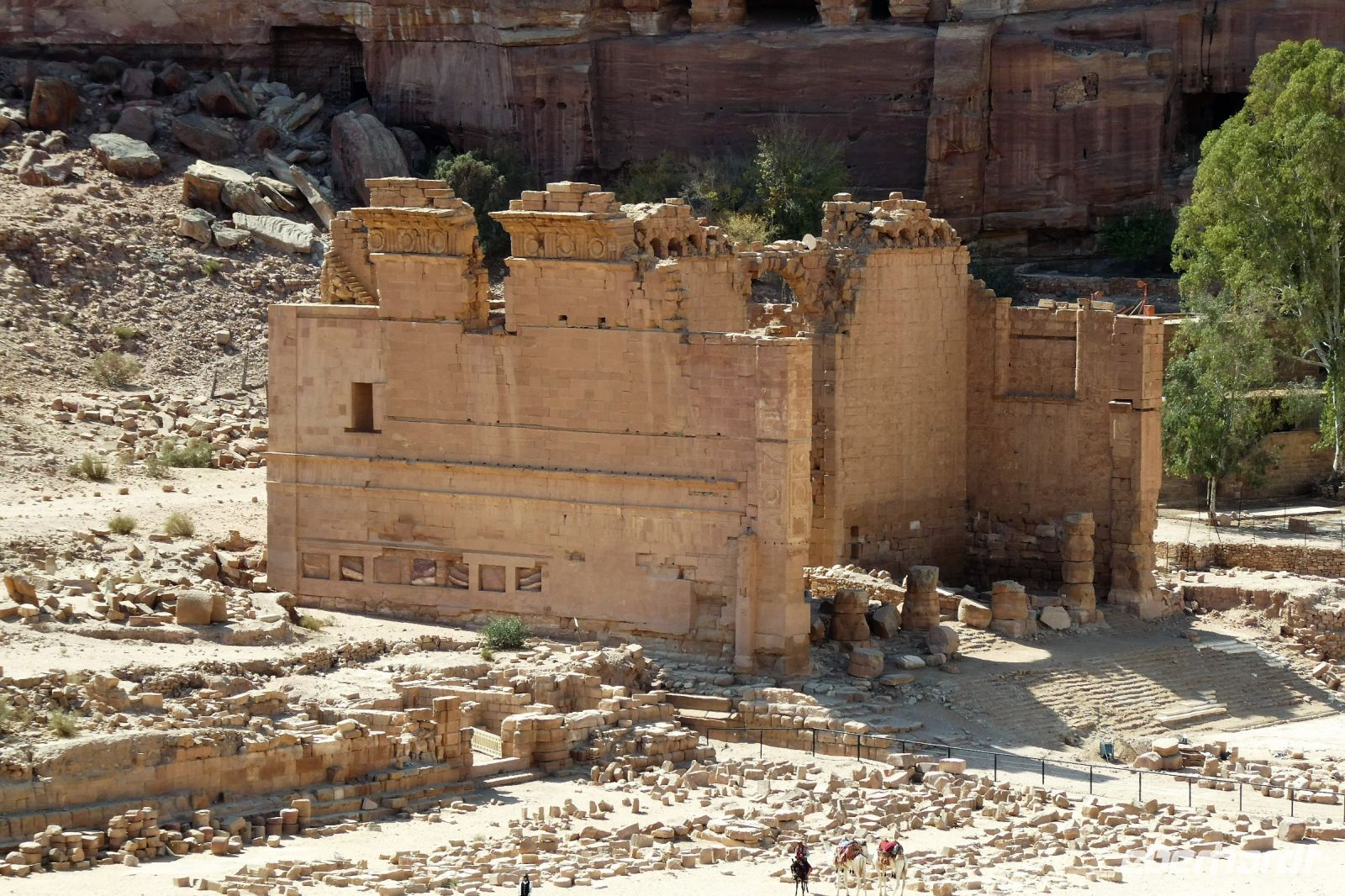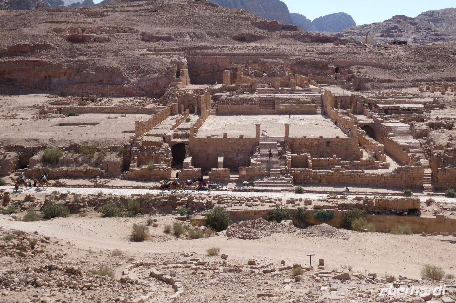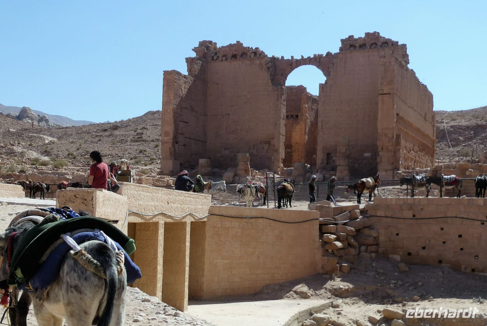 Von hier oben haben wir einen guten Blick auf den Cardo welcher die Hauptstraße von Petra war und auf den "großen Tempel" aus der römischen Epoche. Wir steigen hinab zu dem Tempel am Ende des Cardo, dem "Qasr al-Bint". Er wurde wohl zur selben Zeit wie das Schatzhaus errichtet, zur Zeit der Regentschaft des König Aretas, also zwischen 9 v.Chr. – 40 n.Chr. Er soll dem nabatäischen Hauptgott "Dushara" gewidmet sein. Der heilige Bezirk darf heute leider nicht mehr betreten werden, wahrscheinlich zum Schutz der Stätte. Wir sind beeindruckt von der Ausstrahlungskraft der Gebäude. Von hier weiter geht der Weg zum „Kloster Ed-Deir“, welches einige von uns morgen an dem 2. Tag besuchen wollen. Hier ist auch ein Parkplatz für Esel, die hier ihre Dienste (bzw. deren Besitzer) anbieten. Hier am "Qasr al-Bint" endet unsere heutige offizielle Führung und wir kehren individuell wieder in unser Hotel zurück. Jetzt am Nachmittag ist es ganz schön heiß hier in Petra und jeder freut sich sicher auf eine Dusche im Hotel und auf? ……..“Petra by night“ was die meisten aus der Gruppe individuell gebucht haben. Petra in der Nacht bei Kerzenlicht.