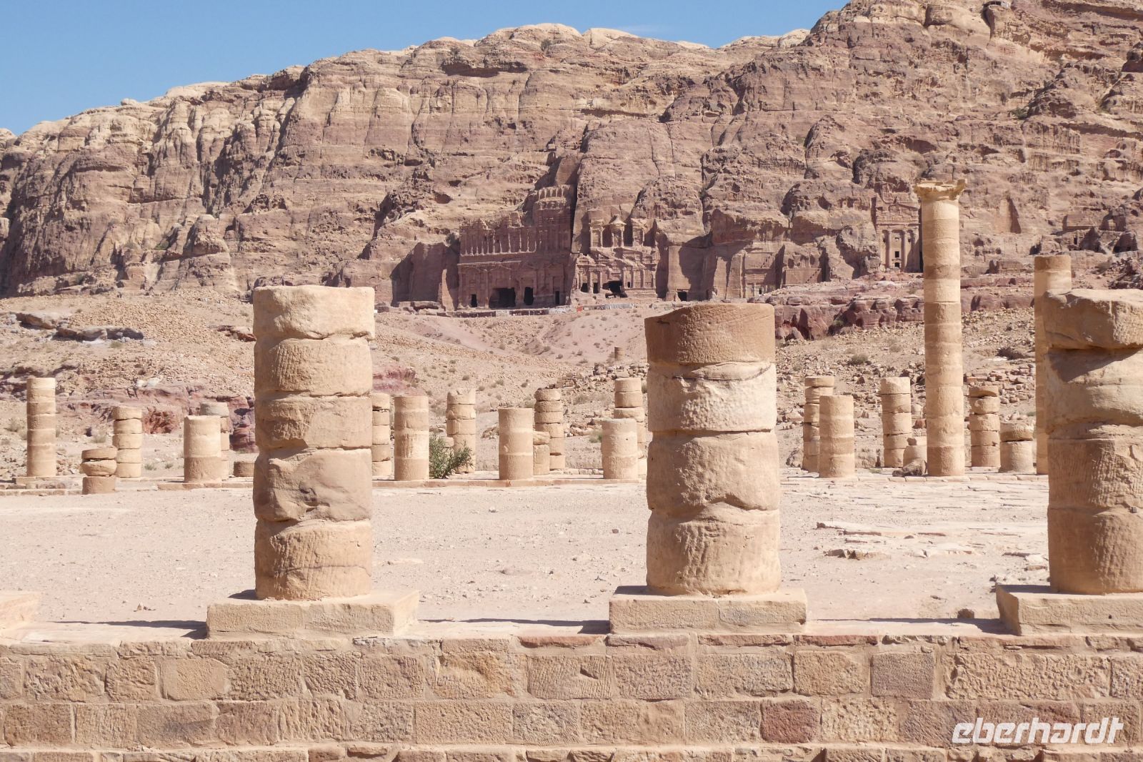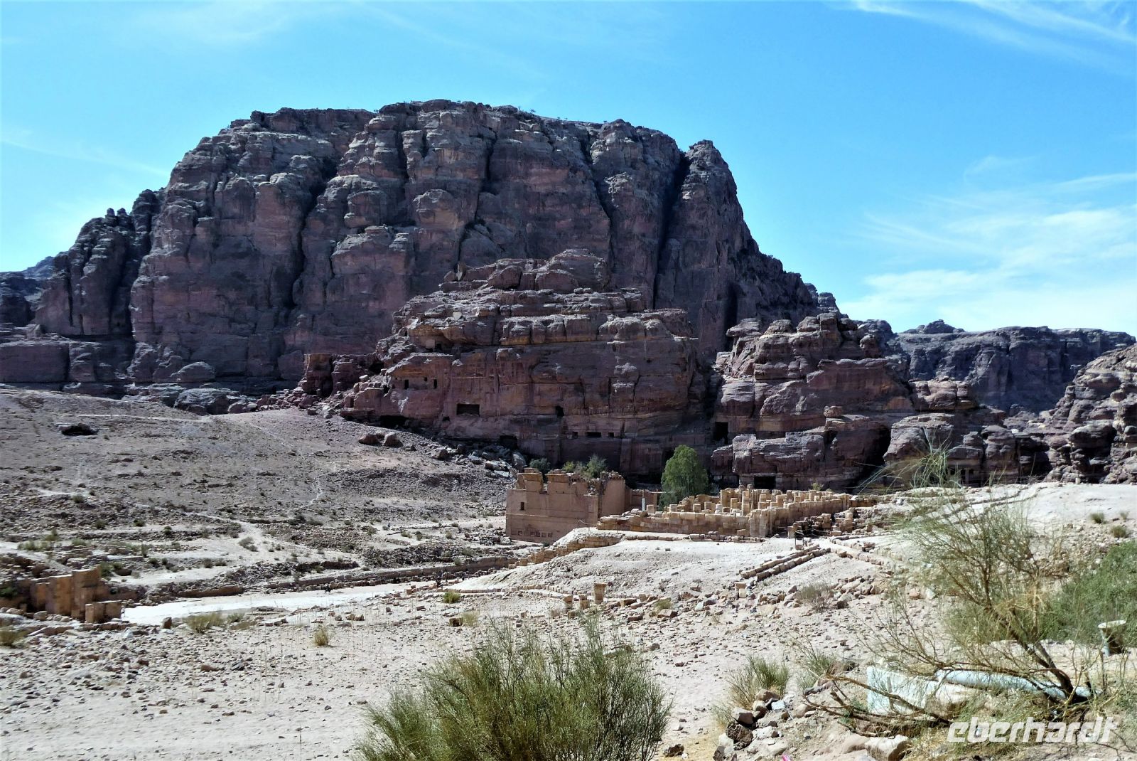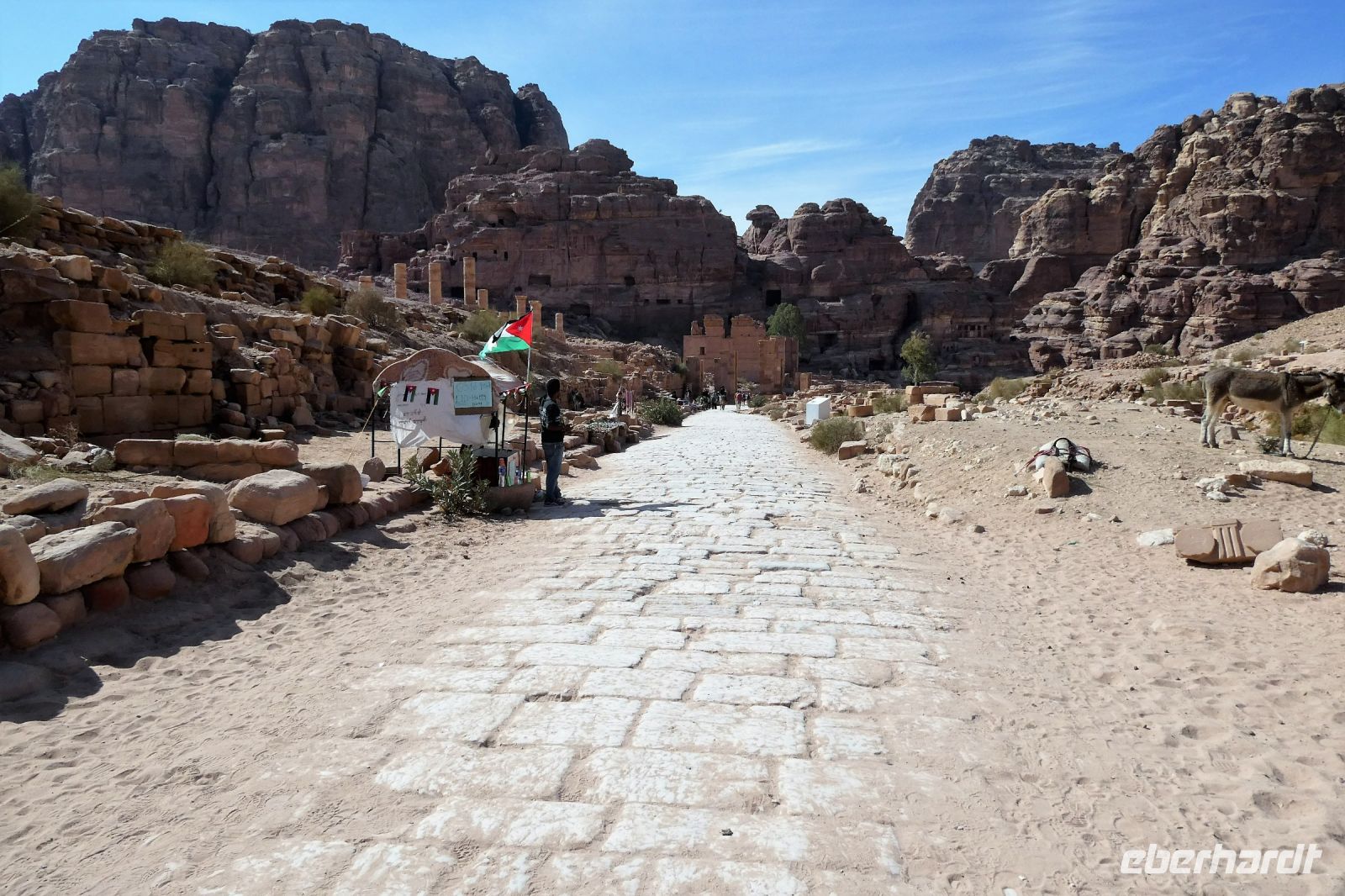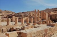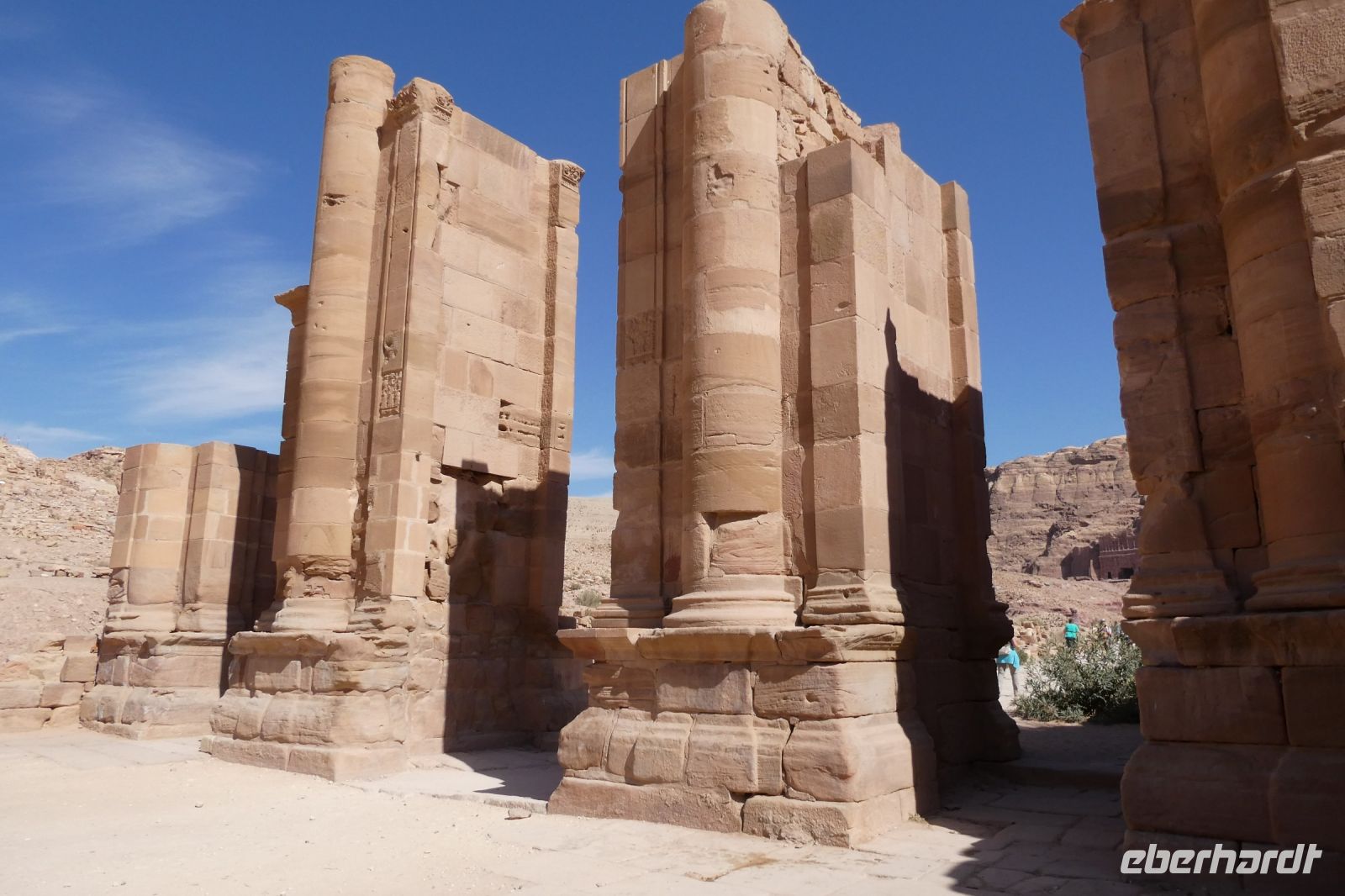 Von hier oben haben wir einen guten Blick auf den Cardo welcher die Hauptstraße von Petra war und auf den "großen Tempel" aus der römischen Epoche. Wir steigen hinab zu dem Tempel am Ende des Cardo, dem "Qasr al-Bint". Er wurde wohl zur selben Zeit wie das Schatzhaus errichtet, zur Zeit der Regentschaft des König Aretas, also zwischen 9 v.Chr. – 40 n.Chr. Er soll dem nabatäischen Hauptgott "Dushara" gewidmet sein. Der heilige Bezirk darf heute leider nicht mehr betreten werden, wahrscheinlich zum Schutz der Stätte. Wir sind beeindruckt von der Ausstrahlungskraft der Gebäude. Von hier weiter geht der Weg zum „Kloster Ed-Deir“, welches einige von uns morgen an dem 2. Tag besuchen wollen. Hier ist auch ein Parkplatz für Esel, die hier ihre Dienste (bzw. deren Besitzer) anbieten. Hier am "Qasr al-Bint" endet unsere heutige offizielle Führung und wir kehren individuell wieder in unser Hotel zurück. Jetzt am Nachmittag ist es ganz schön heiß hier in Petra und jeder freut sich sicher auf eine Dusche im Hotel und auf? ……..“Petra by night“ was die meisten aus der Gruppe individuell gebucht haben. Petra in der Nacht bei Kerzenlicht.