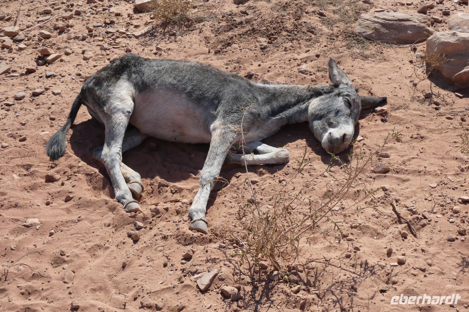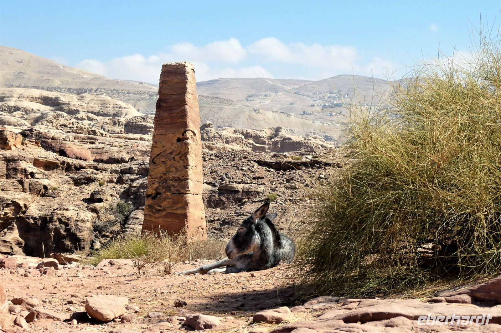Noch eine Kehre und wir sind bei den Obelisken angelangt. Ein Eselchen begrüßt uns um dann sofort in die Schlafstellung zu fallen. Er scheint sehr müde zu sein oder genießt einfach das süße Nichtstun.