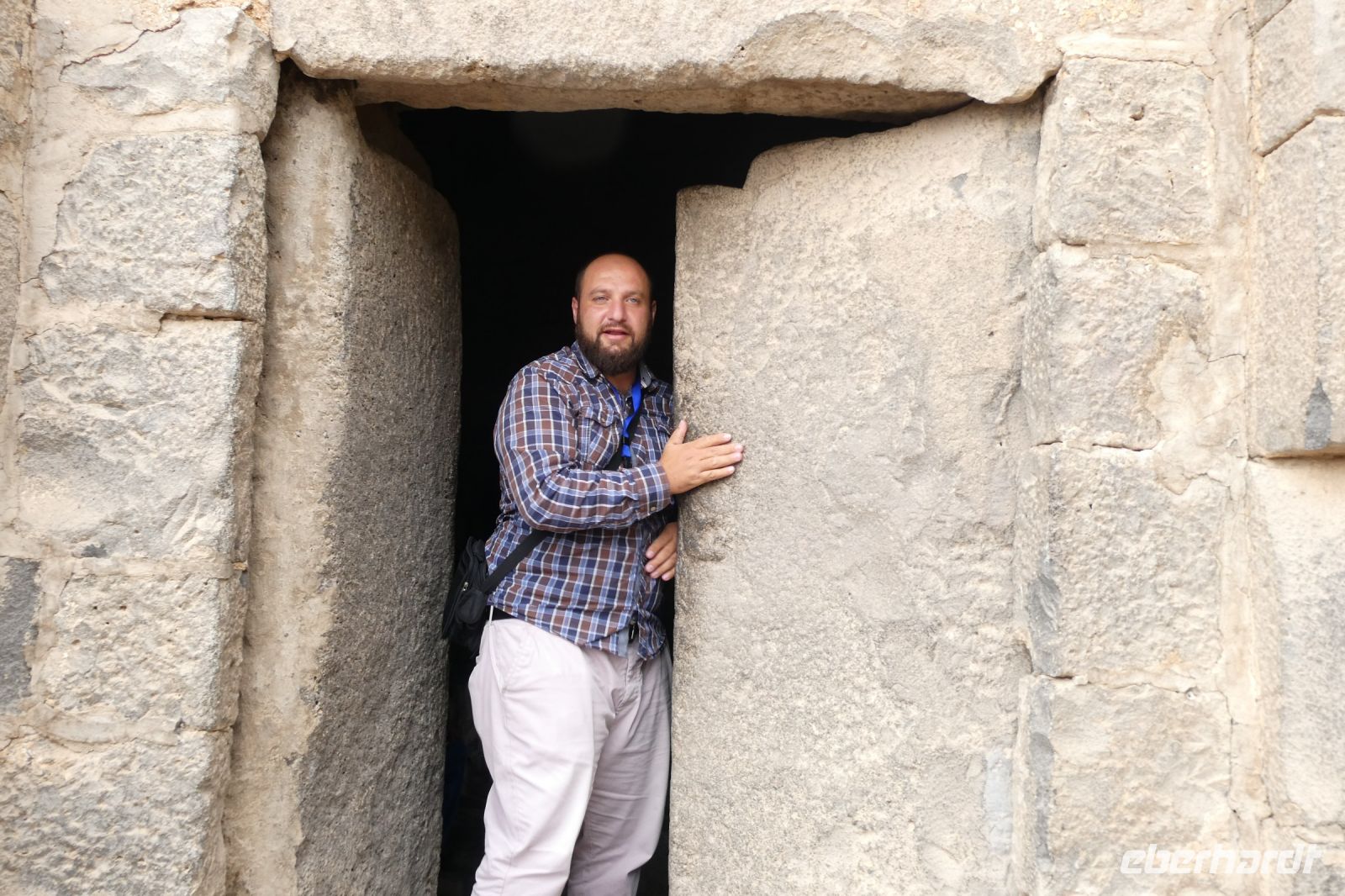 Wir gehen weiter und kommen in die römische Stadt. Als das römische Reich an Einfluss gewann wurde die Stadt romanisiert. Es entstanden ein Theater und mehrere Tempel. Zur byzantinischen Zeit kamen Kirchen hinzu und es wurde sogar eine in eine ehemalige Grabhöhle gebaut. Wir besichtigen diese, werfen einen Blick auf die Königsgräber. Wir besuchen eine ehemalige byzantinische Kirche, in der gerade heute ein wahrscheinlich von Reisenden angemeldeter christlicher Gottesdienst stattfindet.