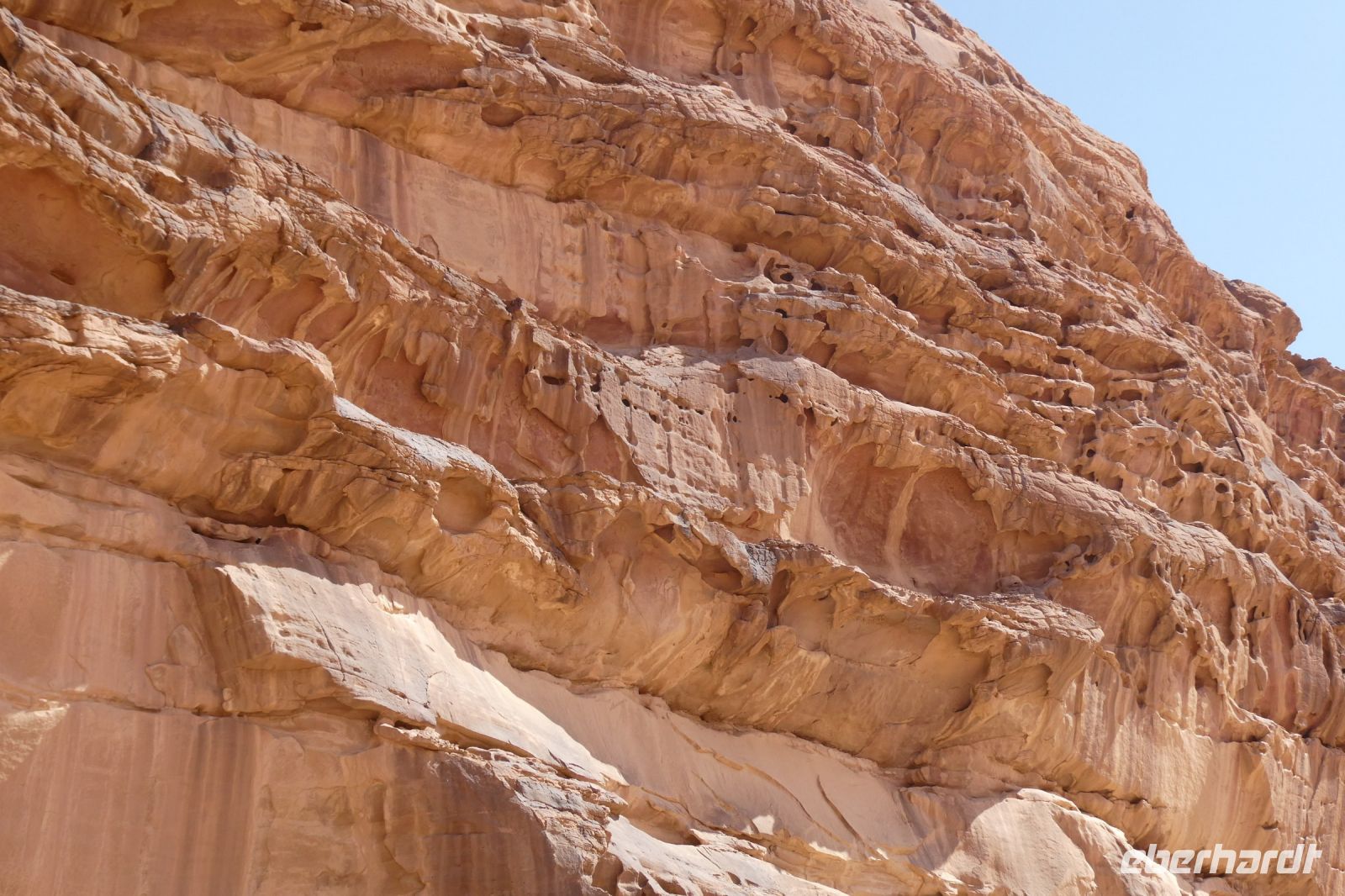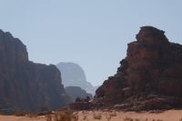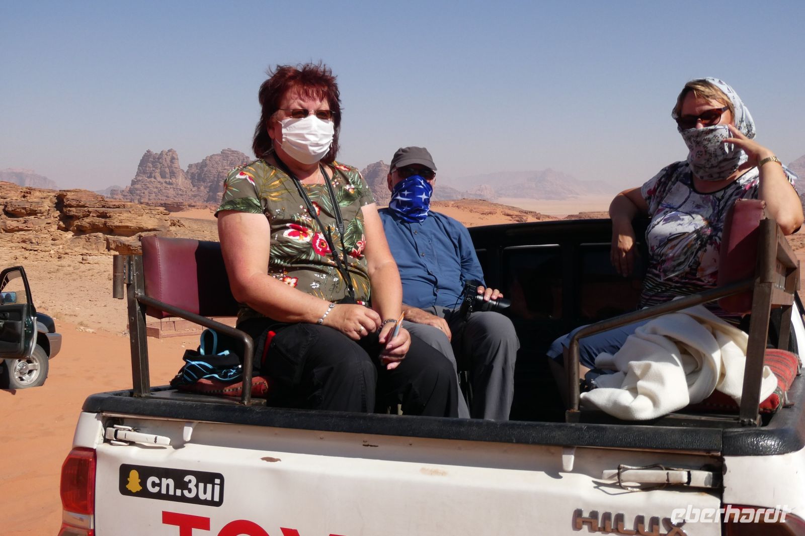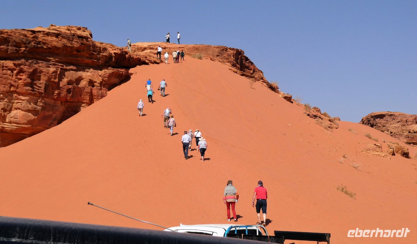 Nach einem kurzen Stopp im Besucherzentrum können wir unsere Jeeps besteigen, die von ansässigen Beduinen gefahren werden. Vorbei fahren wir an den sog. "Säulen der Weisheit" eine Felsformation die ihren Namen von dem berühmten Buch von T.E. Lawrence bekam. Er führte von hier den Aufstand der Araber und unternahm mit Ihnen Angriffe auf die "Hedjaz-Bahn", die berühmte Pilgerbahn von Damaskus nach Mekka, welche für den Truppennachschub der Osmanischen Armee genutzt wurde. Wir machen Halt an einer Sanddüne, welche die meisten von uns erklimmen. Von hier hat man wunderbaren Blick auf das Gebiet. Der Sand ist rot, was für einen hohen Eisenanteil spricht. In den Schuhen gibte es ihn gratis, deshalb ist barfußlaufen auf der Düne allemal besser.