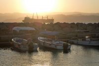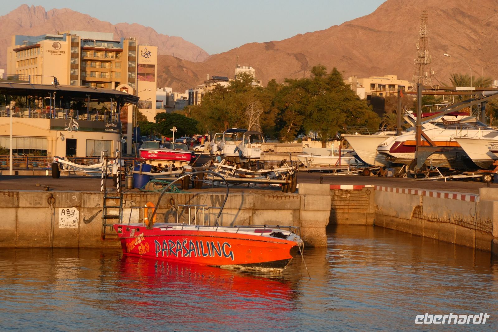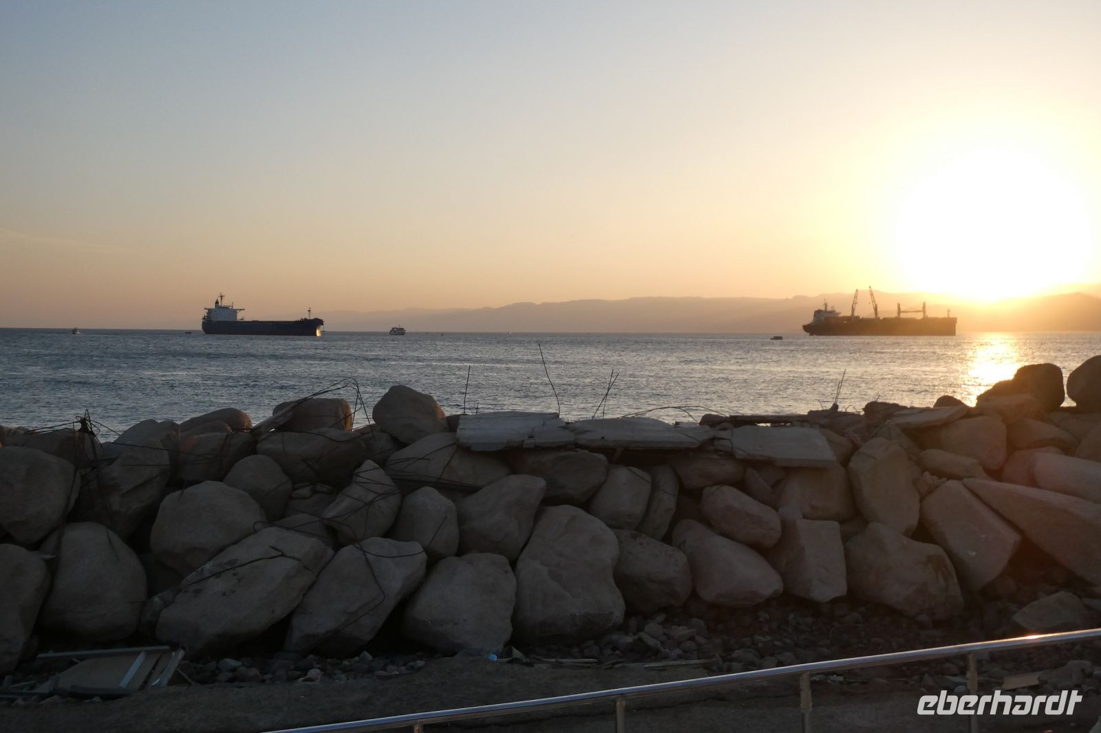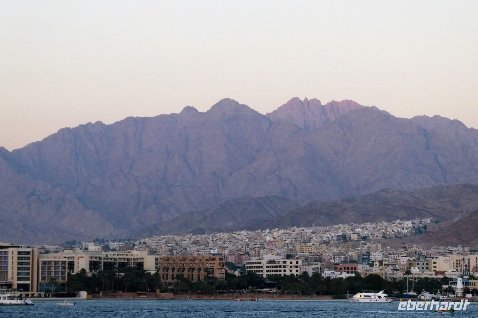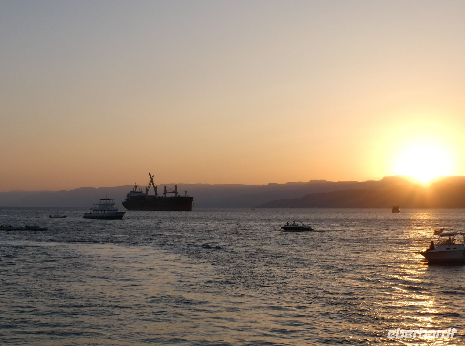 Frühzeitig sind wir in Aqaba und glücklicherweise können wir trotzdem im Hotel einchecken und unseren Weg zum Strand antreten. Was aber alle noch nicht wissen: an diesem Abend gibt es eine Überraschung, was Kareem und Gina ausgeheckt haben und die Agentur bewogen hat, der ersten Gruppe nach Corona ein besonderes Spektakel zu bieten: einen Sonnenuntergang auf dem Meer mit anschließendem auf Holzkohle gegrilltem Fisch (Dorade) und verschiedenen Salaten. Dazu den beliebten Zitronen/Minze Drink, welchen man in Jordanien an fast jedem Kiosk zubereitet bekommt. Mit zunehmender Dunkelheit erleuchten der Mond, die Sterne und die Lichter von Aqaba und auf der anderen Seite von Eilat in Israel. Die Stimmung ist friedlich und wunderschön. Wir haben das komplette Schiff für uns und können uns auf verschiedenen Decks bewegen. Dazu gibt es stimmungsvolle Musik. Das ist wirklich ein krönender Abschluss dieser wunderschönen Reise mit netten Menschen. Anschließend gehen wir noch in eine typische Bar von Aqaba mit Billiard und etwas Musikunterhaltung. Nicht weit entfernt ist unser Hotel zu sehen, in dem wir auch nach diesem schönen Abend in die Kissen sinken.