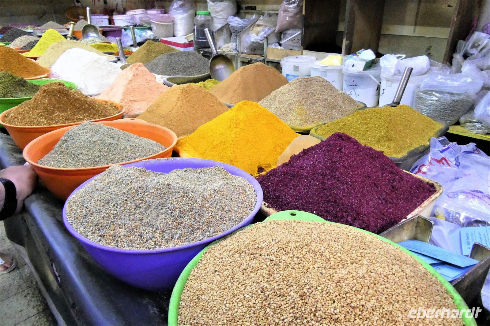 Unser letzter Tag hat begonnen. Bevor wir wieder in Richtung Amman nach Norden fahren wir noch zu einer Gewürzhandlung, die so früh schon geöffnet hat. Appetitlich sind die Gewürze angerichtet und schicken uns ihre Aromen entgegen. Da gibt es Zatargemische, Zitronensalz, Pfeffer und so ziemlich alles was man für ein gutes orientalisches Gericht benötigt, aber auch Weihrauch und andere geheimnisvolle Essenzen, deren Bedeutung sich uns nicht gleich erschließt. Aber alles wird erklärt und wir können kosten. Ein Orientale weiß, was Kunden wünschen: riechen, anfassen und kosten. Warum gibt es das so selten bei uns zuhause? Nun andere Länder andere Sitten.