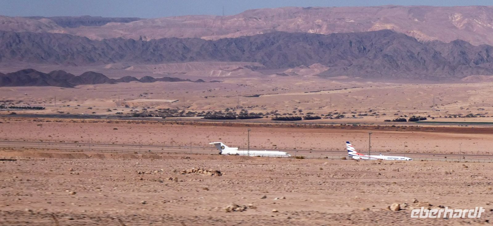 So zufrieden mit dem Tagesbeginn treten wir unsere Rückfahrt an. Wir kommen am Flughafen von Aqaba vorbei. Ganz in der Nähe auf der anderen Seite, wurde von den Israelis ebenfalls ein Flughafen errichtet.