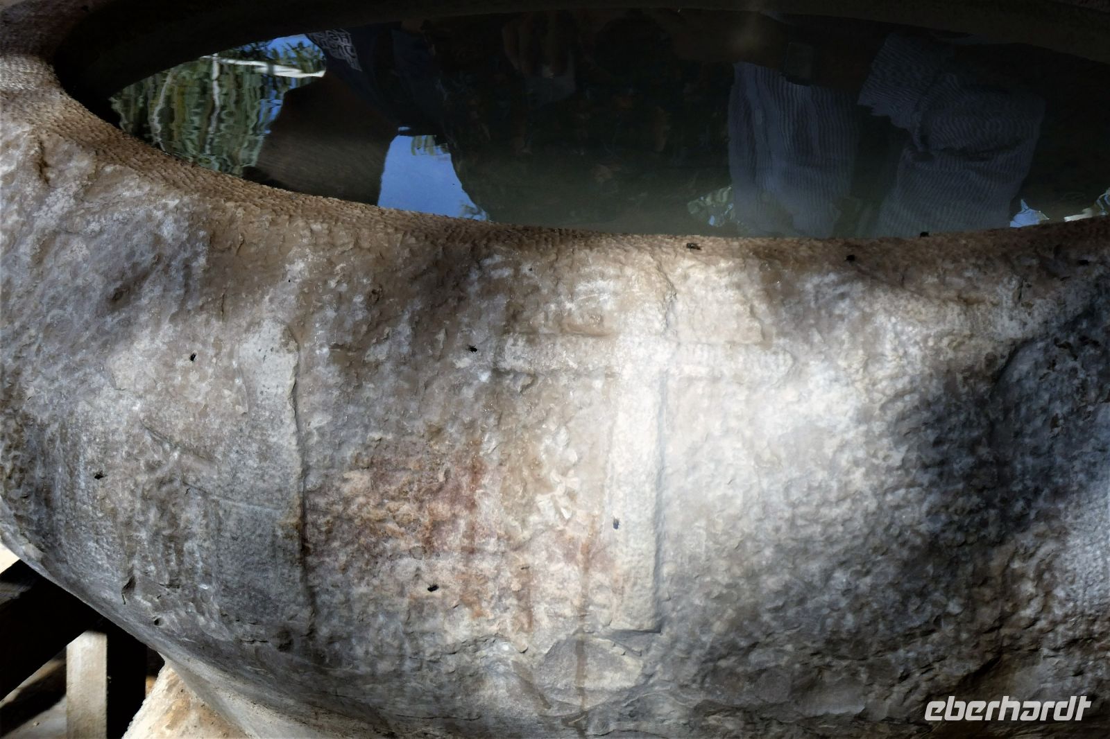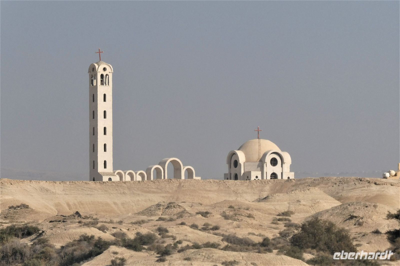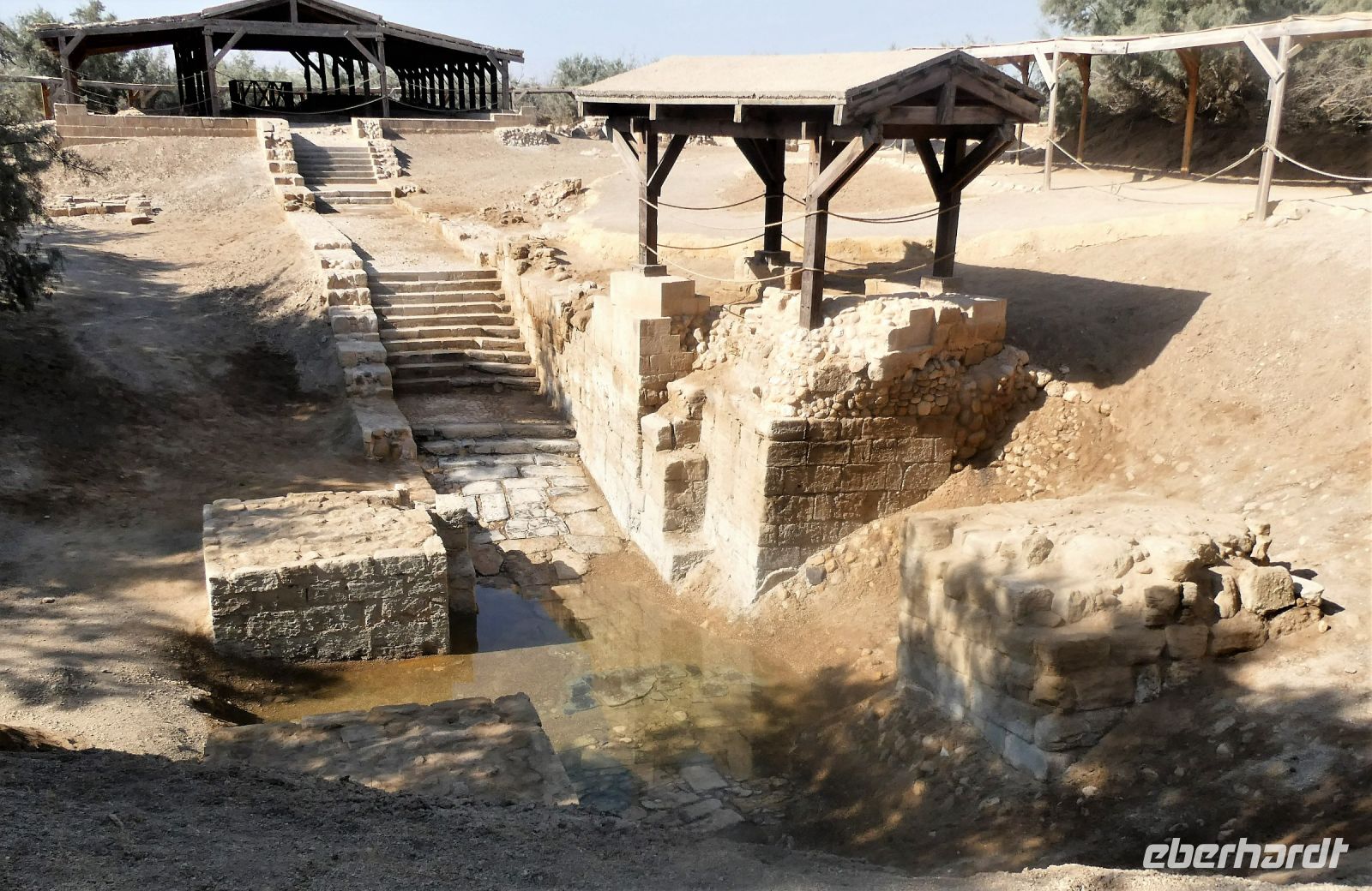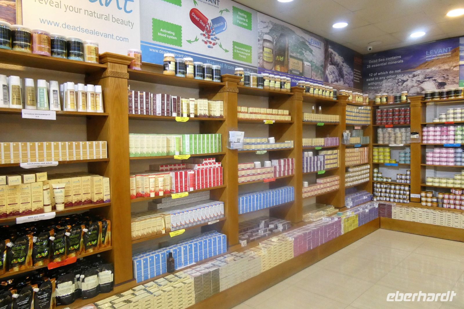 Und natürlich spielen diese Mineralien auch für die Gesundheit eine große Rolle. Bevor wir die gesundheitliche Wirksamkeit selber morgen überprüfen steht aber noch eine kulturelle Stätte in Jordanien auf dem Programm, den höchstwahrscheinlichen Taufplatz Jesu, den es eigentlich drei Mal gibt: am See Genezareth (am unwahrscheinlichsten), in Israel auf der von uns aus gesehen anderen Seite des Jordan, und die nach den Historikern wahrscheinlichste in Jordanien. Dort wollen wir jetzt hin. Die Sonne brennt als wir aussteigen. Wir unternehmen einen kleinen Rundgang und vor uns erblicken wir zahlreiche Kirchen welche von verschiedenen christlichen Kirchen hier errichtet wurden, der griechischen, russischen und weiteren orthodoxen Glaubensrichtungen, welche alle hier an diesem wichtigen Ort vertreten sein wollen. Hier fand man die Anlage einer Kirche und ein Taufbecken, in dem der Gläubige komplett untertauchen konnte und andere historische Hinweise zumindest auf eine alte religiöse Stätte, ob es Jesus war der hier getauft wurde? …. Nun, das kann man glauben, oder nicht! Nach diesem besinnlichen und heißen Rundgang gehen wir noch in ein Geschäft wo wir Produkte aus dem Toten Meer erstehen können. Kareem hat für uns noch Datteln organisiert und schmeißt eine Runde dieser gesunden süßen Frucht.