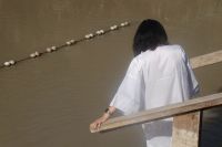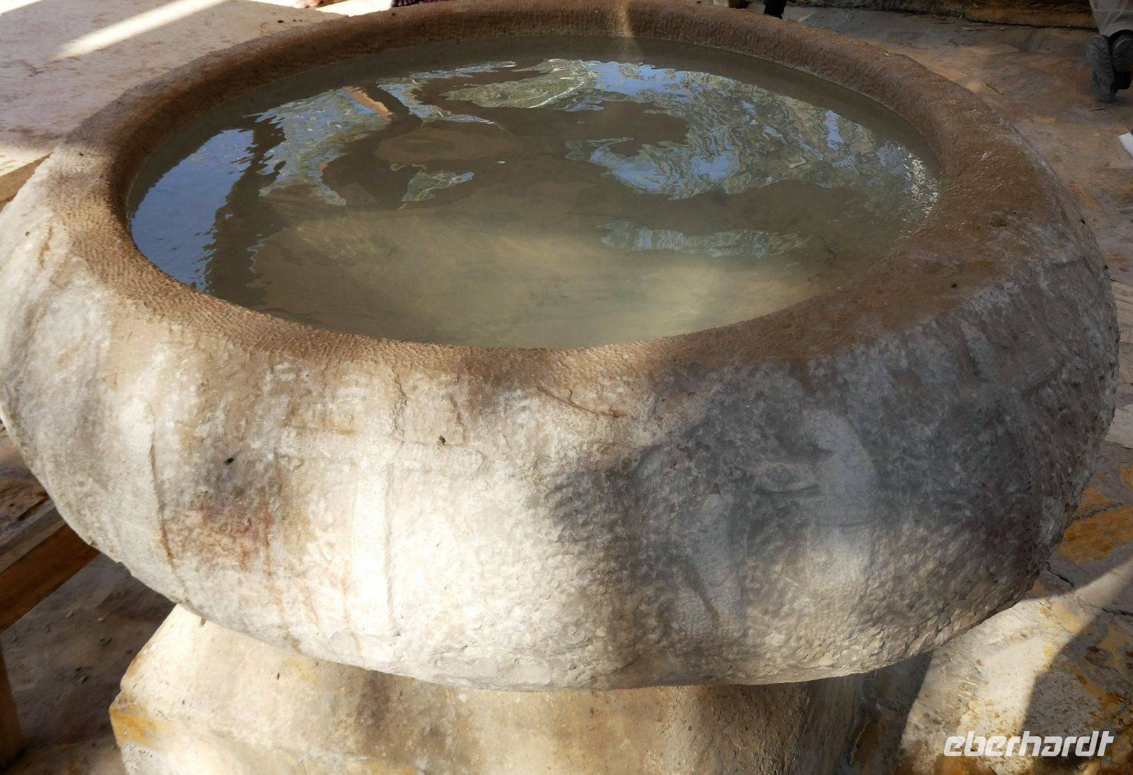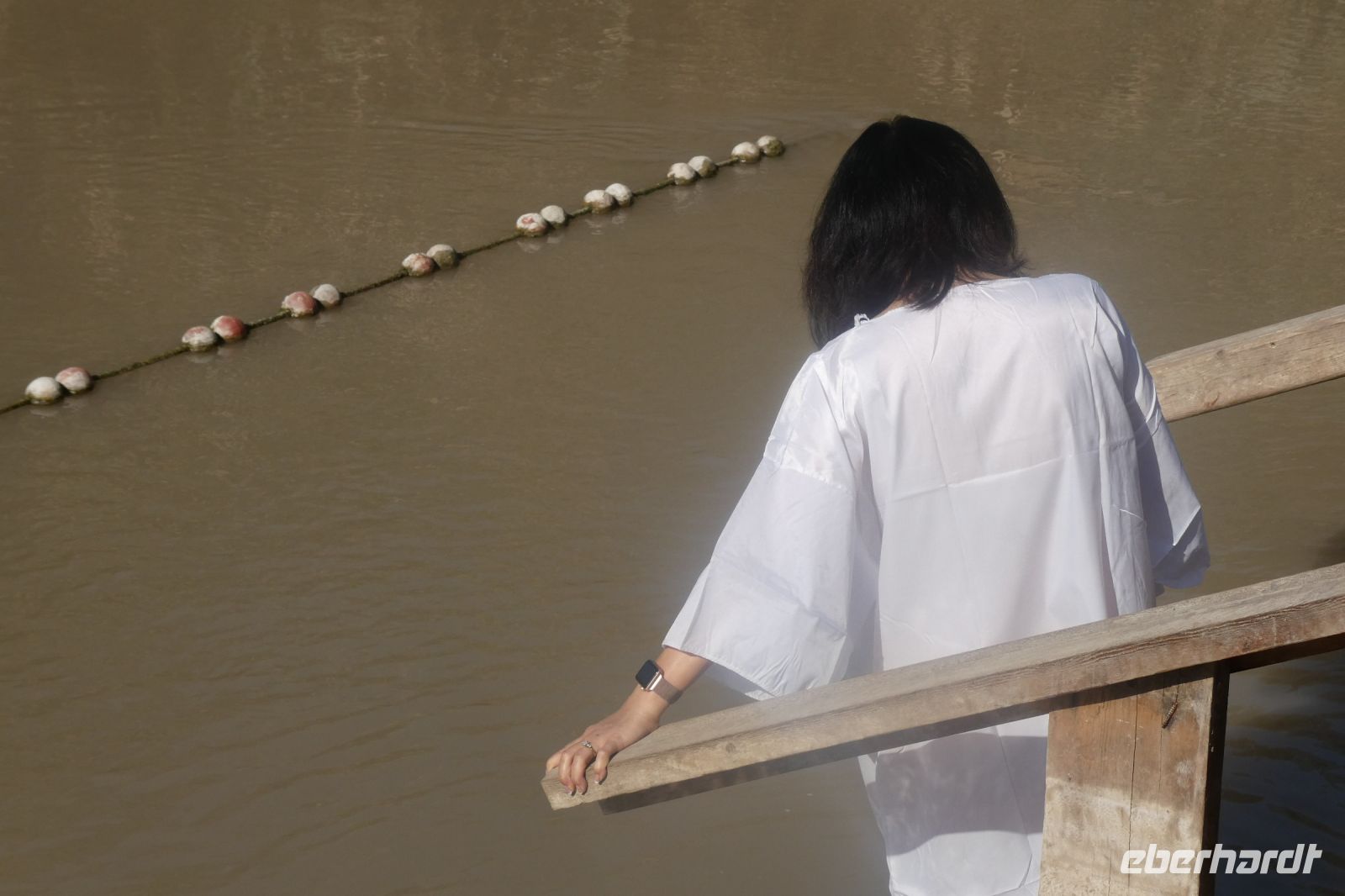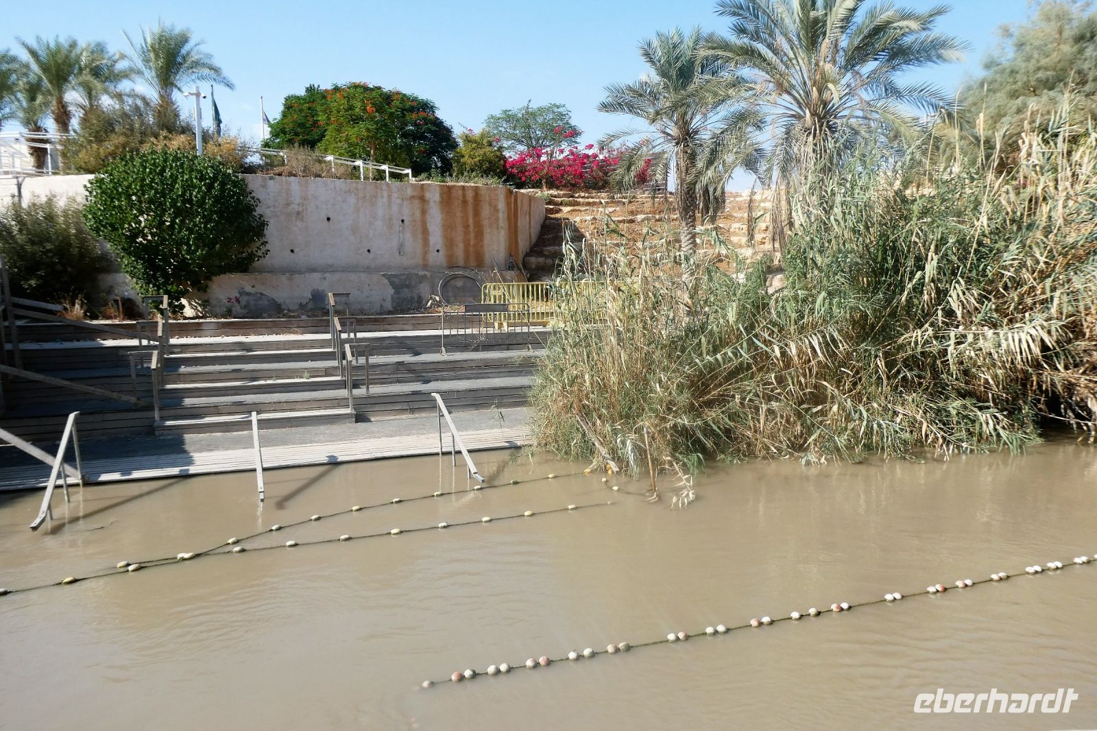 Und natürlich spielen diese Mineralien auch für die Gesundheit eine große Rolle. Bevor wir die gesundheitliche Wirksamkeit selber morgen überprüfen steht aber noch eine kulturelle Stätte in Jordanien auf dem Programm, den höchstwahrscheinlichen Taufplatz Jesu, den es eigentlich drei Mal gibt: am See Genezareth (am unwahrscheinlichsten), in Israel auf der von uns aus gesehen anderen Seite des Jordan, und die nach den Historikern wahrscheinlichste in Jordanien. Dort wollen wir jetzt hin. Die Sonne brennt als wir aussteigen. Wir unternehmen einen kleinen Rundgang und vor uns erblicken wir zahlreiche Kirchen welche von verschiedenen christlichen Kirchen hier errichtet wurden, der griechischen, russischen und weiteren orthodoxen Glaubensrichtungen, welche alle hier an diesem wichtigen Ort vertreten sein wollen. Hier fand man die Anlage einer Kirche und ein Taufbecken, in dem der Gläubige komplett untertauchen konnte und andere historische Hinweise zumindest auf eine alte religiöse Stätte, ob es Jesus war der hier getauft wurde? …. Nun, das kann man glauben, oder nicht! Nach diesem besinnlichen und heißen Rundgang gehen wir noch in ein Geschäft wo wir Produkte aus dem Toten Meer erstehen können. Kareem hat für uns noch Datteln organisiert und schmeißt eine Runde dieser gesunden süßen Frucht.