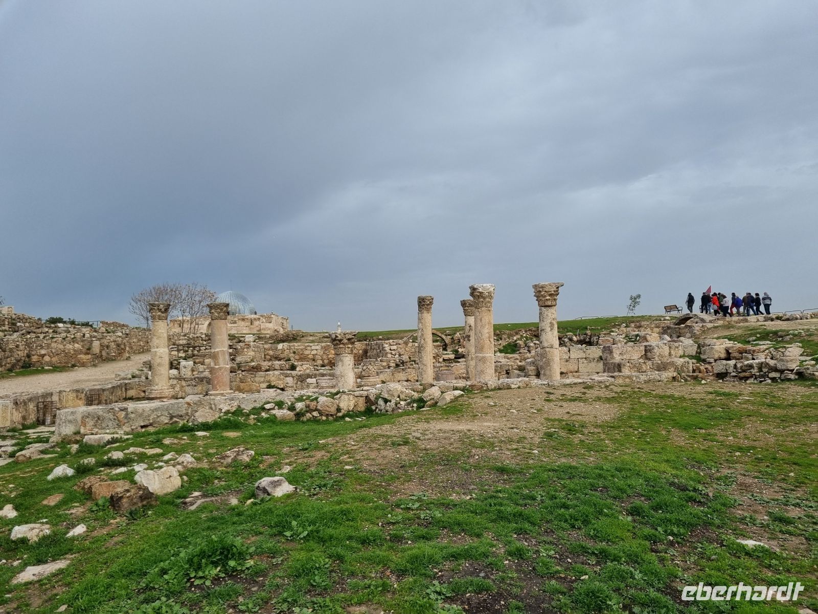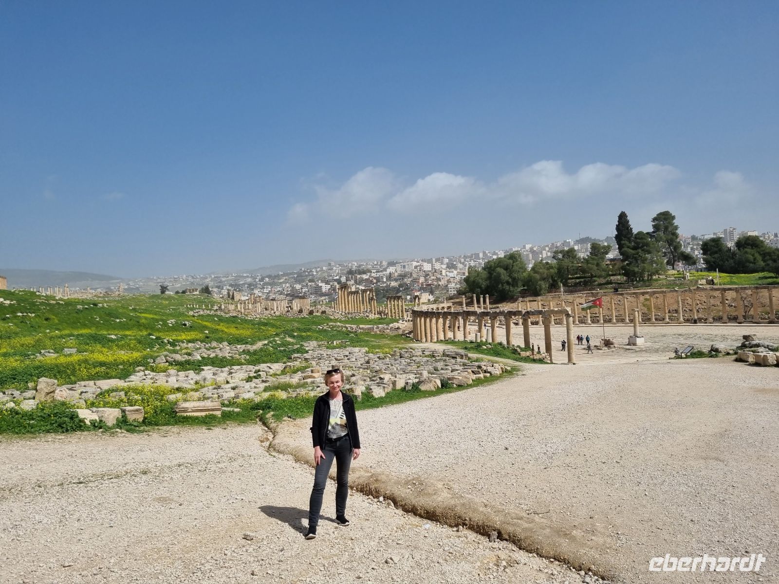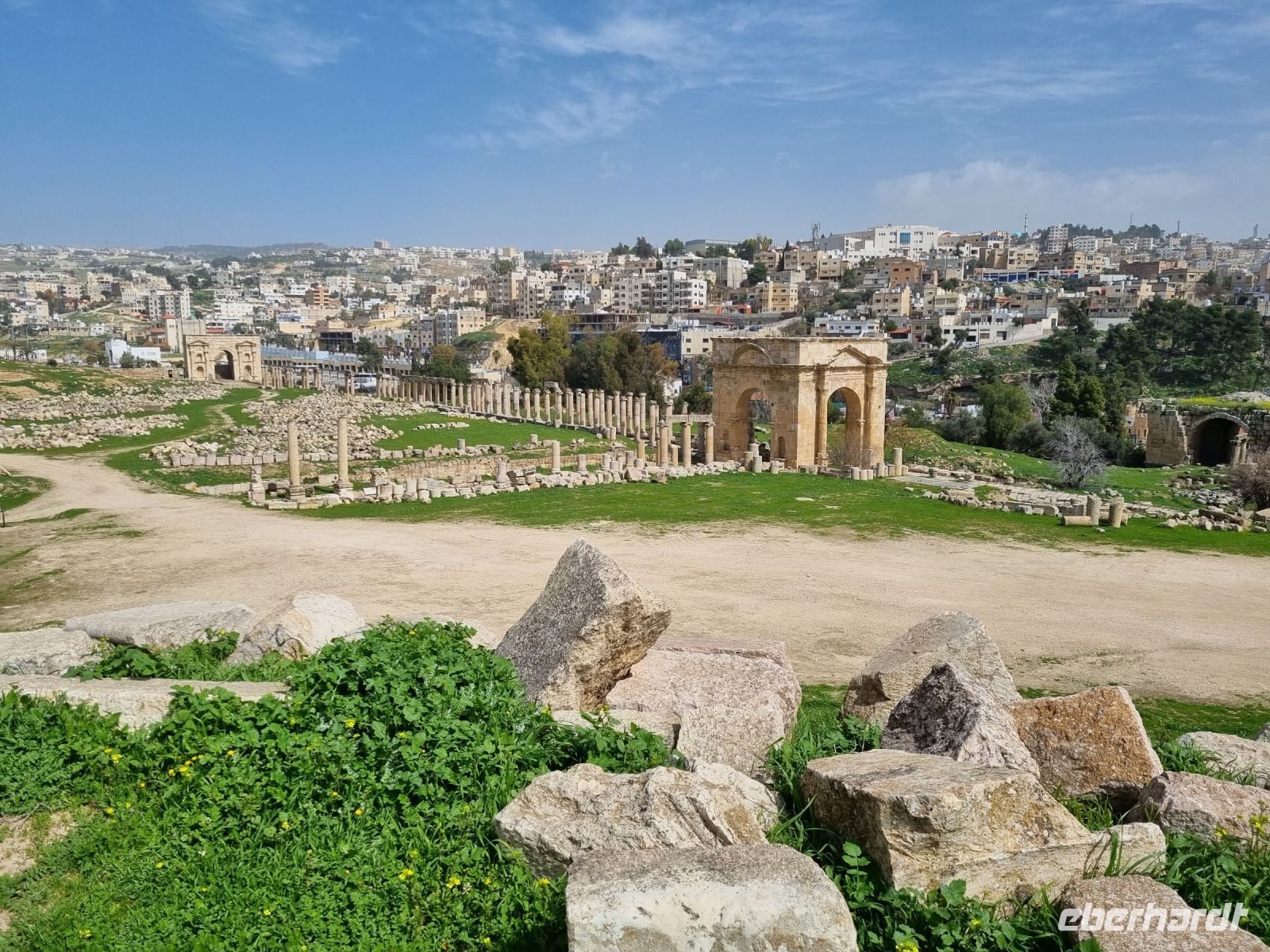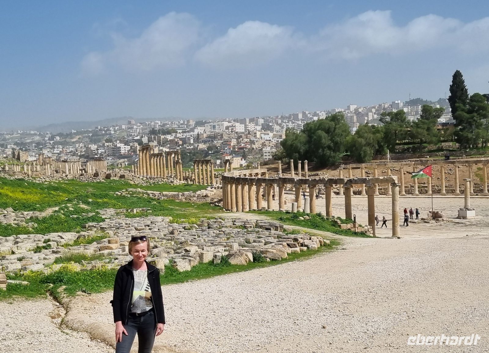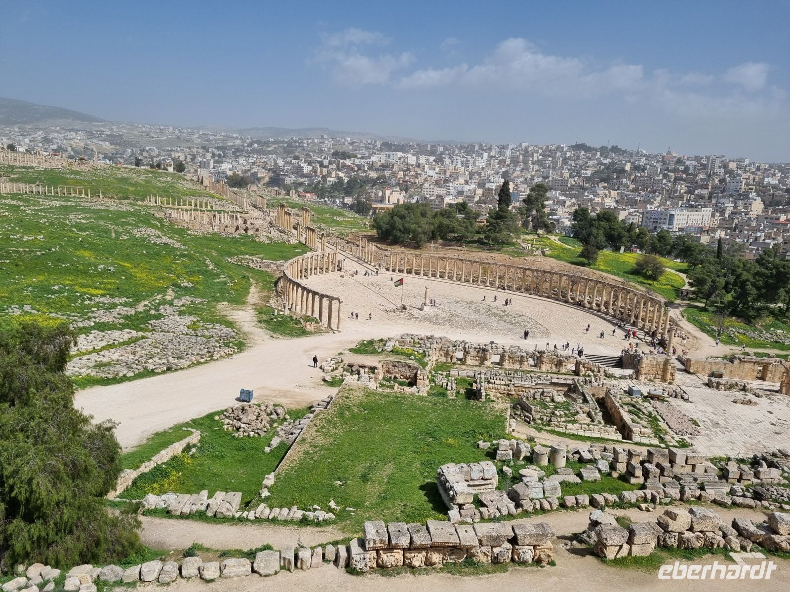 Heute ging es mit dem Bus gen Norden. Der Kontrast zum gestrigen Tag war deutlich spürbar, denn wir fuhren durch saftig grüne und hügelige Landschaften vorbei an unzähligen Steineichen-Naturwäldern bzw. Olivenhainen zunächst nach Ajlun. Hier ist es feuchter als im Rest des Landes und es fällt im Winter auch oft Schnee. Wir besuchten die oberhalb der kleinen Stadt Ajlun gelegene islamische Burg, welche im 12. Jahrhundert errichtet wurde, um die Gegend vor den Kreuzfahrer zu sichern. Bauherr war ein Neffe des großen Sultans Saladin, Izz ed-Din Usama. Genutzt hat man die Festung allerdings nie, denn bereits drei Jahre nach ihrer Fertigstellung wurden das Kreuzfahrerheer 1187 in der Schlacht bei Hittin geschlagen. Die Kreuzfahrer bezeichnet man hier übrigens nicht als solche, sondern man nennt sie Franken. Nach einer weiteren ca. 1-stündigen Fahrt erreichten wir Jerash mit der bedeutendsten römischen Ausgrabungsstätte auf jordanischem Gebiet. Kaiser Hadrian rühmte sie "als die Stadt, die alle Schönheiten in sich vereint". Und so ließ er sich auch gleich einen Triumphbogen bauen und dazu ein Hippodrom, eine Pferderennbahn. Wir traten am Südtor in die Stadt ein und gelangten als erstes zum von Säulen umrahmten ovalen Platz, welcher so genannt wird, weil er nicht rund ist. Später erreichten wir das Südtheater, welches sich neben dem Zeus-Tempel befindet. Selten hat man in einer römisch-antiken Stätte noch so viele aufrechtstehende Säulen gesehen - echt beeindruckend! Wir setzten unsere Entdeckungstour fort und besuchten u. a. auch das Nordtheater, den Artemis-Tempel und gelangten über die gepflasterte Hauptstraße des riesigen Geländes zu unserem Ausgangspunkt zurück. Tief beeindruckt machten wir uns anschließend zum nahe gelegenen Restaurant "Artemis" auf, um uns dort mit kulinarischen arabischen Köstlichkeiten zu stärken. Hier konnten wir sogar zuschauen, wie unser Brot in einem traditionellen arabischen Lehmofen gebacken wurde, bevor es direkt vom Feuer noch warm auf den Tellern ankam - ein echter Gaumenschmaus! Am Nachmittag kehrten wir schließlich nach Amman zurück.