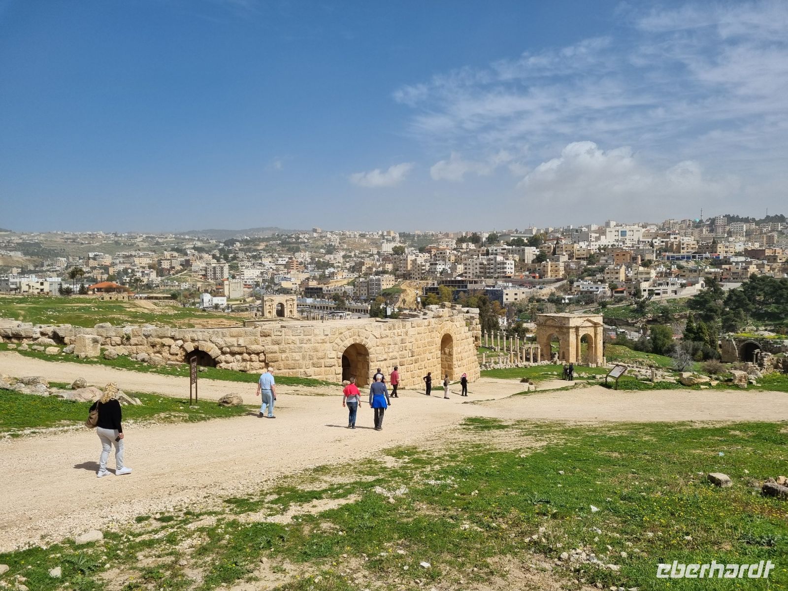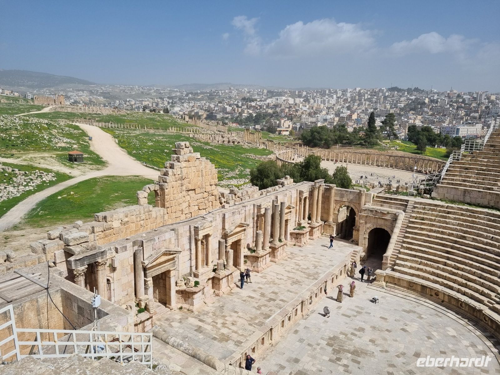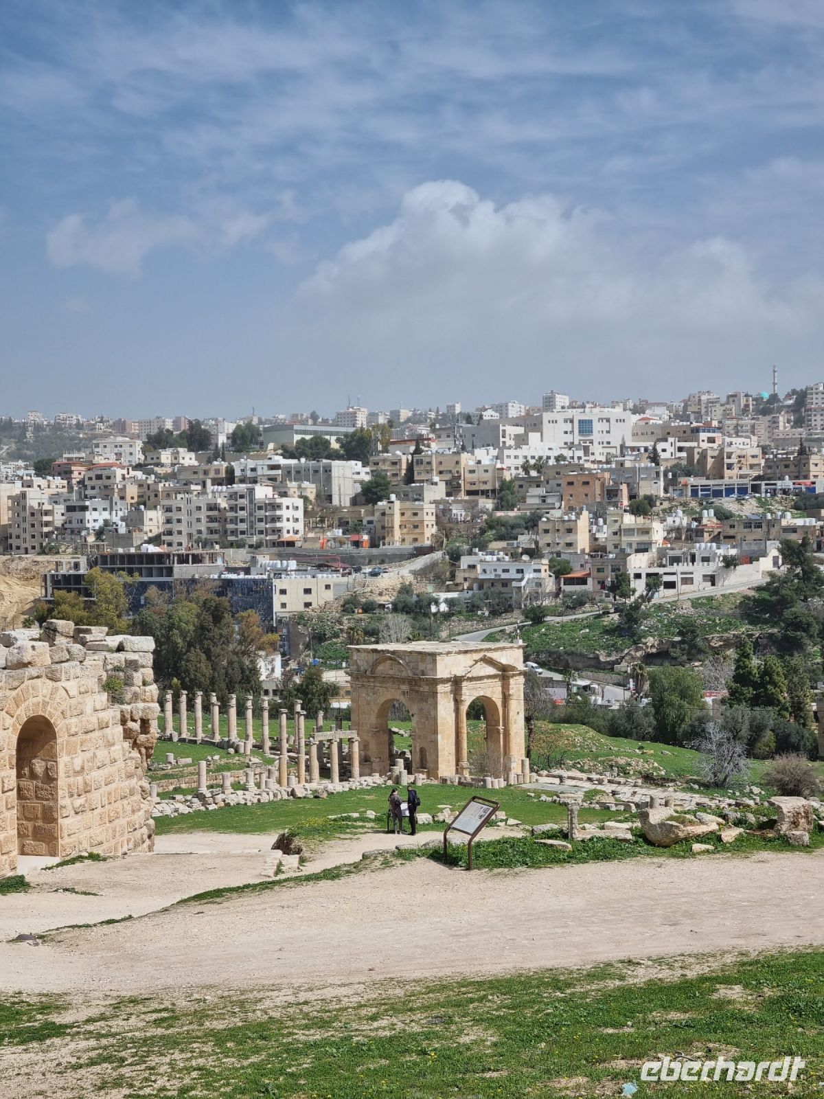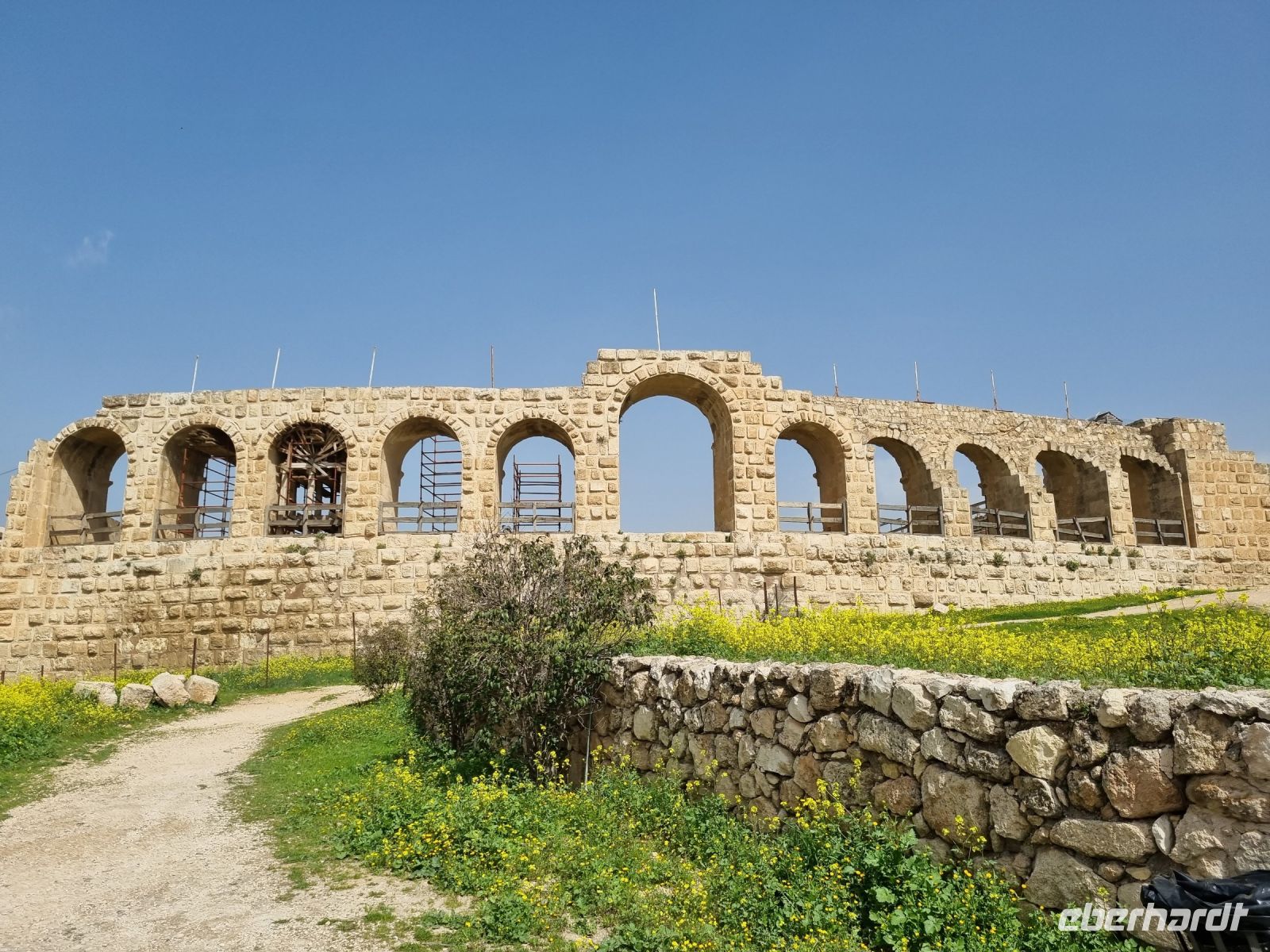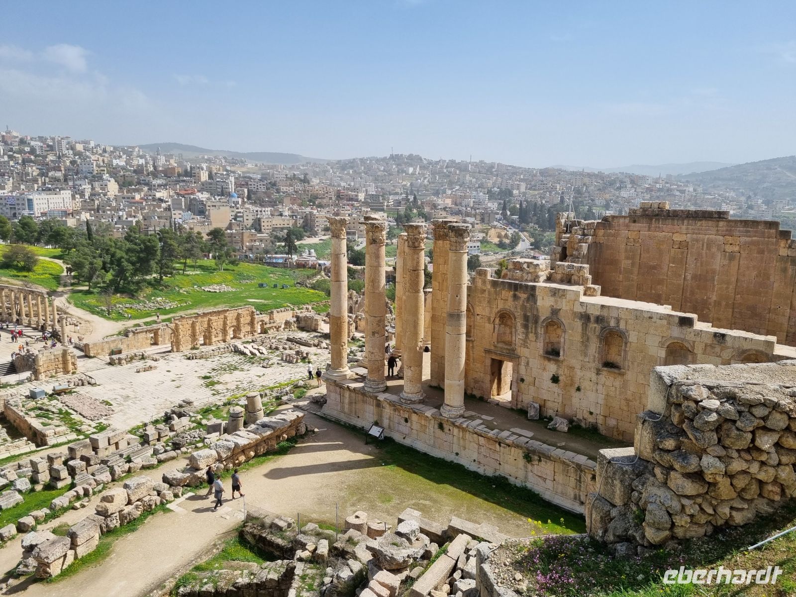 Heute ging es mit dem Bus gen Norden. Der Kontrast zum gestrigen Tag war deutlich spürbar, denn wir fuhren durch saftig grüne und hügelige Landschaften vorbei an unzähligen Steineichen-Naturwäldern bzw. Olivenhainen zunächst nach Ajlun. Hier ist es feuchter als im Rest des Landes und es fällt im Winter auch oft Schnee. Wir besuchten die oberhalb der kleinen Stadt Ajlun gelegene islamische Burg, welche im 12. Jahrhundert errichtet wurde, um die Gegend vor den Kreuzfahrer zu sichern. Bauherr war ein Neffe des großen Sultans Saladin, Izz ed-Din Usama. Genutzt hat man die Festung allerdings nie, denn bereits drei Jahre nach ihrer Fertigstellung wurden das Kreuzfahrerheer 1187 in der Schlacht bei Hittin geschlagen. Die Kreuzfahrer bezeichnet man hier übrigens nicht als solche, sondern man nennt sie Franken. Nach einer weiteren ca. 1-stündigen Fahrt erreichten wir Jerash mit der bedeutendsten römischen Ausgrabungsstätte auf jordanischem Gebiet. Kaiser Hadrian rühmte sie "als die Stadt, die alle Schönheiten in sich vereint". Und so ließ er sich auch gleich einen Triumphbogen bauen und dazu ein Hippodrom, eine Pferderennbahn. Wir traten am Südtor in die Stadt ein und gelangten als erstes zum von Säulen umrahmten ovalen Platz, welcher so genannt wird, weil er nicht rund ist. Später erreichten wir das Südtheater, welches sich neben dem Zeus-Tempel befindet. Selten hat man in einer römisch-antiken Stätte noch so viele aufrechtstehende Säulen gesehen - echt beeindruckend! Wir setzten unsere Entdeckungstour fort und besuchten u. a. auch das Nordtheater, den Artemis-Tempel und gelangten über die gepflasterte Hauptstraße des riesigen Geländes zu unserem Ausgangspunkt zurück. Tief beeindruckt machten wir uns anschließend zum nahe gelegenen Restaurant "Artemis" auf, um uns dort mit kulinarischen arabischen Köstlichkeiten zu stärken. Hier konnten wir sogar zuschauen, wie unser Brot in einem traditionellen arabischen Lehmofen gebacken wurde, bevor es direkt vom Feuer noch warm auf den Tellern ankam - ein echter Gaumenschmaus! Am Nachmittag kehrten wir schließlich nach Amman zurück.