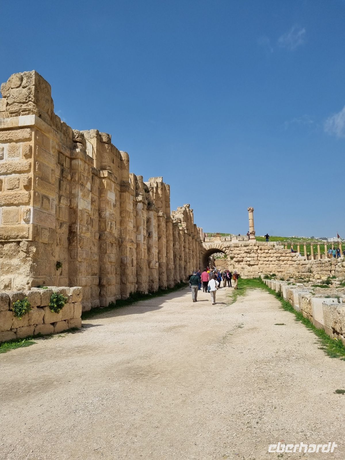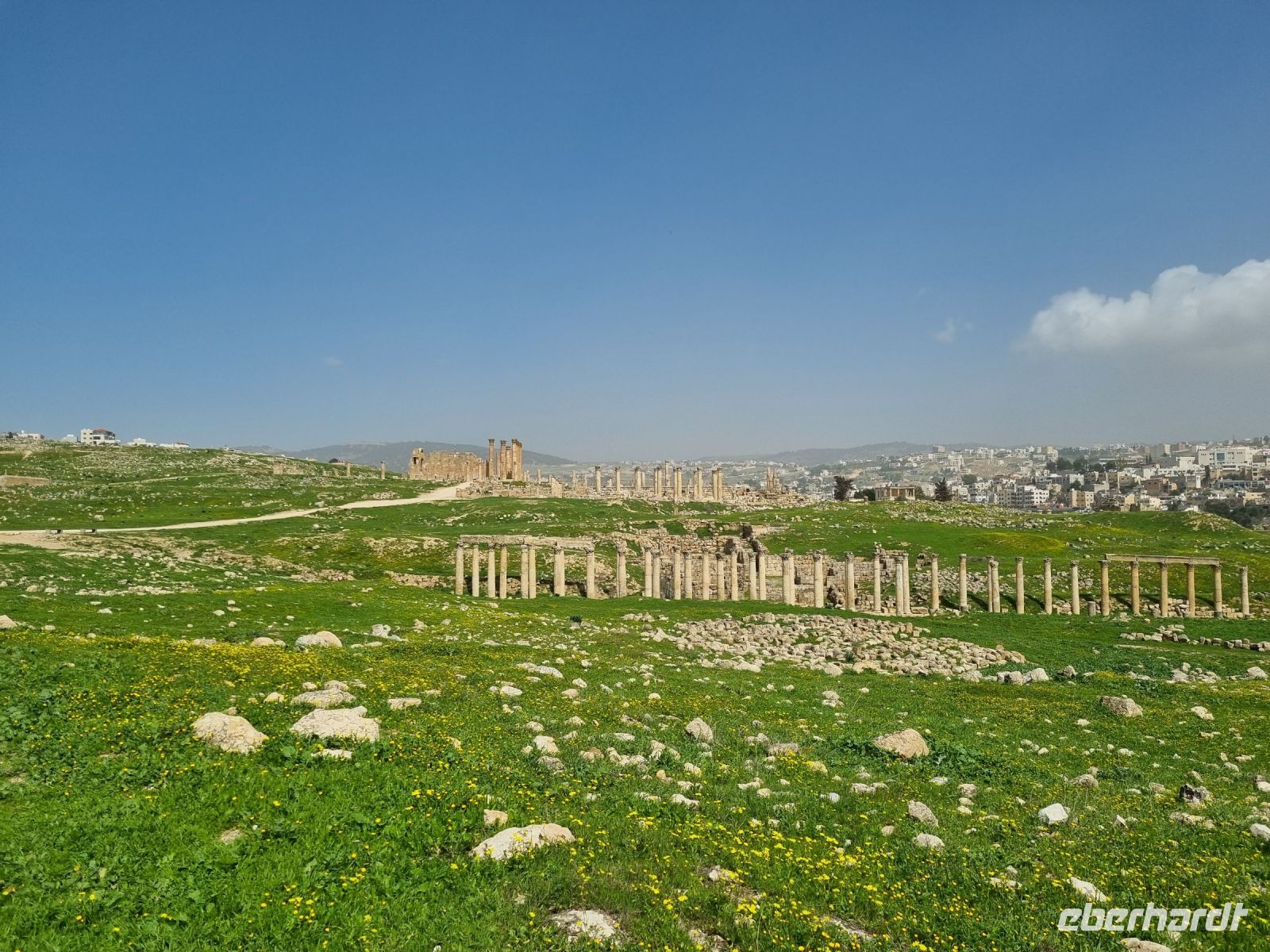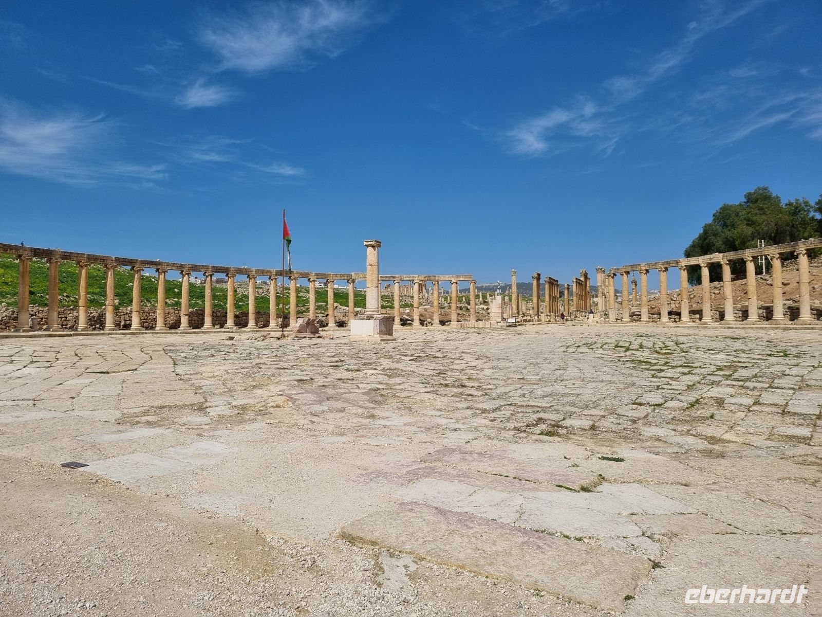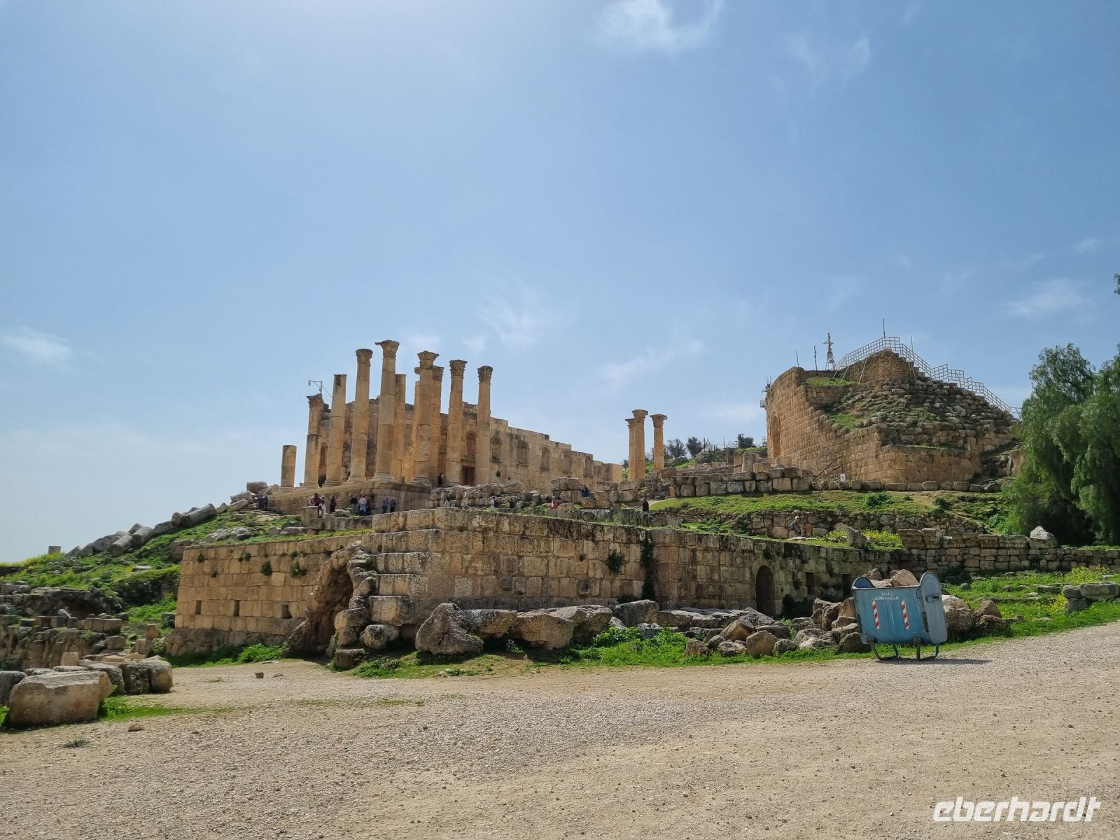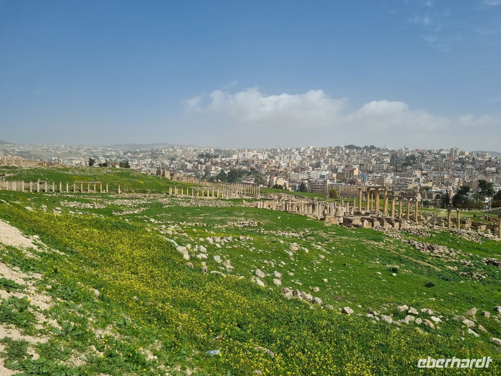 Heute ging es mit dem Bus gen Norden. Der Kontrast zum gestrigen Tag war deutlich spürbar, denn wir fuhren durch saftig grüne und hügelige Landschaften vorbei an unzähligen Steineichen-Naturwäldern bzw. Olivenhainen zunächst nach Ajlun. Hier ist es feuchter als im Rest des Landes und es fällt im Winter auch oft Schnee. Wir besuchten die oberhalb der kleinen Stadt Ajlun gelegene islamische Burg, welche im 12. Jahrhundert errichtet wurde, um die Gegend vor den Kreuzfahrer zu sichern. Bauherr war ein Neffe des großen Sultans Saladin, Izz ed-Din Usama. Genutzt hat man die Festung allerdings nie, denn bereits drei Jahre nach ihrer Fertigstellung wurden das Kreuzfahrerheer 1187 in der Schlacht bei Hittin geschlagen. Die Kreuzfahrer bezeichnet man hier übrigens nicht als solche, sondern man nennt sie Franken. Nach einer weiteren ca. 1-stündigen Fahrt erreichten wir Jerash mit der bedeutendsten römischen Ausgrabungsstätte auf jordanischem Gebiet. Kaiser Hadrian rühmte sie "als die Stadt, die alle Schönheiten in sich vereint". Und so ließ er sich auch gleich einen Triumphbogen bauen und dazu ein Hippodrom, eine Pferderennbahn. Wir traten am Südtor in die Stadt ein und gelangten als erstes zum von Säulen umrahmten ovalen Platz, welcher so genannt wird, weil er nicht rund ist. Später erreichten wir das Südtheater, welches sich neben dem Zeus-Tempel befindet. Selten hat man in einer römisch-antiken Stätte noch so viele aufrechtstehende Säulen gesehen - echt beeindruckend! Wir setzten unsere Entdeckungstour fort und besuchten u. a. auch das Nordtheater, den Artemis-Tempel und gelangten über die gepflasterte Hauptstraße des riesigen Geländes zu unserem Ausgangspunkt zurück. Tief beeindruckt machten wir uns anschließend zum nahe gelegenen Restaurant "Artemis" auf, um uns dort mit kulinarischen arabischen Köstlichkeiten zu stärken. Hier konnten wir sogar zuschauen, wie unser Brot in einem traditionellen arabischen Lehmofen gebacken wurde, bevor es direkt vom Feuer noch warm auf den Tellern ankam - ein echter Gaumenschmaus! Am Nachmittag kehrten wir schließlich nach Amman zurück.