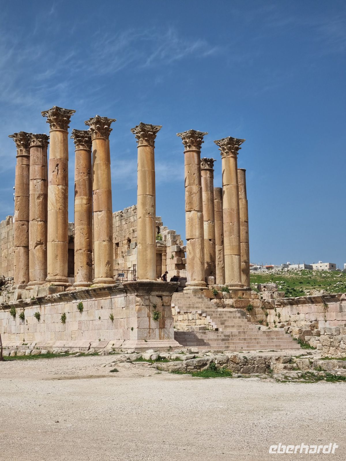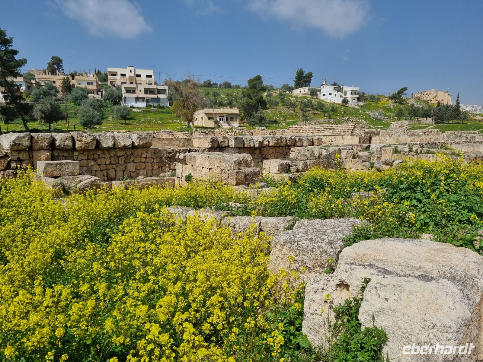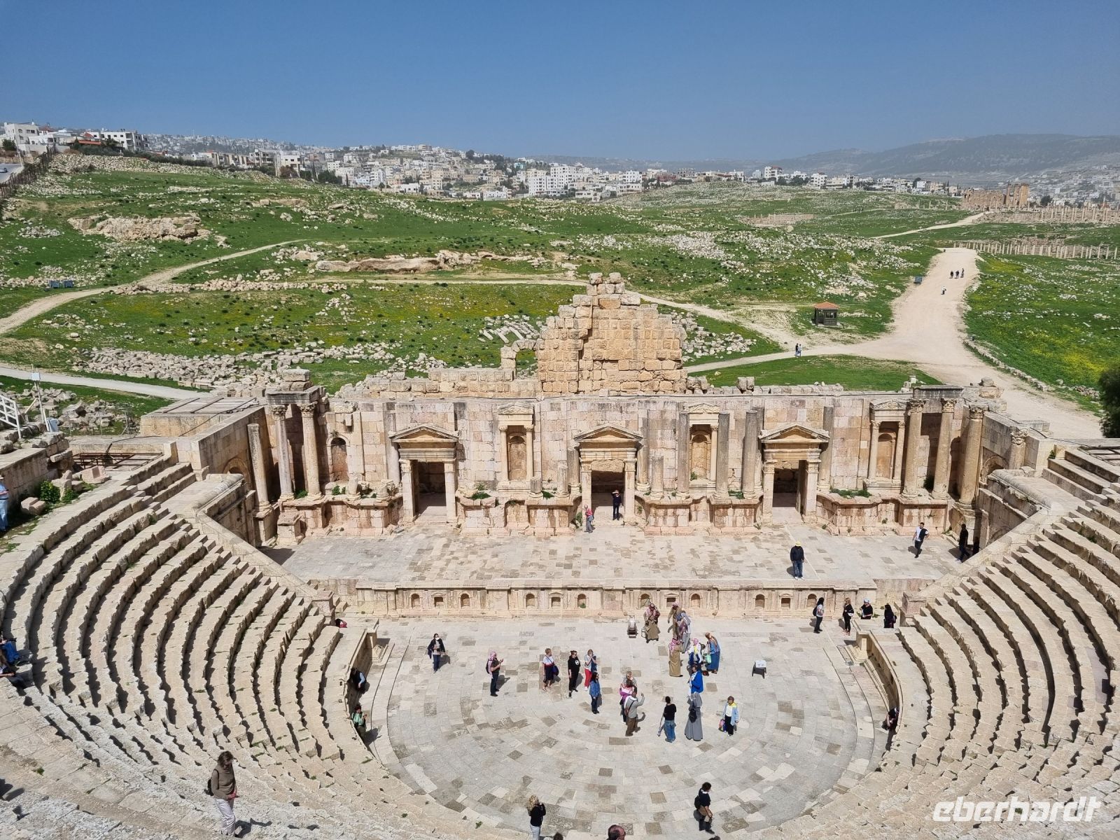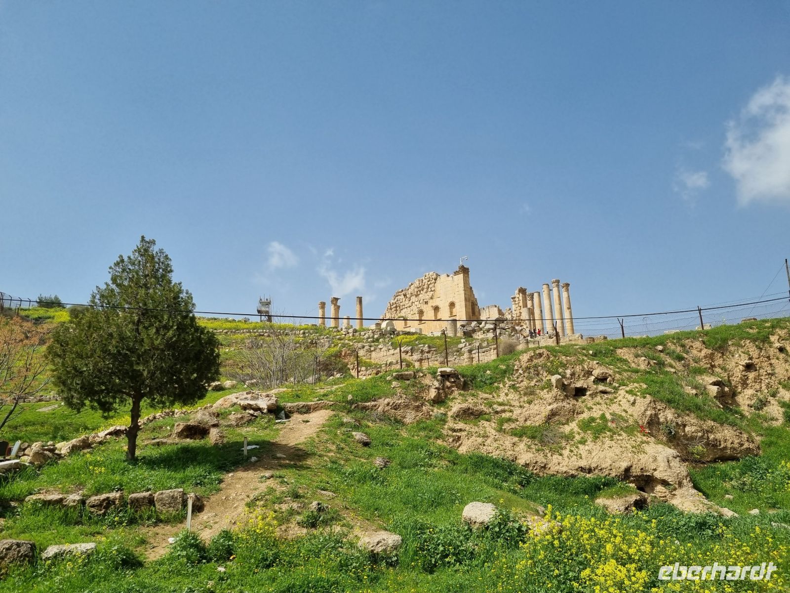 Heute ging es mit dem Bus gen Norden. Der Kontrast zum gestrigen Tag war deutlich spürbar, denn wir fuhren durch saftig grüne und hügelige Landschaften vorbei an unzähligen Steineichen-Naturwäldern bzw. Olivenhainen zunächst nach Ajlun. Hier ist es feuchter als im Rest des Landes und es fällt im Winter auch oft Schnee. Wir besuchten die oberhalb der kleinen Stadt Ajlun gelegene islamische Burg, welche im 12. Jahrhundert errichtet wurde, um die Gegend vor den Kreuzfahrer zu sichern. Bauherr war ein Neffe des großen Sultans Saladin, Izz ed-Din Usama. Genutzt hat man die Festung allerdings nie, denn bereits drei Jahre nach ihrer Fertigstellung wurden das Kreuzfahrerheer 1187 in der Schlacht bei Hittin geschlagen. Die Kreuzfahrer bezeichnet man hier übrigens nicht als solche, sondern man nennt sie Franken. Nach einer weiteren ca. 1-stündigen Fahrt erreichten wir Jerash mit der bedeutendsten römischen Ausgrabungsstätte auf jordanischem Gebiet. Kaiser Hadrian rühmte sie "als die Stadt, die alle Schönheiten in sich vereint". Und so ließ er sich auch gleich einen Triumphbogen bauen und dazu ein Hippodrom, eine Pferderennbahn. Wir traten am Südtor in die Stadt ein und gelangten als erstes zum von Säulen umrahmten ovalen Platz, welcher so genannt wird, weil er nicht rund ist. Später erreichten wir das Südtheater, welches sich neben dem Zeus-Tempel befindet. Selten hat man in einer römisch-antiken Stätte noch so viele aufrechtstehende Säulen gesehen - echt beeindruckend! Wir setzten unsere Entdeckungstour fort und besuchten u. a. auch das Nordtheater, den Artemis-Tempel und gelangten über die gepflasterte Hauptstraße des riesigen Geländes zu unserem Ausgangspunkt zurück. Tief beeindruckt machten wir uns anschließend zum nahe gelegenen Restaurant "Artemis" auf, um uns dort mit kulinarischen arabischen Köstlichkeiten zu stärken. Hier konnten wir sogar zuschauen, wie unser Brot in einem traditionellen arabischen Lehmofen gebacken wurde, bevor es direkt vom Feuer noch warm auf den Tellern ankam - ein echter Gaumenschmaus! Am Nachmittag kehrten wir schließlich nach Amman zurück.