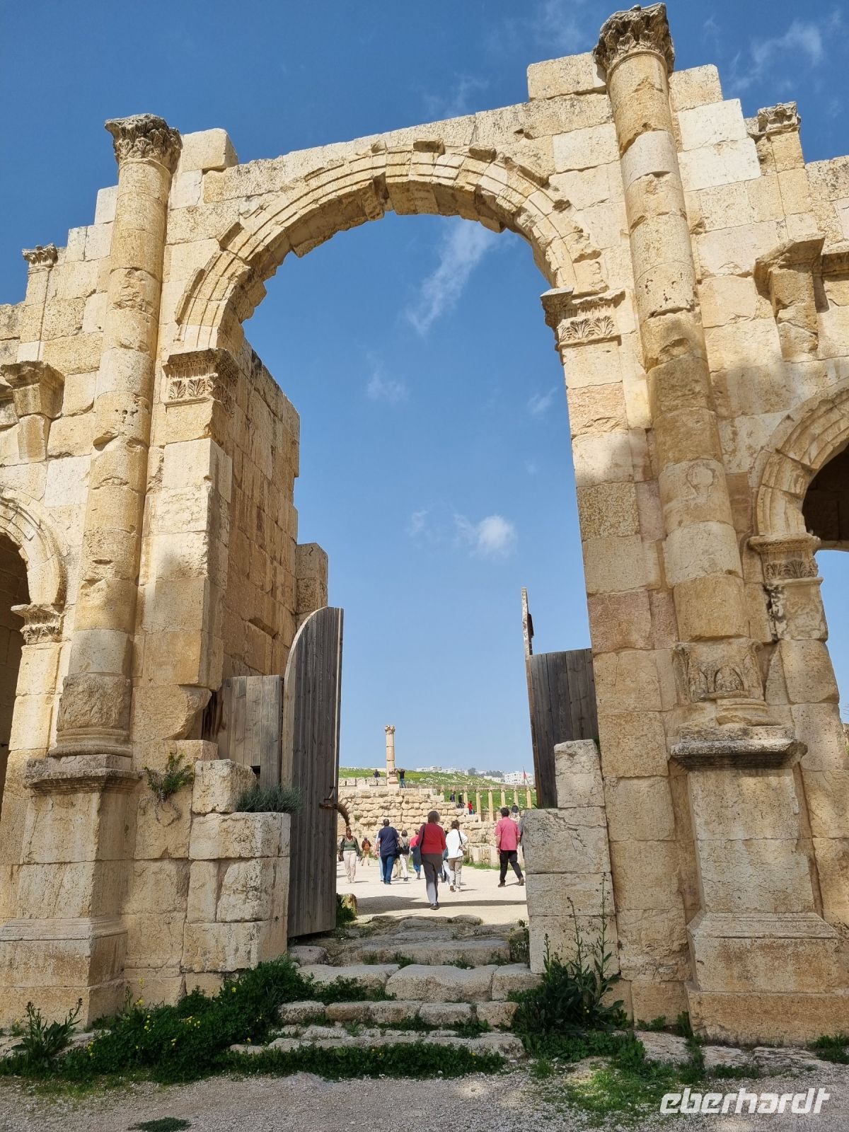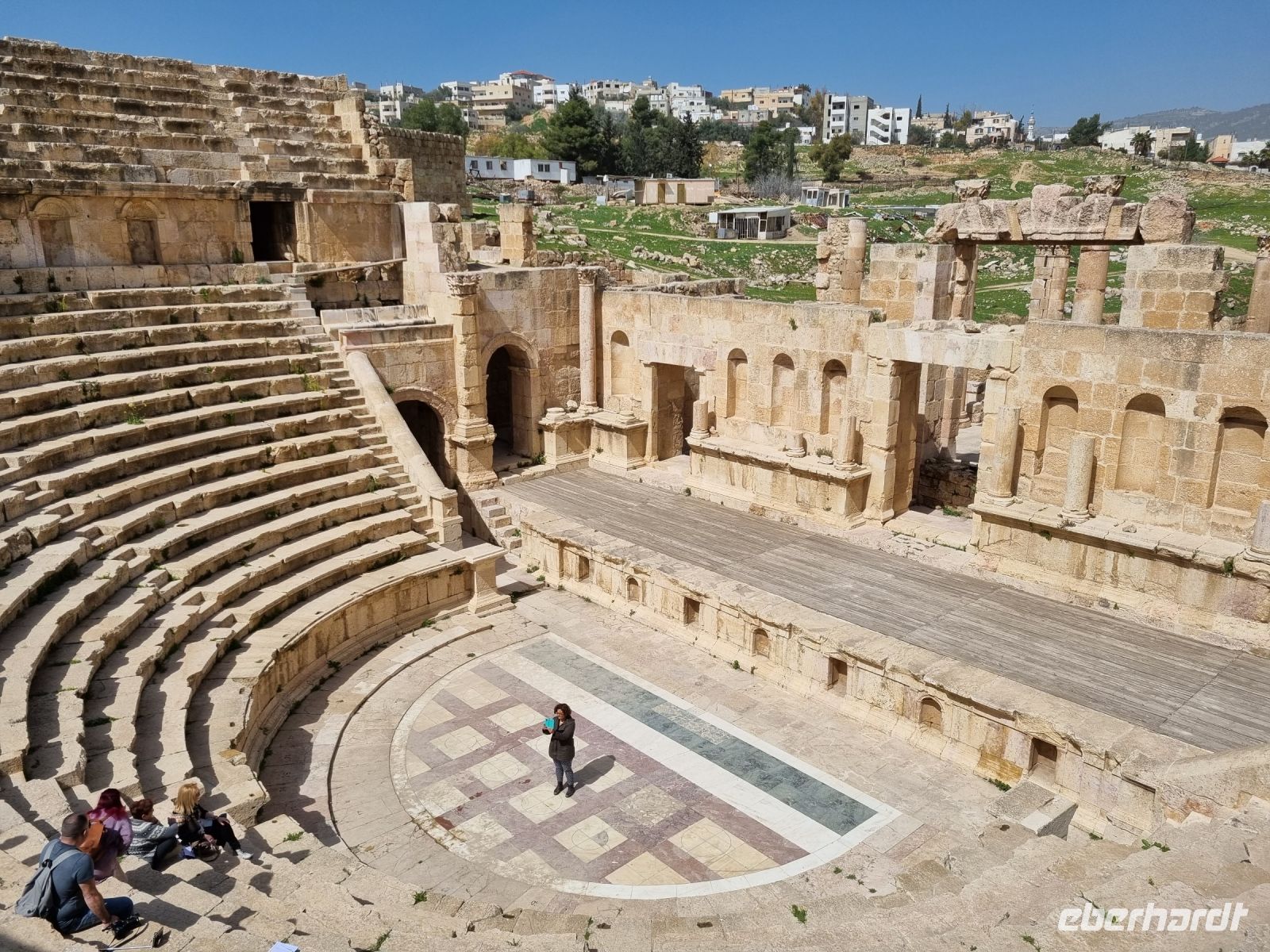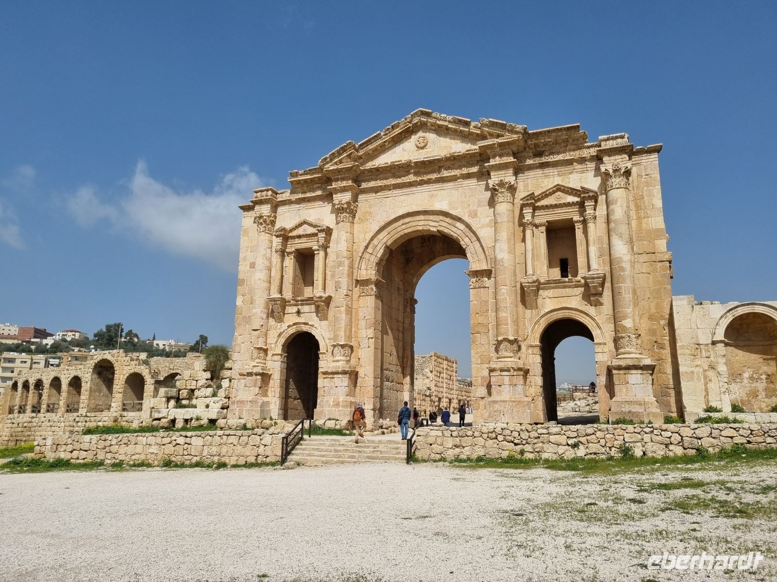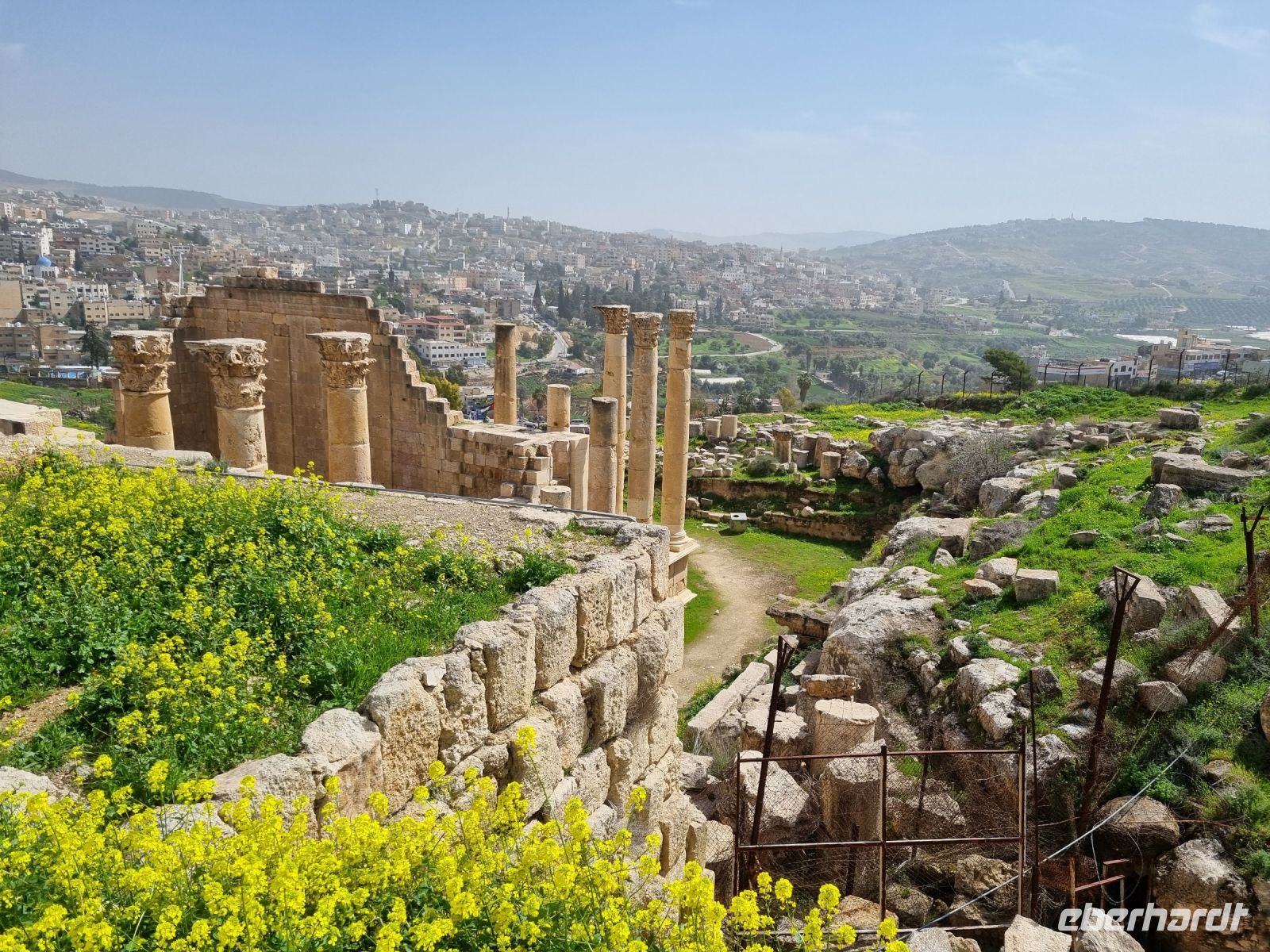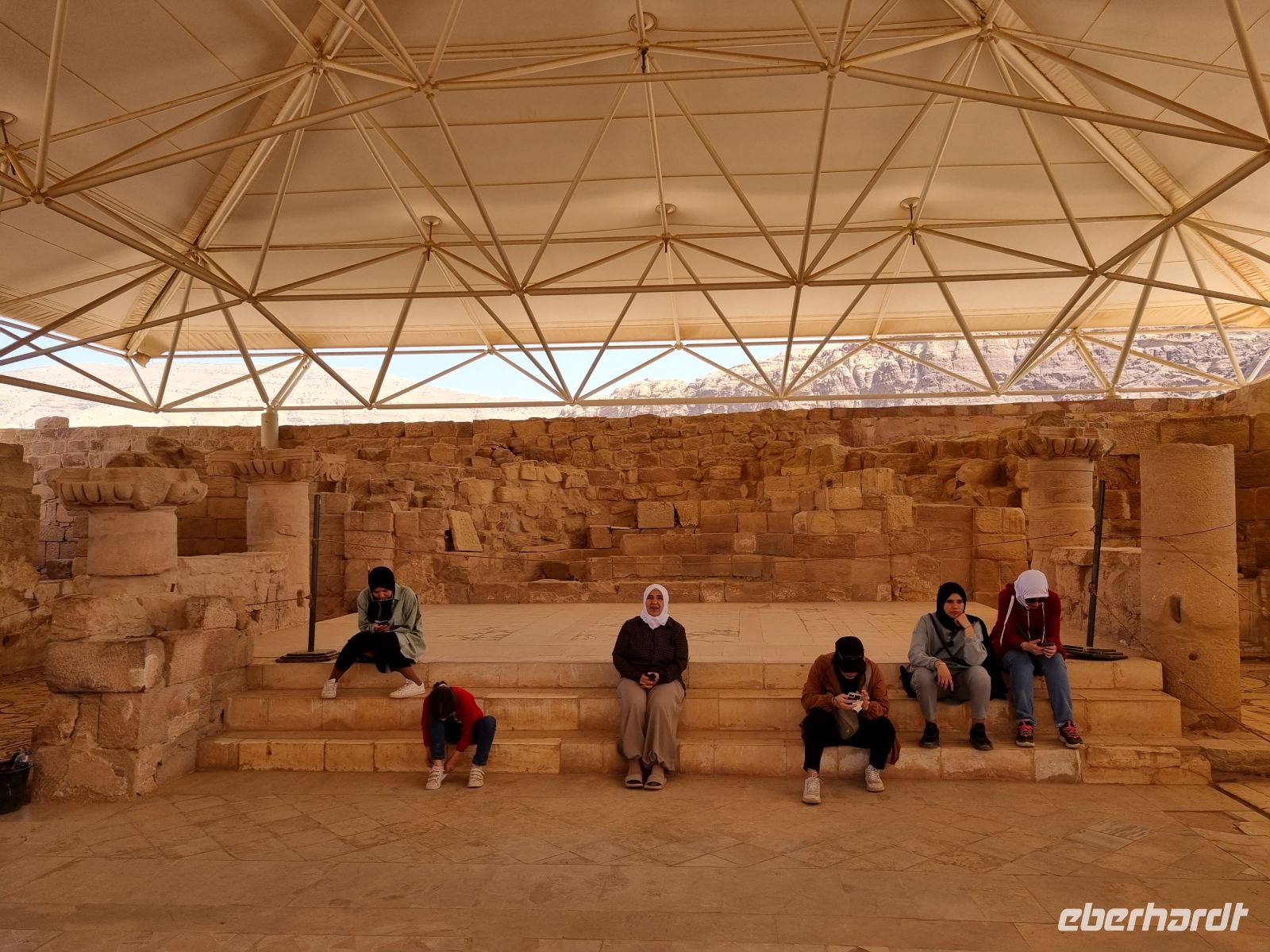 Heute ging es mit dem Bus gen Norden. Der Kontrast zum gestrigen Tag war deutlich spürbar, denn wir fuhren durch saftig grüne und hügelige Landschaften vorbei an unzähligen Steineichen-Naturwäldern bzw. Olivenhainen zunächst nach Ajlun. Hier ist es feuchter als im Rest des Landes und es fällt im Winter auch oft Schnee. Wir besuchten die oberhalb der kleinen Stadt Ajlun gelegene islamische Burg, welche im 12. Jahrhundert errichtet wurde, um die Gegend vor den Kreuzfahrer zu sichern. Bauherr war ein Neffe des großen Sultans Saladin, Izz ed-Din Usama. Genutzt hat man die Festung allerdings nie, denn bereits drei Jahre nach ihrer Fertigstellung wurden das Kreuzfahrerheer 1187 in der Schlacht bei Hittin geschlagen. Die Kreuzfahrer bezeichnet man hier übrigens nicht als solche, sondern man nennt sie Franken. Nach einer weiteren ca. 1-stündigen Fahrt erreichten wir Jerash mit der bedeutendsten römischen Ausgrabungsstätte auf jordanischem Gebiet. Kaiser Hadrian rühmte sie "als die Stadt, die alle Schönheiten in sich vereint". Und so ließ er sich auch gleich einen Triumphbogen bauen und dazu ein Hippodrom, eine Pferderennbahn. Wir traten am Südtor in die Stadt ein und gelangten als erstes zum von Säulen umrahmten ovalen Platz, welcher so genannt wird, weil er nicht rund ist. Später erreichten wir das Südtheater, welches sich neben dem Zeus-Tempel befindet. Selten hat man in einer römisch-antiken Stätte noch so viele aufrechtstehende Säulen gesehen - echt beeindruckend! Wir setzten unsere Entdeckungstour fort und besuchten u. a. auch das Nordtheater, den Artemis-Tempel und gelangten über die gepflasterte Hauptstraße des riesigen Geländes zu unserem Ausgangspunkt zurück. Tief beeindruckt machten wir uns anschließend zum nahe gelegenen Restaurant "Artemis" auf, um uns dort mit kulinarischen arabischen Köstlichkeiten zu stärken. Hier konnten wir sogar zuschauen, wie unser Brot in einem traditionellen arabischen Lehmofen gebacken wurde, bevor es direkt vom Feuer noch warm auf den Tellern ankam - ein echter Gaumenschmaus! Am Nachmittag kehrten wir schließlich nach Amman zurück.