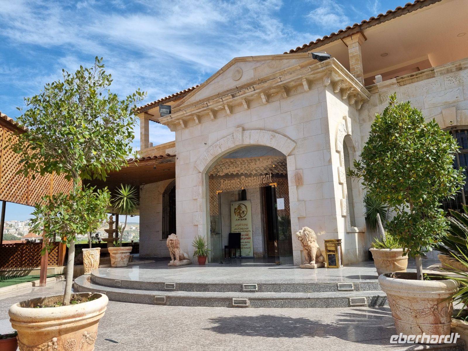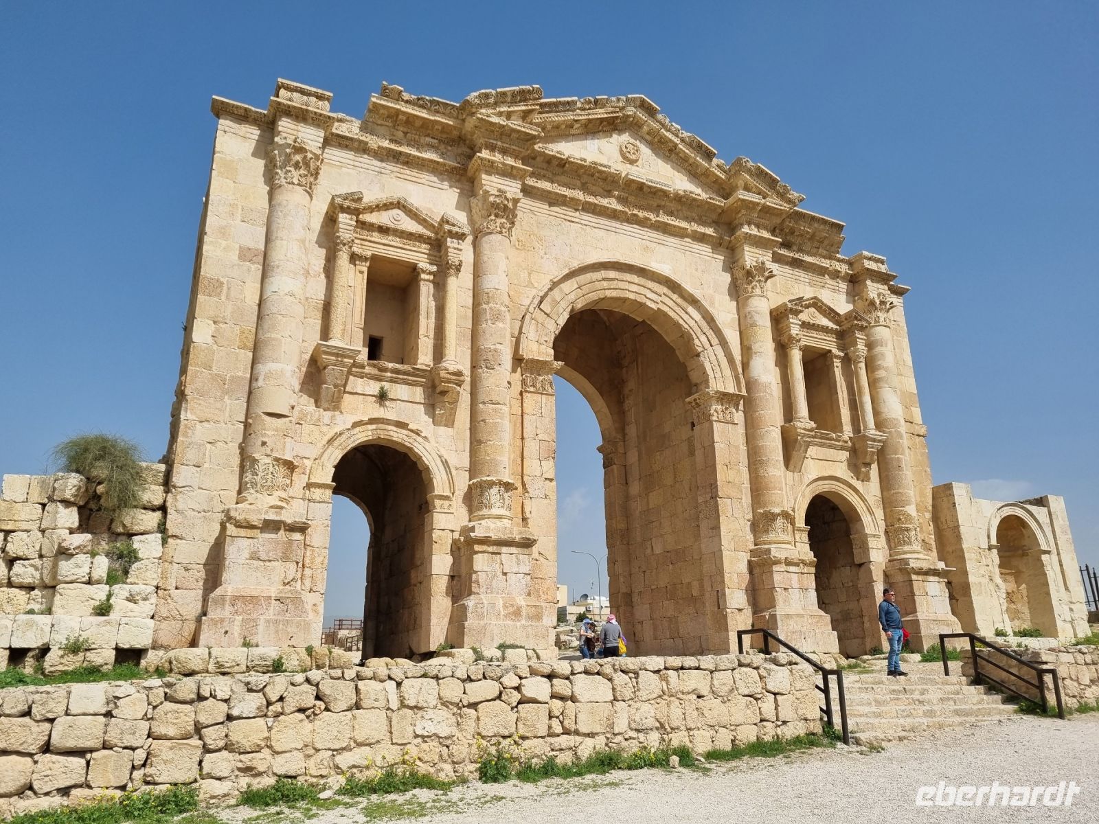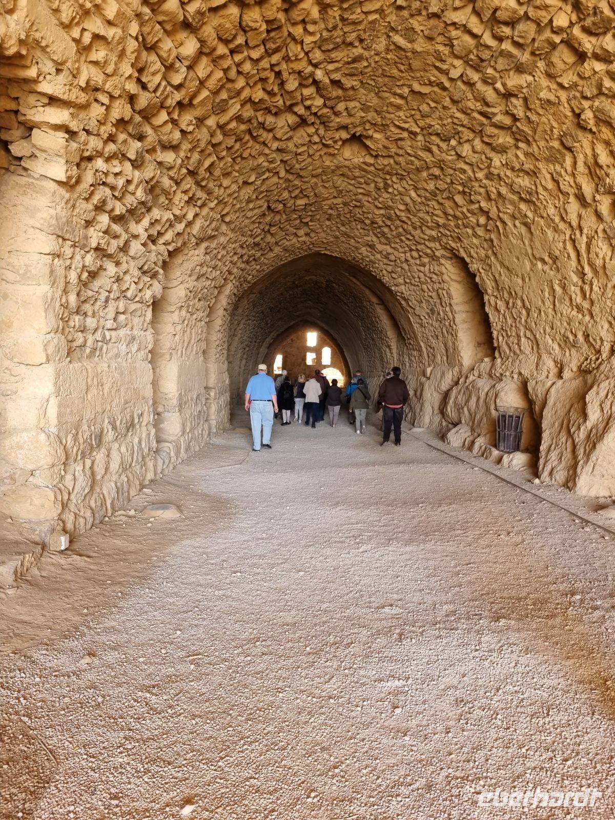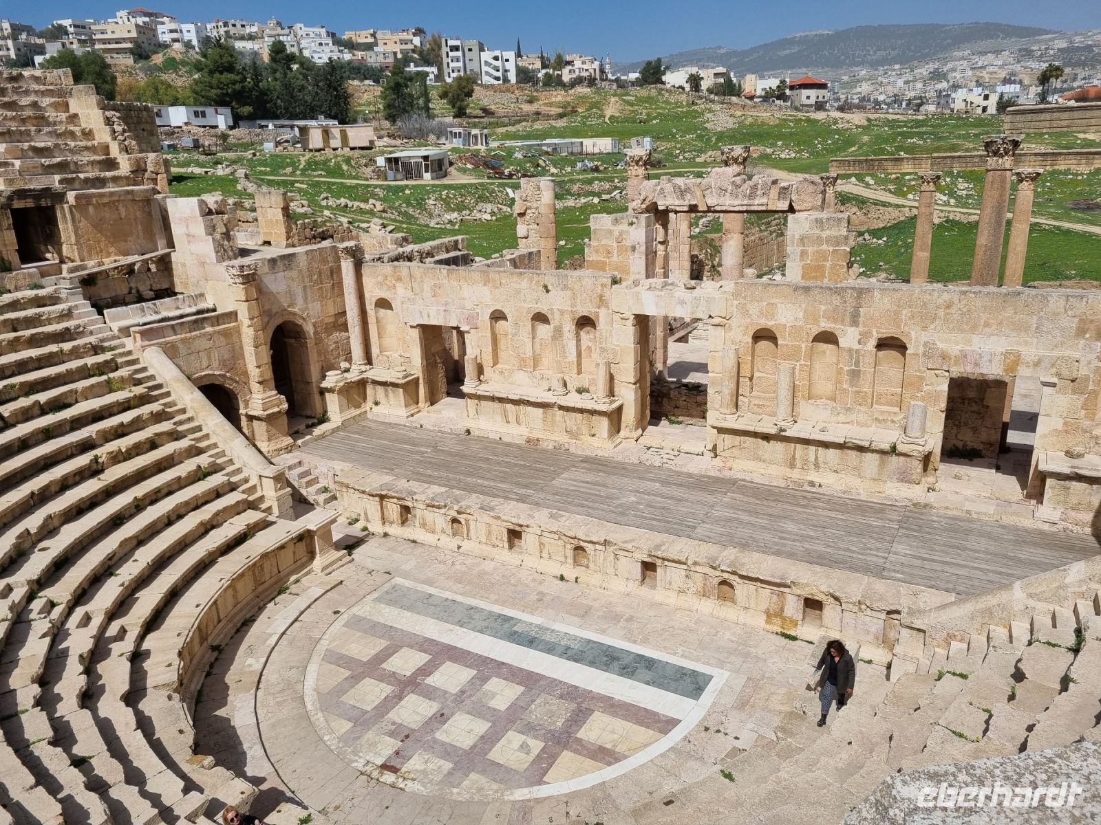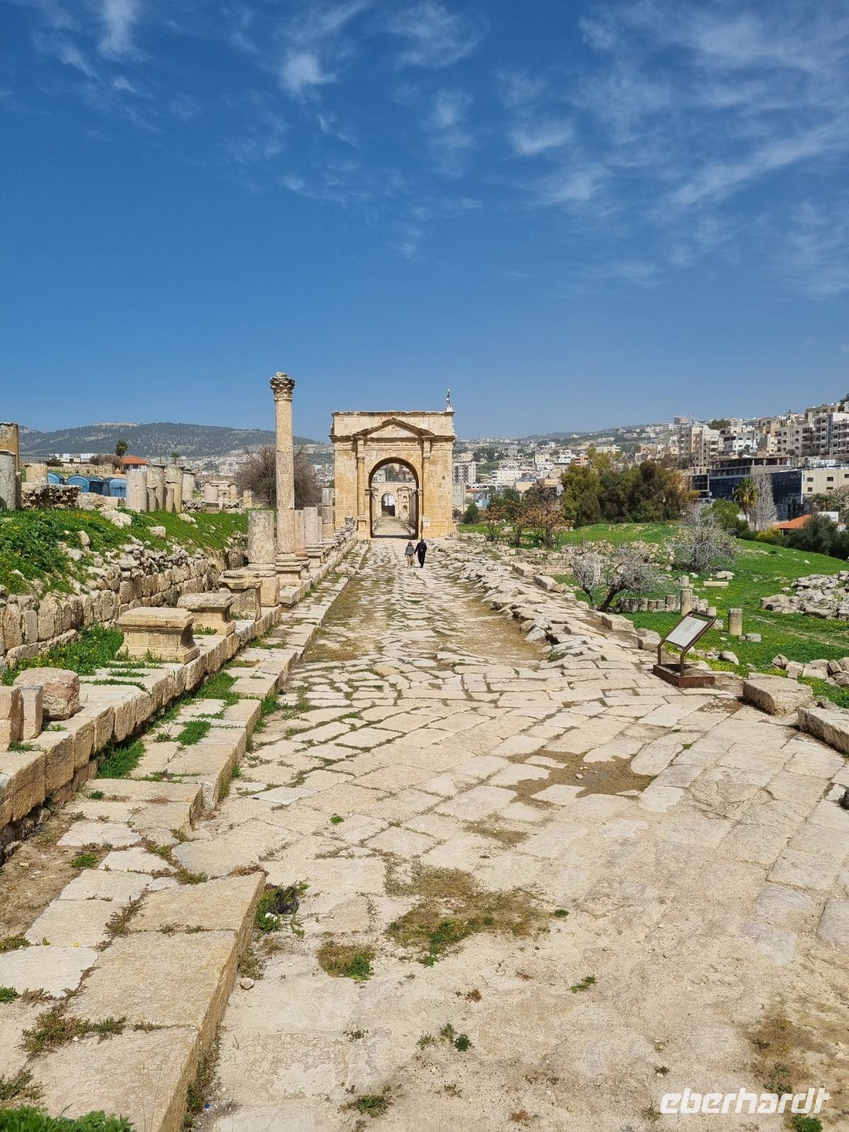 Heute ging es mit dem Bus gen Norden. Der Kontrast zum gestrigen Tag war deutlich spürbar, denn wir fuhren durch saftig grüne und hügelige Landschaften vorbei an unzähligen Steineichen-Naturwäldern bzw. Olivenhainen zunächst nach Ajlun. Hier ist es feuchter als im Rest des Landes und es fällt im Winter auch oft Schnee. Wir besuchten die oberhalb der kleinen Stadt Ajlun gelegene islamische Burg, welche im 12. Jahrhundert errichtet wurde, um die Gegend vor den Kreuzfahrer zu sichern. Bauherr war ein Neffe des großen Sultans Saladin, Izz ed-Din Usama. Genutzt hat man die Festung allerdings nie, denn bereits drei Jahre nach ihrer Fertigstellung wurden das Kreuzfahrerheer 1187 in der Schlacht bei Hittin geschlagen. Die Kreuzfahrer bezeichnet man hier übrigens nicht als solche, sondern man nennt sie Franken. Nach einer weiteren ca. 1-stündigen Fahrt erreichten wir Jerash mit der bedeutendsten römischen Ausgrabungsstätte auf jordanischem Gebiet. Kaiser Hadrian rühmte sie "als die Stadt, die alle Schönheiten in sich vereint". Und so ließ er sich auch gleich einen Triumphbogen bauen und dazu ein Hippodrom, eine Pferderennbahn. Wir traten am Südtor in die Stadt ein und gelangten als erstes zum von Säulen umrahmten ovalen Platz, welcher so genannt wird, weil er nicht rund ist. Später erreichten wir das Südtheater, welches sich neben dem Zeus-Tempel befindet. Selten hat man in einer römisch-antiken Stätte noch so viele aufrechtstehende Säulen gesehen - echt beeindruckend! Wir setzten unsere Entdeckungstour fort und besuchten u. a. auch das Nordtheater, den Artemis-Tempel und gelangten über die gepflasterte Hauptstraße des riesigen Geländes zu unserem Ausgangspunkt zurück. Tief beeindruckt machten wir uns anschließend zum nahe gelegenen Restaurant "Artemis" auf, um uns dort mit kulinarischen arabischen Köstlichkeiten zu stärken. Hier konnten wir sogar zuschauen, wie unser Brot in einem traditionellen arabischen Lehmofen gebacken wurde, bevor es direkt vom Feuer noch warm auf den Tellern ankam - ein echter Gaumenschmaus! Am Nachmittag kehrten wir schließlich nach Amman zurück.