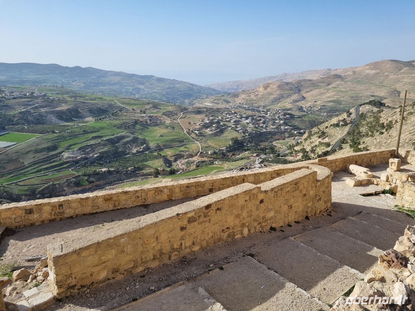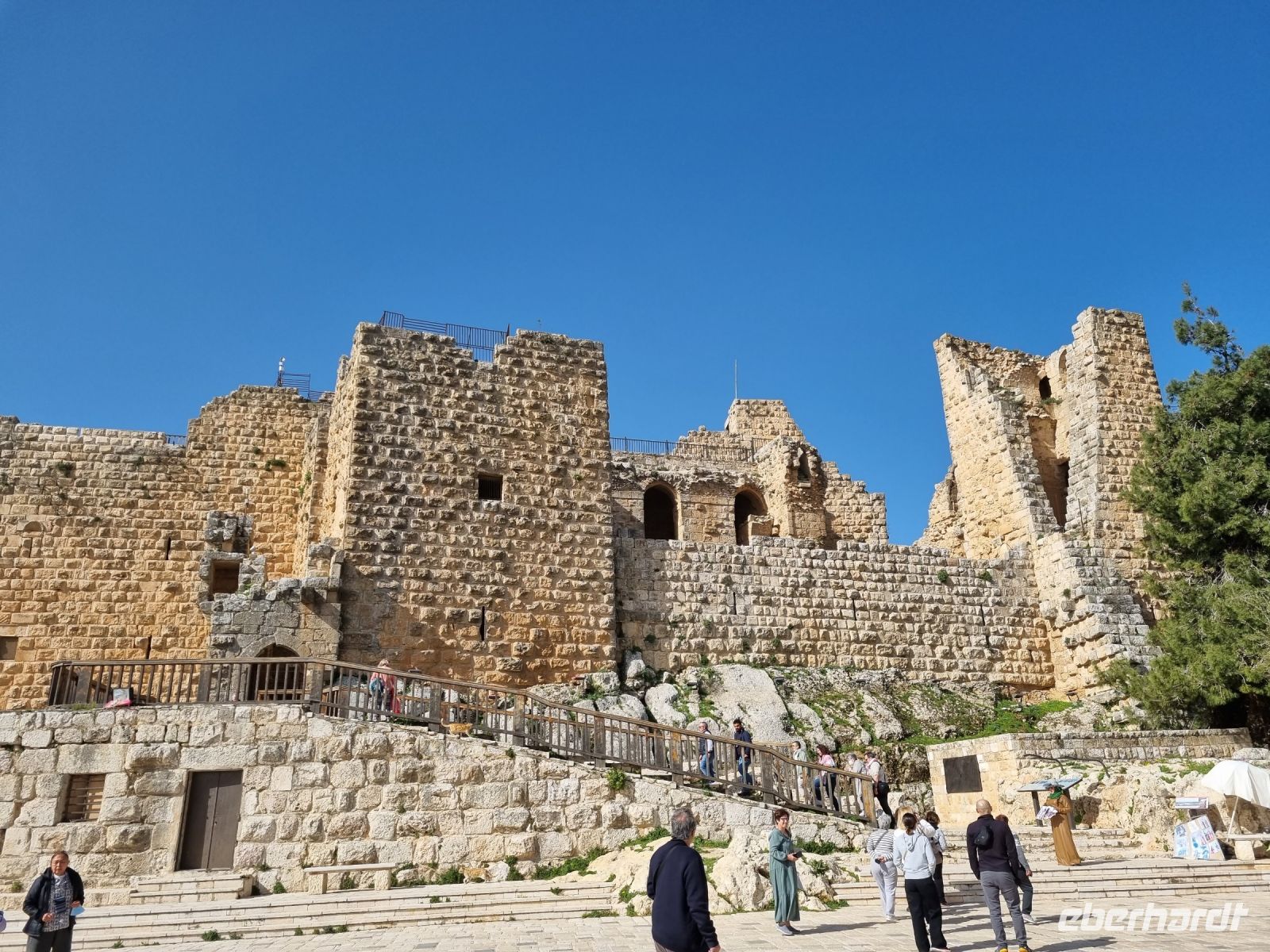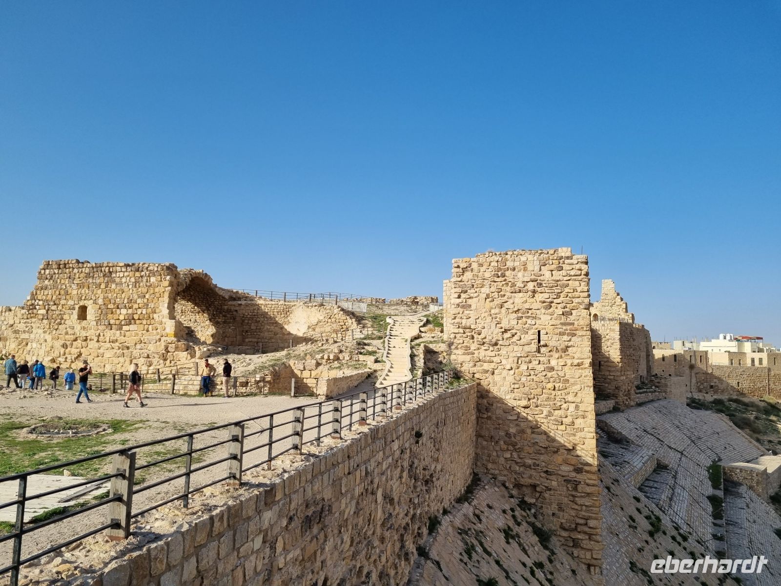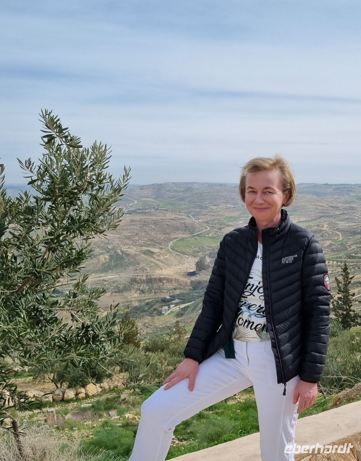 Der heutige Tag stand im Zeichen unserer Frauen, denn schließlich war es der Internationale Frauentag. Alle Damen unserer Gruppe erhielten im Namen von Eberhardt TRAVEL ein kleines Geschenk in Form einer kosmetischen Gesichtsmaske mit den heilenden Kräften des Toten Meeres. Von unserem Hotel in Amman mussten wir uns nun verabschieden, aber bevor wir die Stadt Amman verließen, legten wir noch einen Stopp an der König Abdullah-Moschee oder auch sogenannten "Blauen Moschee" ein. Diese wurde im Jahre 1988 im Auftrag von König Hussein fertiggestellt und ist die größte und auch schönste Moschee des Landes. Wir Frauen mussten ein schwarzes Gewand anziehen und die Männer blieben wie sie sind, nur kurze Hosen waren verboten. Staunend betraten wir den riesigen Gebetsraum und Mahmoud erklärte uns hier vor Ort die Grundlagen des islamischen Glaubens bzw. sprach natürlich auch über den Koran. Die Frauen unserer Gruppe besuchen dann auch noch den Gebetsraum für Frauen, die Männer durften da nicht mit hinein - alles strikt getrennt! Nach diesem kleinen Islam-Exkurs verabschiedeten wir uns von Amman und setzten unsere Fahrt in Richtung Süden fort. Wir fuhren zum Berg Nebo - hier soll Moses das gelobte Land erblickt haben! Betreten konnte er es allerdings nicht mehr, da er auf dem Berg starb. Allerdings wurde sein Grab bis heute nicht gefunden. Wir bestaunten die berühmten Mosaike der Kirche und erfreuten uns an grandiosen Ausblicken hinunter ins Jordan-Tal. Nach nur wenigen Kilometern erreichten wir die Stadt Madaba, das Zentrum der jordanischen Mosaikkunst. Das berühmteste Mosaik besichtigten wir in der Kirche St. Georg, einer dreischiffigen griechisch-orthodoxe Basilika. Das Mosaik stellt eine Landkarte von Palästina dar und stammt vermutlich aus der zweiten Hälfte des 6. Jahrhunderts. Anschließend sind wir zu einem Mittagessen eingeladen, wo es wiederum unzählige Köstlichkeiten gibt. Nach einer weiteren ca. 2-stündigen Busfahrt erreichten wir die Burg Kerak. Über der Altstadt befindet sich die teilweise restaurierte Kreuzritter-Burg, die im 12. Jahrhundert errichtet wurde, um den Handels- und Pilgerverkehr zwischen Damaskus und Mekka zu kontrollieren. Die Überfälle des Burgherrn auf die Karawanen und die Entführung einer seiner Schwestern erregten den Zorn Saladins und er ließ die Burg mehrfach belagern. Schließlich fiel die Burg im Jahre 1188 nach 8-monatiger Belagerung und Saladin enthauptete den Burgherrn eigenhändig. Mit einer kurzen Pause unterwegs fuhren wir dann nach Petra weiter, wo wir die nächsten drei Nächte verbrachten.