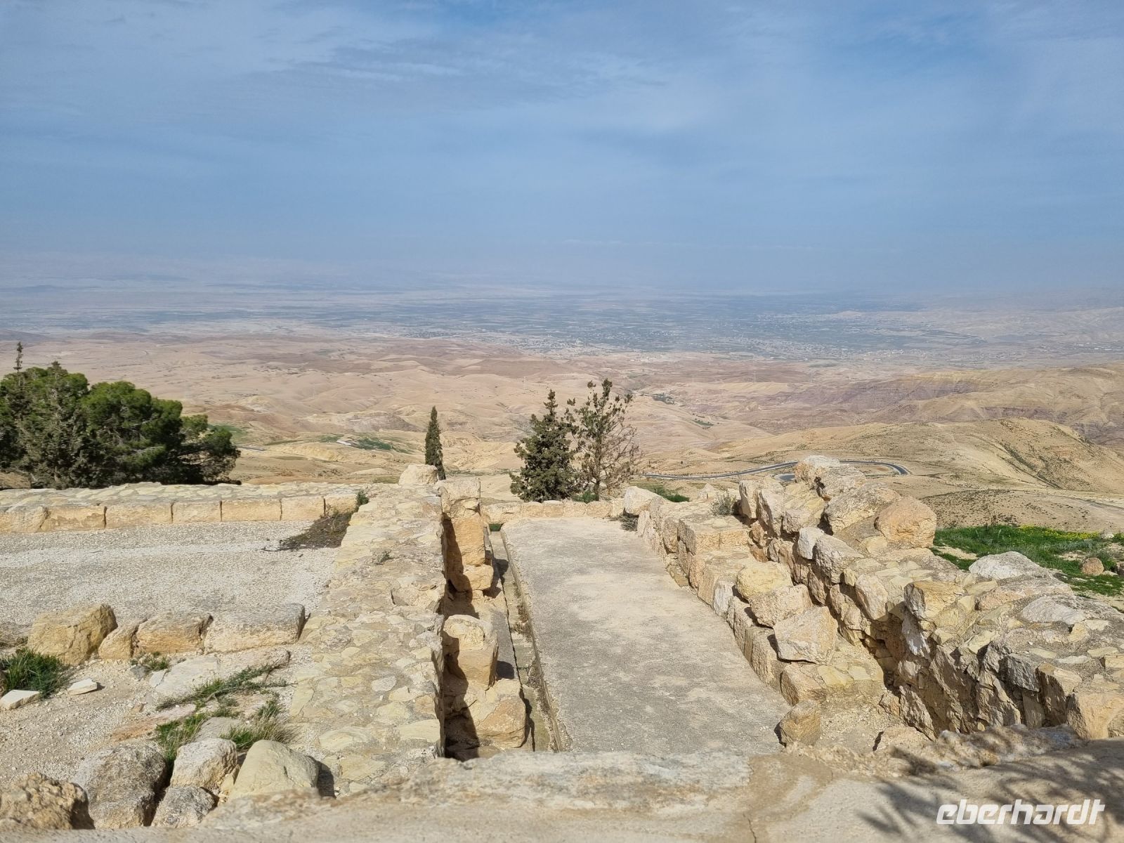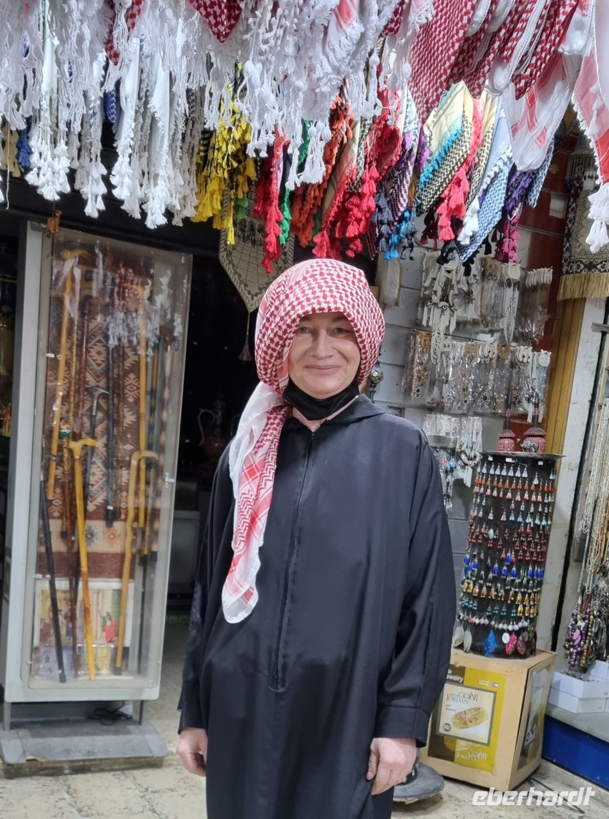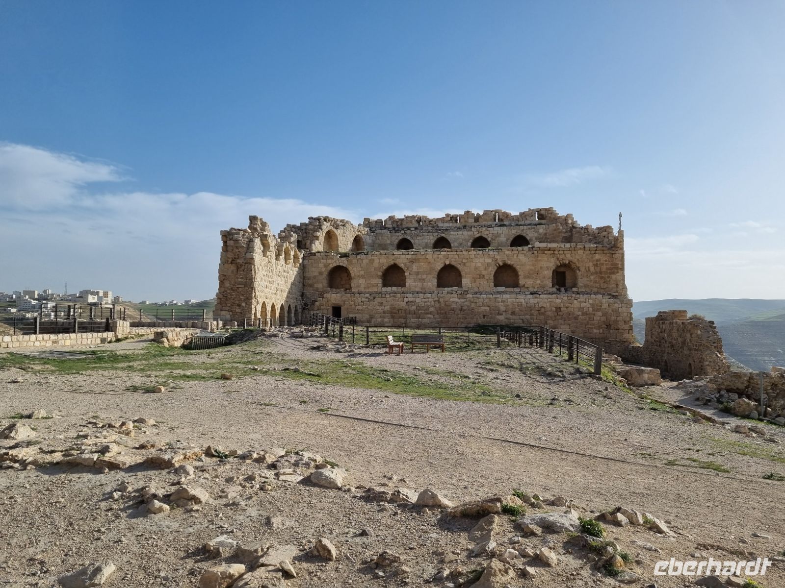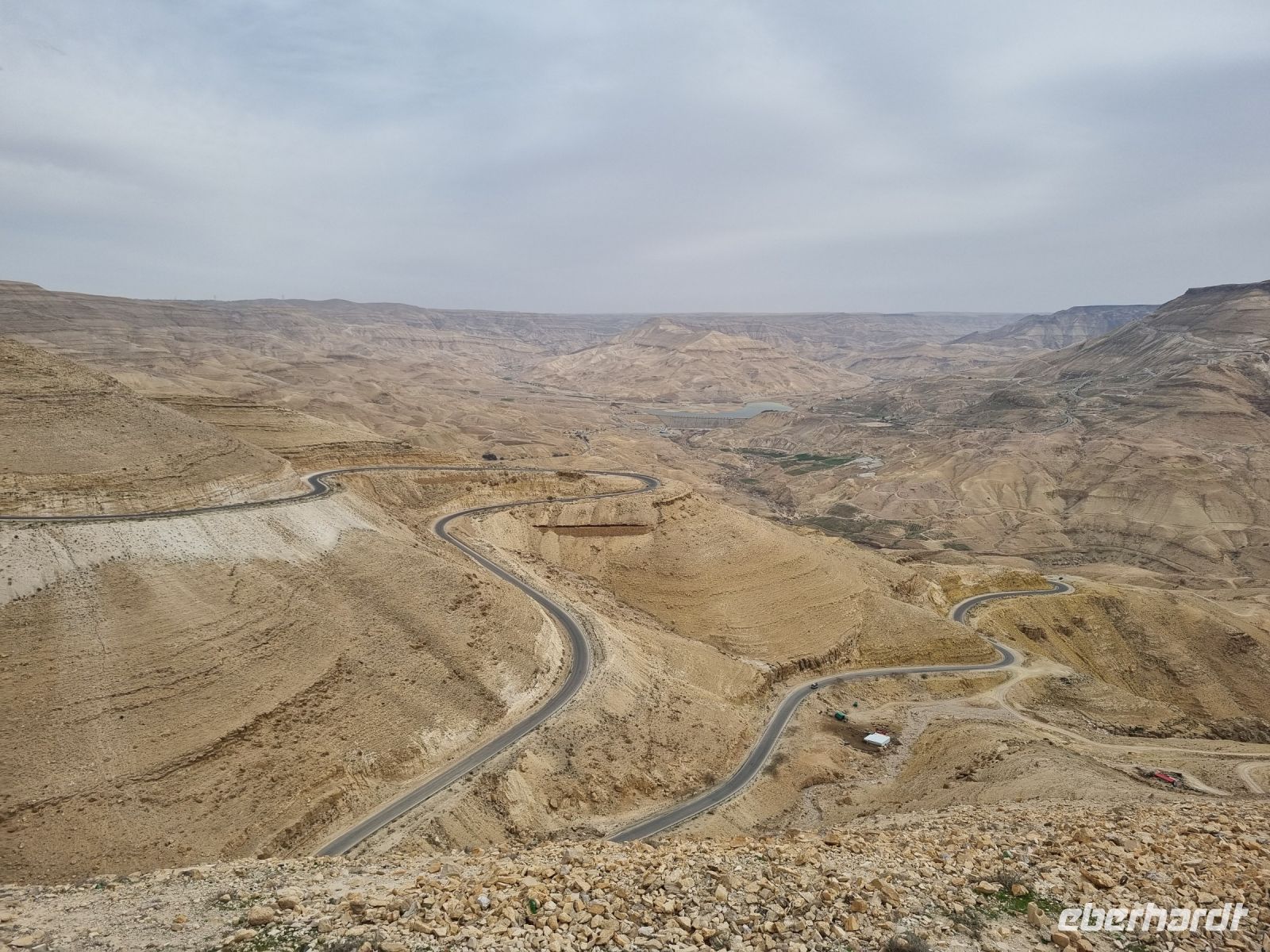 Der heutige Tag stand im Zeichen unserer Frauen, denn schließlich war es der Internationale Frauentag. Alle Damen unserer Gruppe erhielten im Namen von Eberhardt TRAVEL ein kleines Geschenk in Form einer kosmetischen Gesichtsmaske mit den heilenden Kräften des Toten Meeres. Von unserem Hotel in Amman mussten wir uns nun verabschieden, aber bevor wir die Stadt Amman verließen, legten wir noch einen Stopp an der König Abdullah-Moschee oder auch sogenannten "Blauen Moschee" ein. Diese wurde im Jahre 1988 im Auftrag von König Hussein fertiggestellt und ist die größte und auch schönste Moschee des Landes. Wir Frauen mussten ein schwarzes Gewand anziehen und die Männer blieben wie sie sind, nur kurze Hosen waren verboten. Staunend betraten wir den riesigen Gebetsraum und Mahmoud erklärte uns hier vor Ort die Grundlagen des islamischen Glaubens bzw. sprach natürlich auch über den Koran. Die Frauen unserer Gruppe besuchen dann auch noch den Gebetsraum für Frauen, die Männer durften da nicht mit hinein - alles strikt getrennt! Nach diesem kleinen Islam-Exkurs verabschiedeten wir uns von Amman und setzten unsere Fahrt in Richtung Süden fort. Wir fuhren zum Berg Nebo - hier soll Moses das gelobte Land erblickt haben! Betreten konnte er es allerdings nicht mehr, da er auf dem Berg starb. Allerdings wurde sein Grab bis heute nicht gefunden. Wir bestaunten die berühmten Mosaike der Kirche und erfreuten uns an grandiosen Ausblicken hinunter ins Jordan-Tal. Nach nur wenigen Kilometern erreichten wir die Stadt Madaba, das Zentrum der jordanischen Mosaikkunst. Das berühmteste Mosaik besichtigten wir in der Kirche St. Georg, einer dreischiffigen griechisch-orthodoxe Basilika. Das Mosaik stellt eine Landkarte von Palästina dar und stammt vermutlich aus der zweiten Hälfte des 6. Jahrhunderts. Anschließend sind wir zu einem Mittagessen eingeladen, wo es wiederum unzählige Köstlichkeiten gibt. Nach einer weiteren ca. 2-stündigen Busfahrt erreichten wir die Burg Kerak. Über der Altstadt befindet sich die teilweise restaurierte Kreuzritter-Burg, die im 12. Jahrhundert errichtet wurde, um den Handels- und Pilgerverkehr zwischen Damaskus und Mekka zu kontrollieren. Die Überfälle des Burgherrn auf die Karawanen und die Entführung einer seiner Schwestern erregten den Zorn Saladins und er ließ die Burg mehrfach belagern. Schließlich fiel die Burg im Jahre 1188 nach 8-monatiger Belagerung und Saladin enthauptete den Burgherrn eigenhändig. Mit einer kurzen Pause unterwegs fuhren wir dann nach Petra weiter, wo wir die nächsten drei Nächte verbrachten.