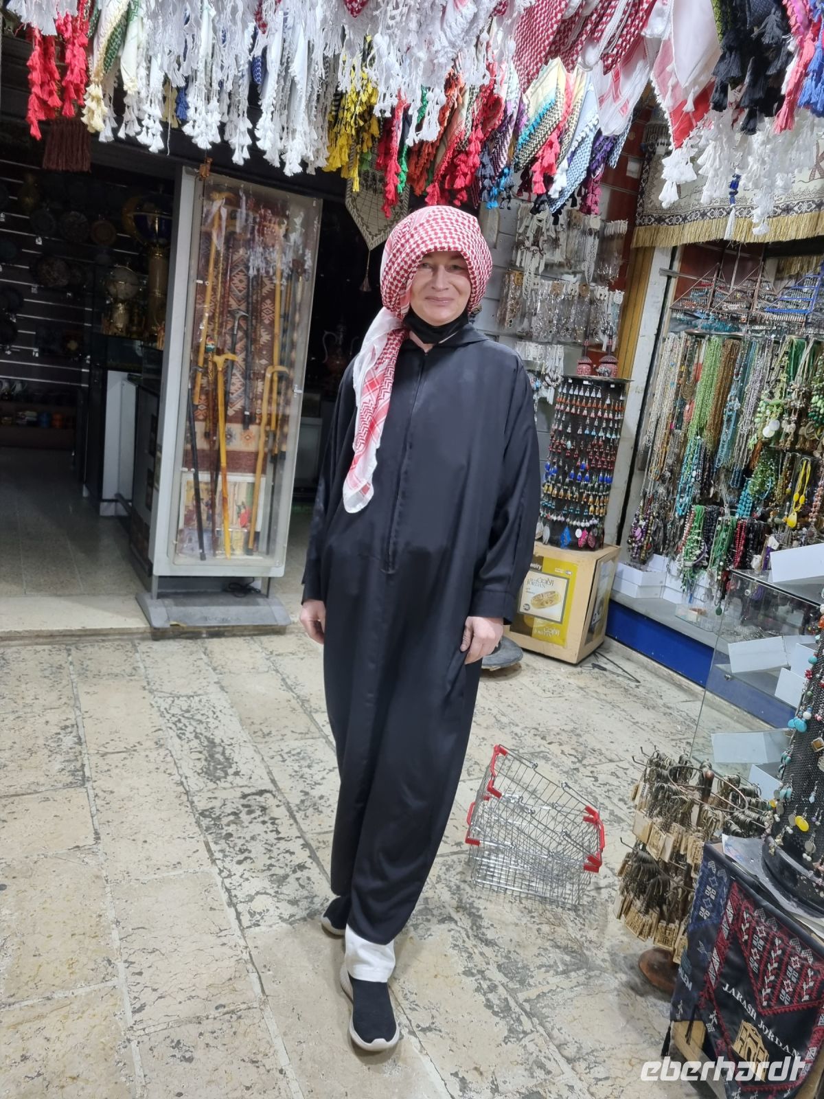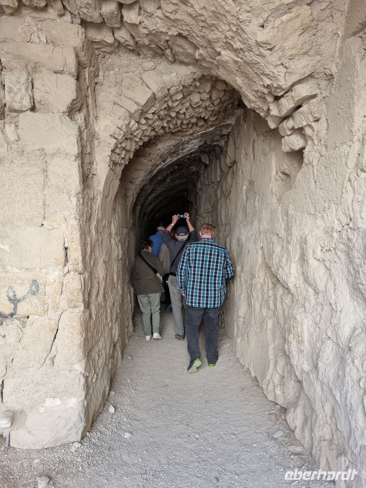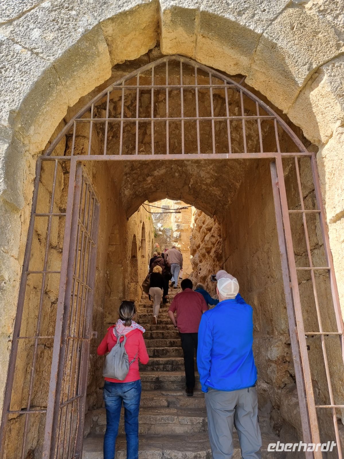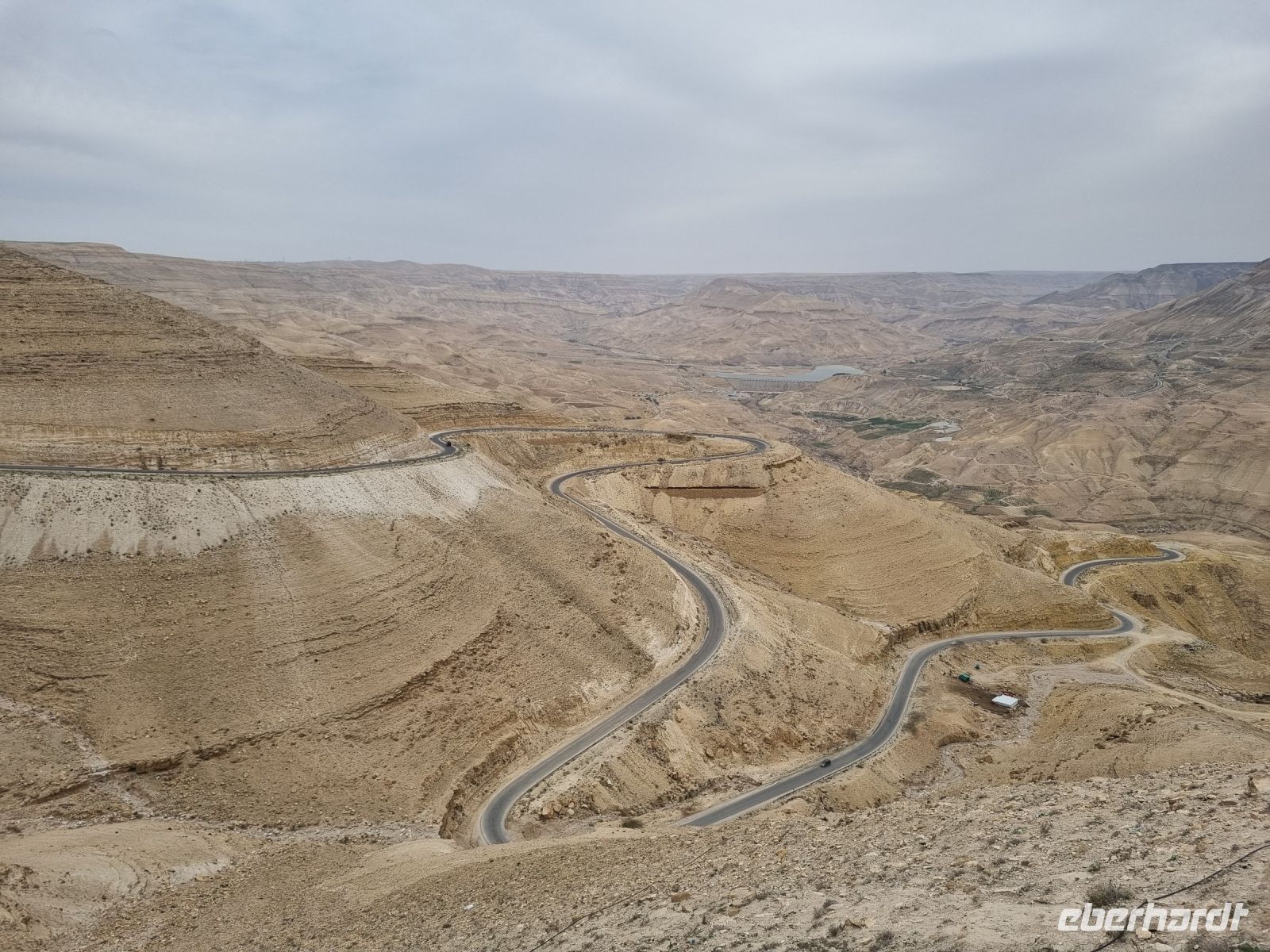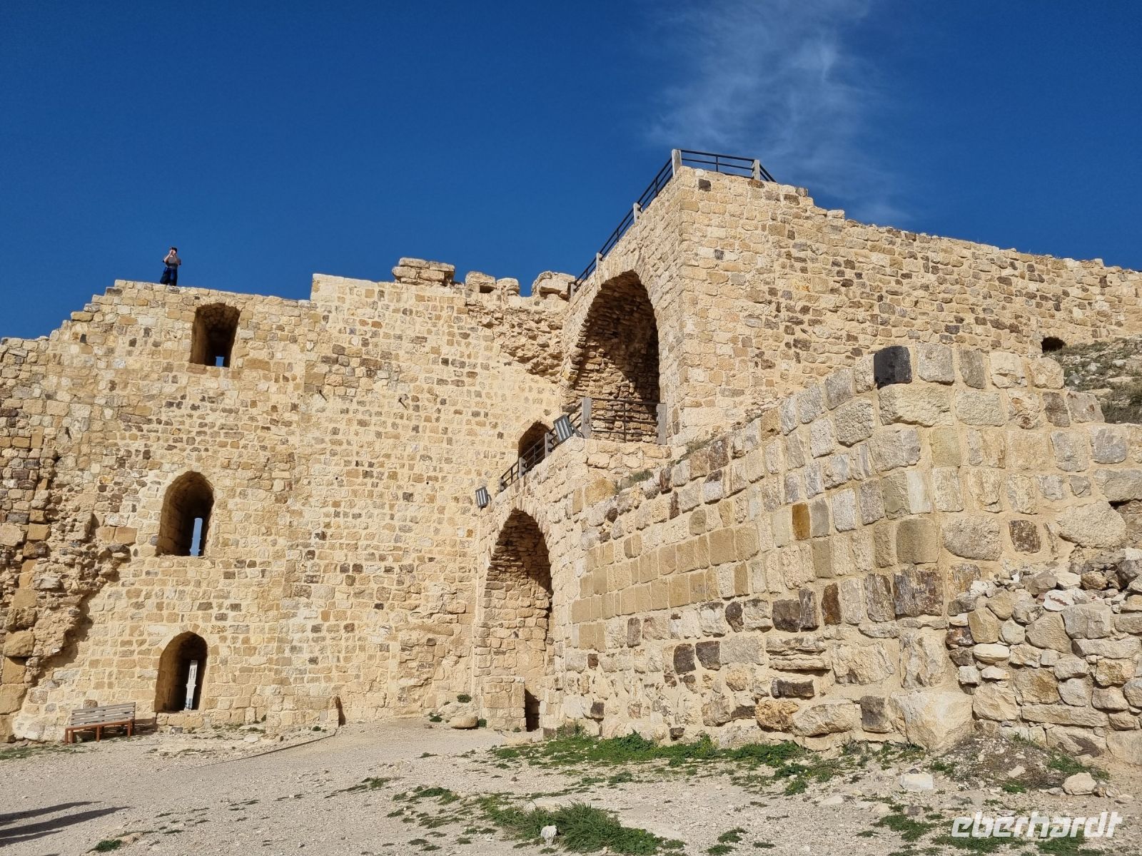 Der heutige Tag stand im Zeichen unserer Frauen, denn schließlich war es der Internationale Frauentag. Alle Damen unserer Gruppe erhielten im Namen von Eberhardt TRAVEL ein kleines Geschenk in Form einer kosmetischen Gesichtsmaske mit den heilenden Kräften des Toten Meeres. Von unserem Hotel in Amman mussten wir uns nun verabschieden, aber bevor wir die Stadt Amman verließen, legten wir noch einen Stopp an der König Abdullah-Moschee oder auch sogenannten "Blauen Moschee" ein. Diese wurde im Jahre 1988 im Auftrag von König Hussein fertiggestellt und ist die größte und auch schönste Moschee des Landes. Wir Frauen mussten ein schwarzes Gewand anziehen und die Männer blieben wie sie sind, nur kurze Hosen waren verboten. Staunend betraten wir den riesigen Gebetsraum und Mahmoud erklärte uns hier vor Ort die Grundlagen des islamischen Glaubens bzw. sprach natürlich auch über den Koran. Die Frauen unserer Gruppe besuchen dann auch noch den Gebetsraum für Frauen, die Männer durften da nicht mit hinein - alles strikt getrennt! Nach diesem kleinen Islam-Exkurs verabschiedeten wir uns von Amman und setzten unsere Fahrt in Richtung Süden fort. Wir fuhren zum Berg Nebo - hier soll Moses das gelobte Land erblickt haben! Betreten konnte er es allerdings nicht mehr, da er auf dem Berg starb. Allerdings wurde sein Grab bis heute nicht gefunden. Wir bestaunten die berühmten Mosaike der Kirche und erfreuten uns an grandiosen Ausblicken hinunter ins Jordan-Tal. Nach nur wenigen Kilometern erreichten wir die Stadt Madaba, das Zentrum der jordanischen Mosaikkunst. Das berühmteste Mosaik besichtigten wir in der Kirche St. Georg, einer dreischiffigen griechisch-orthodoxe Basilika. Das Mosaik stellt eine Landkarte von Palästina dar und stammt vermutlich aus der zweiten Hälfte des 6. Jahrhunderts. Anschließend sind wir zu einem Mittagessen eingeladen, wo es wiederum unzählige Köstlichkeiten gibt. Nach einer weiteren ca. 2-stündigen Busfahrt erreichten wir die Burg Kerak. Über der Altstadt befindet sich die teilweise restaurierte Kreuzritter-Burg, die im 12. Jahrhundert errichtet wurde, um den Handels- und Pilgerverkehr zwischen Damaskus und Mekka zu kontrollieren. Die Überfälle des Burgherrn auf die Karawanen und die Entführung einer seiner Schwestern erregten den Zorn Saladins und er ließ die Burg mehrfach belagern. Schließlich fiel die Burg im Jahre 1188 nach 8-monatiger Belagerung und Saladin enthauptete den Burgherrn eigenhändig. Mit einer kurzen Pause unterwegs fuhren wir dann nach Petra weiter, wo wir die nächsten drei Nächte verbrachten.