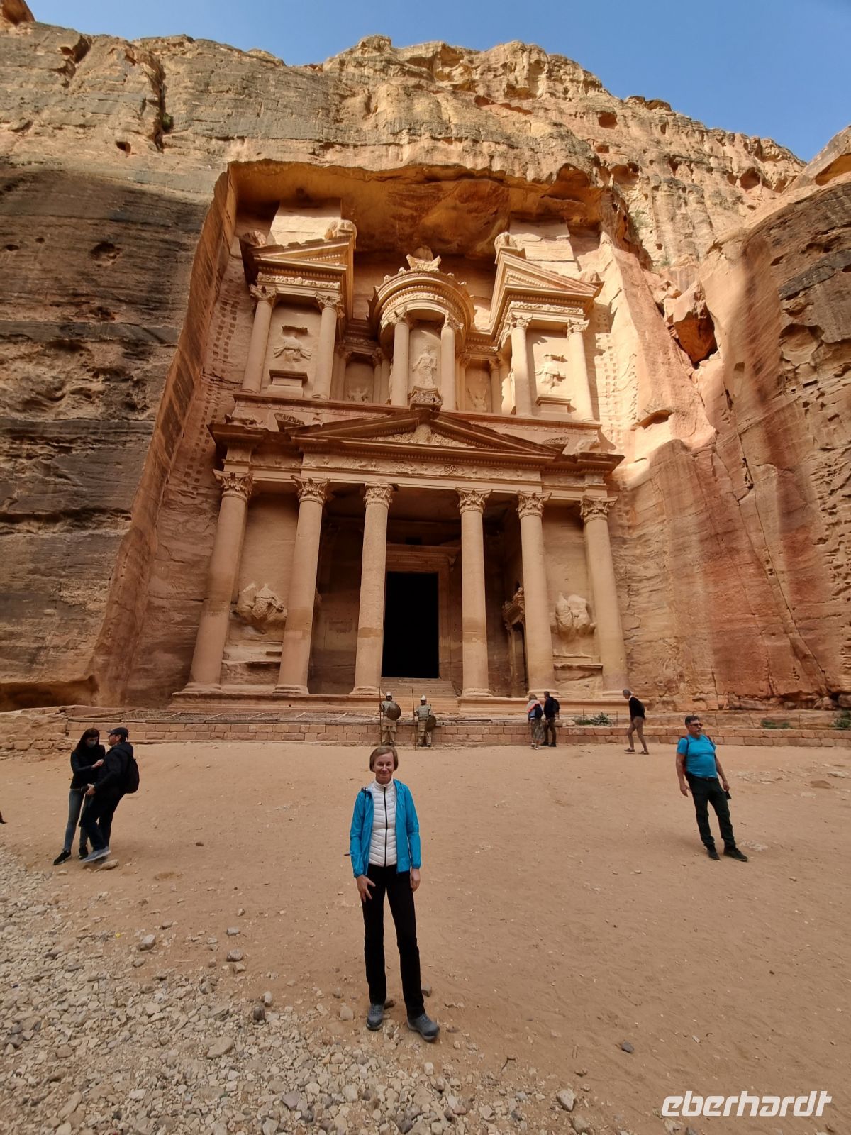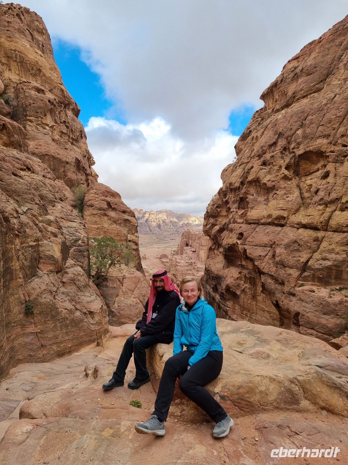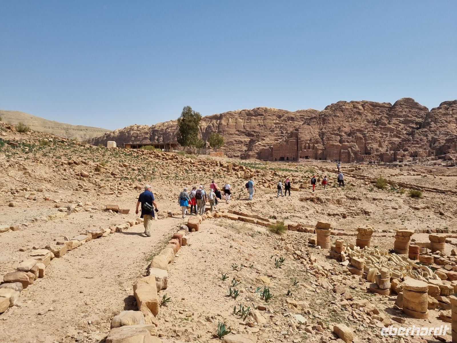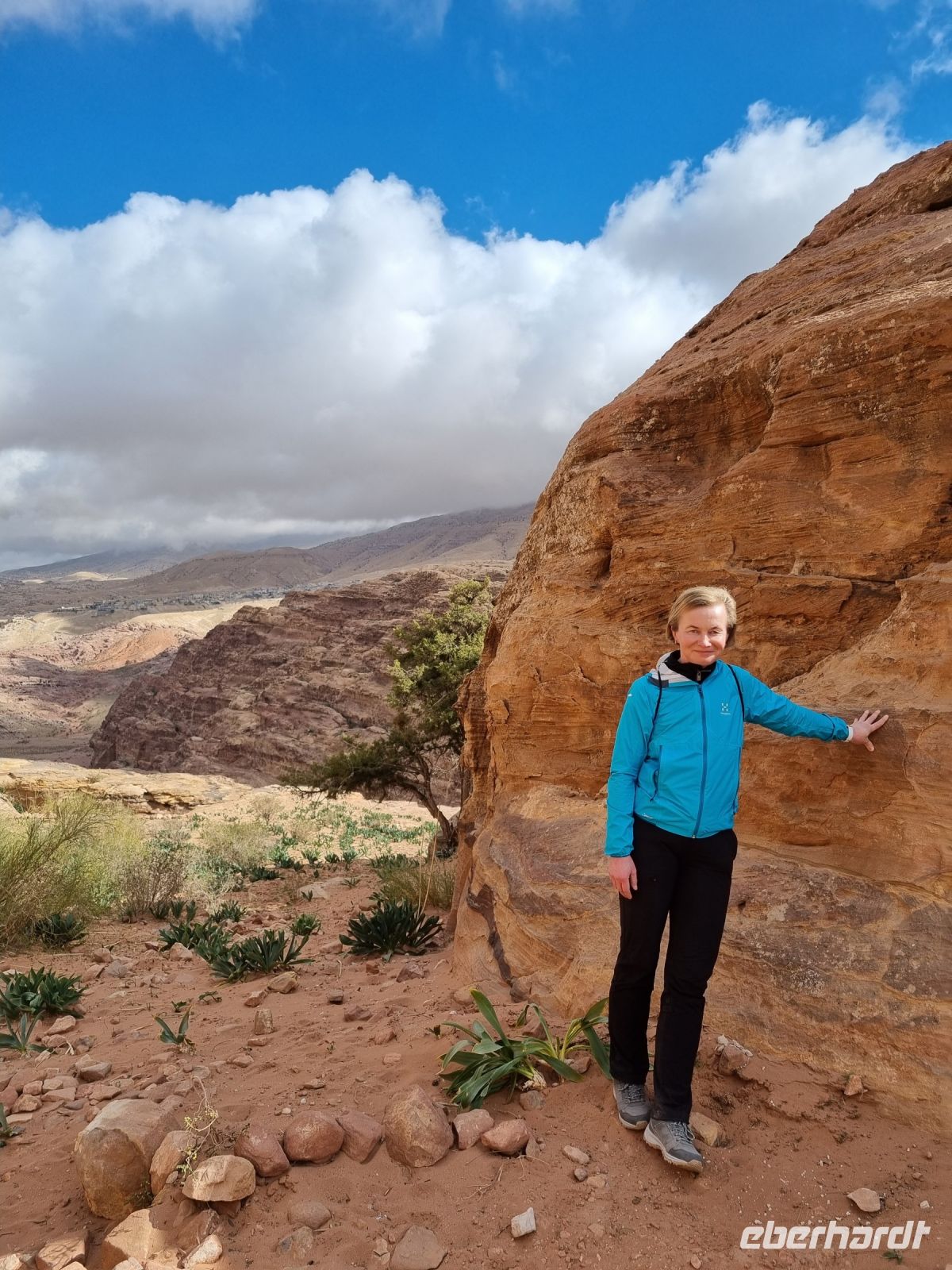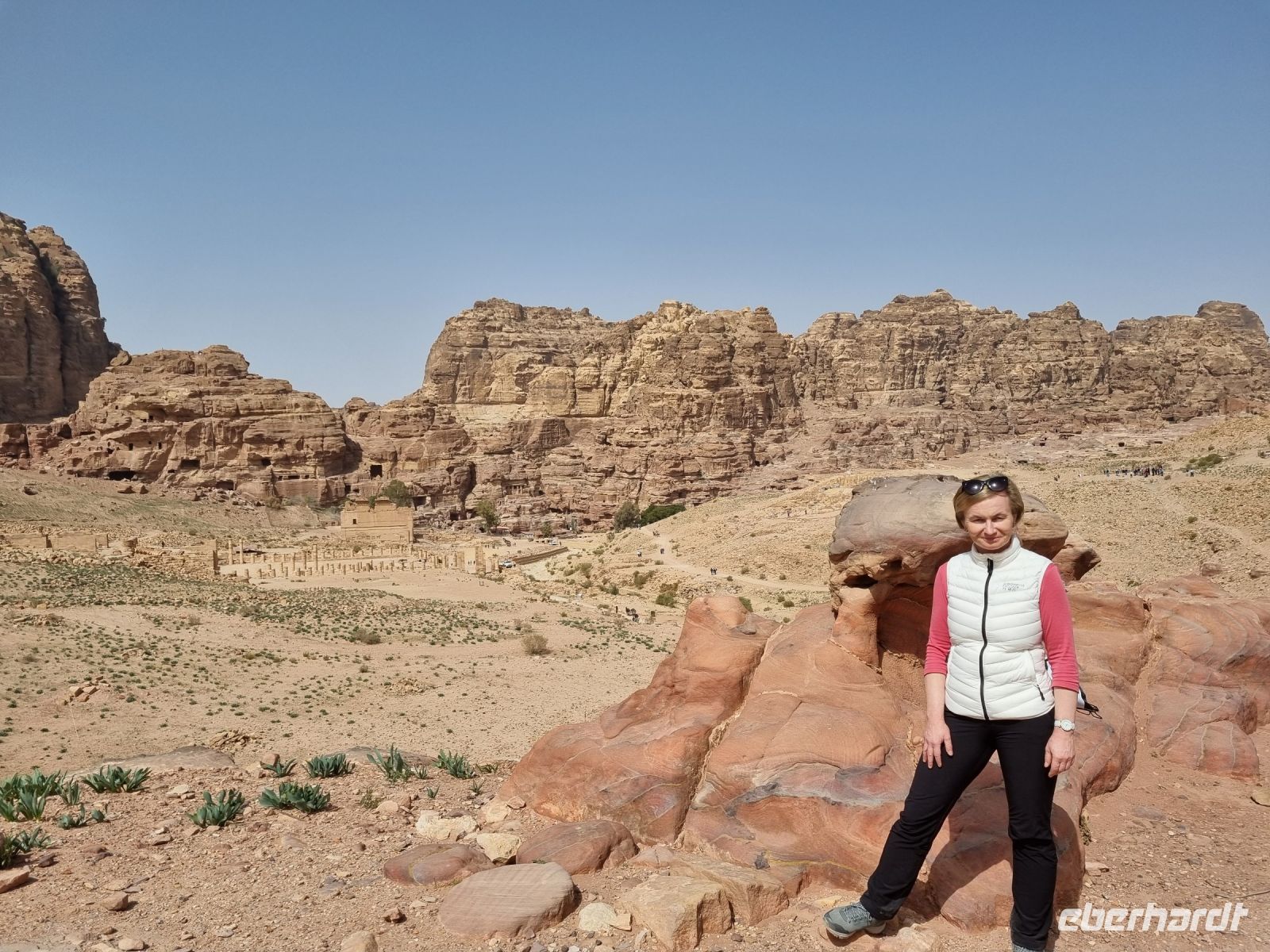 Am heutigen Tag hatten wir die Wahl - entweder auf eigene Faust die Felsenstadt Petra erkunden oder an einer geführten Wandertour mit Mahmoud und mir teilnehmen... Die meisten unserer Gäste entschieden sich für die gemeinsame ca. 10 Kilometer lange Wanderung durch die Felsenstadt. Wir starten erneut durch den Siq bis zum Schatzhaus und später in Richtung Opferplatz. Es waren zwar sehr viele Stufen, aber unsere Anstrengungen wurden mit überaus herrlichen Ausblicken über die Stadt belohnt. Wir stiegen über den Wadi Farash-Trail ab und kamen vorbei an der Löwenkaskade, dem Gartentempel mit dem Bunten Saal und auch am Grab des römischen Soldaten vorbei, bis wir schließlich Nahe des Theaters wieder die Hauptstraße erreichten. Die Tour endete am frühen Nachmittag mit einer Teepause. Den Rest des Tages konnten wir ganz individuell gestalten und am Abend trafen wir uns alle zu einem gemeinsamen Abendessen wieder, um uns über die unterschiedlichen Erlebnisse des Tages auszutauschen.