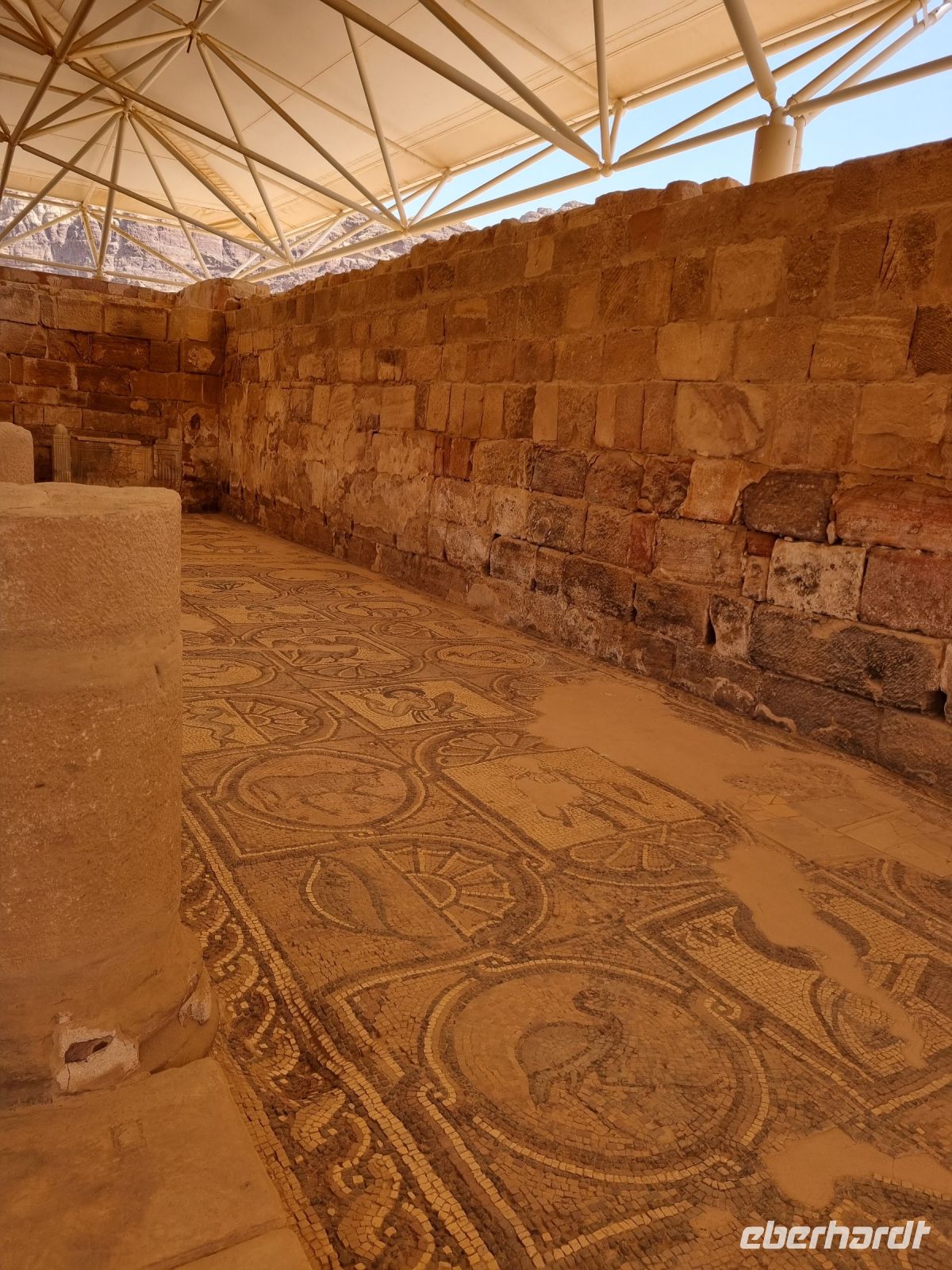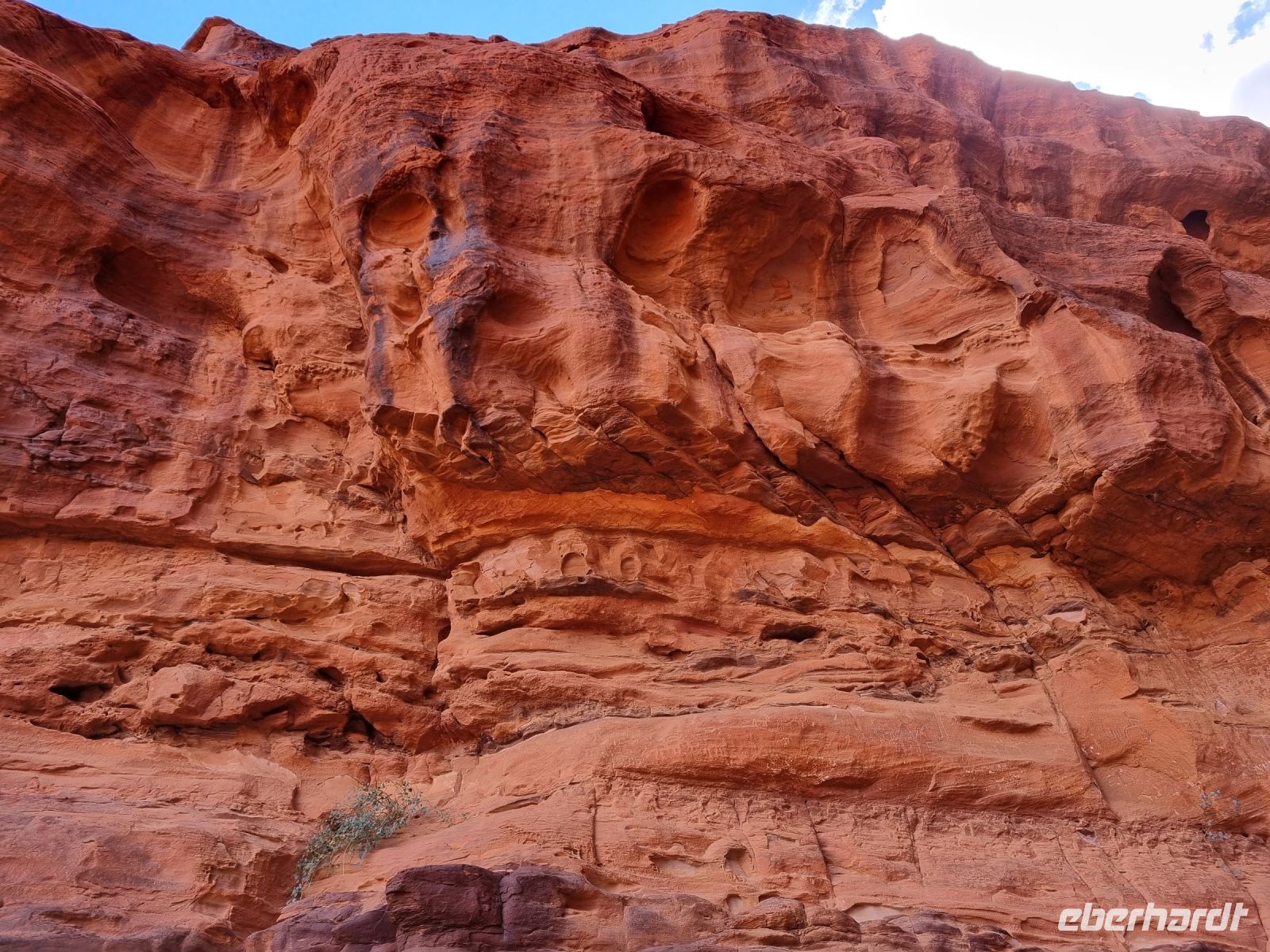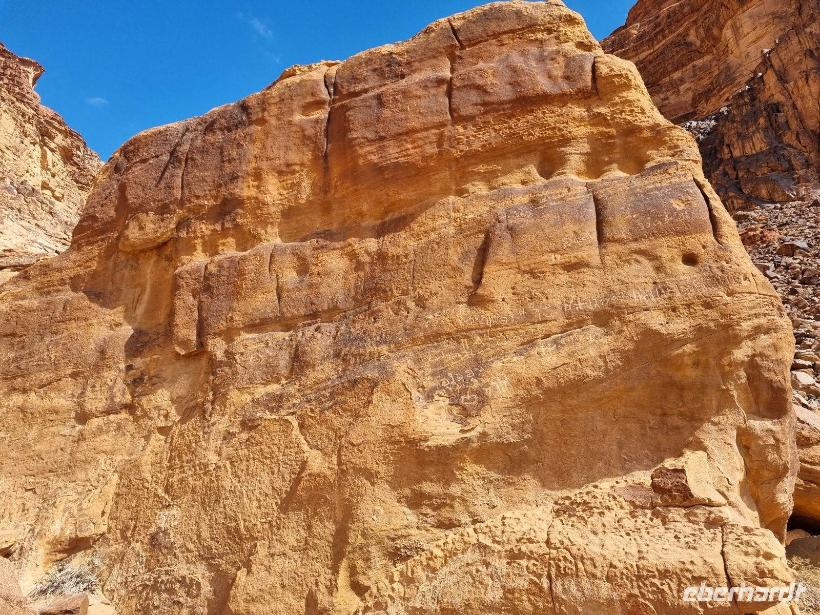 Mit vielen fantastischen Eindrücken der Felsenstadt Petra im Gepäck machten wir uns weiter gen Süden auf - unser heutiges Ziel hieß Aqaba am Roten Meer. Unterwegs steht allerdings noch ein Naturwunder namens Wadi Rum auf unserem Programm. Hierbei handelt es sich weniger um ein einzelnes Wadi, sondern um eine ganze Landschaft, welche durch Erosion geformt wurde. Archäologische Funde bewiesen, dass die Gegend nicht immer Wüste war, sondern in der Steinzeit hier sogar Ackerbau und Viehzucht betrieben wurde. Das zeigt sich vor allem im Siq al Khazali, einer engen Schlucht als Sackgasse, in der wir uralte Steinritzungen von Menschen, Tieren und noch nicht entschlüsselter Schriftzeichen bestaunen konnten. Doch erst einmal bestiegen wir die offenen Ladeflächen der Toyota-Vans, welche uns zunächst zur Lawrence-Quelle brachten, wo Lawrence von Arabien gebadet hat. Er fand diese Gegend dermaßen faszinierend, dass er sie in seinem Roman „Die sieben Säulen der Weisheit" unsterblich gemacht hat. Wem es übrigens auf der offenen Ladefläche durch den Fahrtwind zwischenzeitlich zu kalt wurde, der konnte auch im Innenraum der Fahrzeuge Platz nehmen. Nach dem Besuch der schon erwähnten al Khazali-Schlucht wurden wir in einem Beduinenzelt zum Tee eingeladen. Hier duftete es gut nach Weihrauch, den man auch käuflich erwerben konnte. Zu guter Letzt begaben wir uns noch zur Steinernen Brücke, wo Wind und Wetter einen Steinbogen geschaffen haben, über den man auch hinüberlaufen kann, sofern man schwindelfrei ist. Eine kleine Mittagspause bzw. noch ein letztes Bild von der Felsformation der "7 Säulen der Weisheit" und schon fuhren wir weiter nach Aqaba, dem südlichsten Punkt unserer Reise. Am Nachmittag erreichten wir die Stadt und bezogen unser Hotel "Mövenpick Resort". Nach der Erkundung der wunderschönen Anlage nahm so manch ein Reisegast ein Bad im Roten Meer. Unser Abendessen nahmen wir später im Restaurant "Suzana" ein, wo wir erneut mit leckeren arabischen Köstlichkeiten kulinarisch verwöhnt wurden. Abschließend unternahmen wir einen Verdauungsspaziergang zum unweit entfernten Souk, wo wir u. a. die verschiedensten orientalischen Gewürze näher kennenlernen und ggfs. auch letzte Mitbringsel erwerben konnten. Dieser abendliche Bummel rundete schließlich den Tag ab.