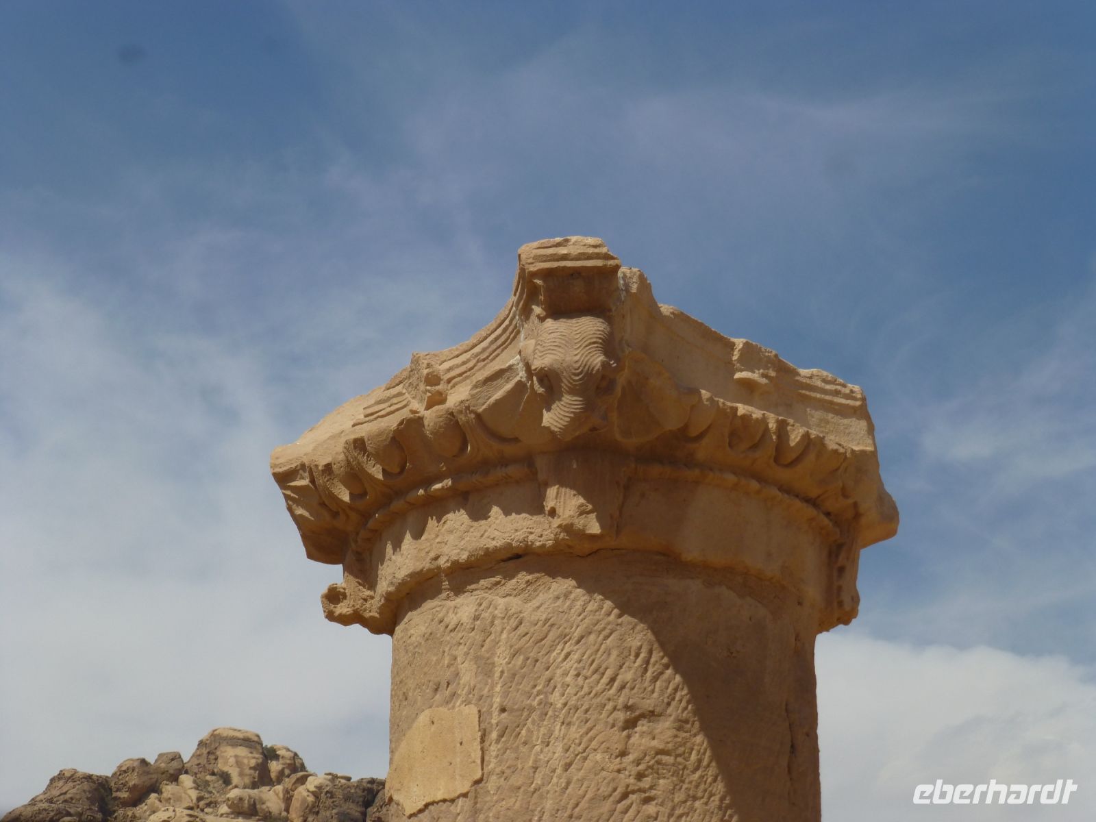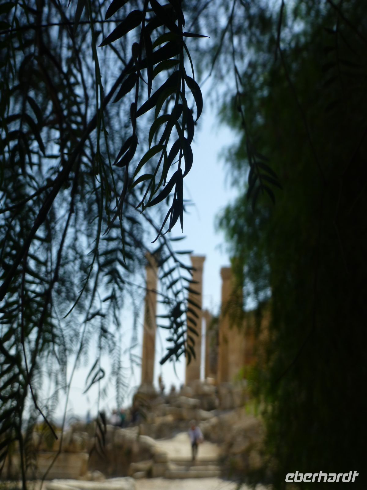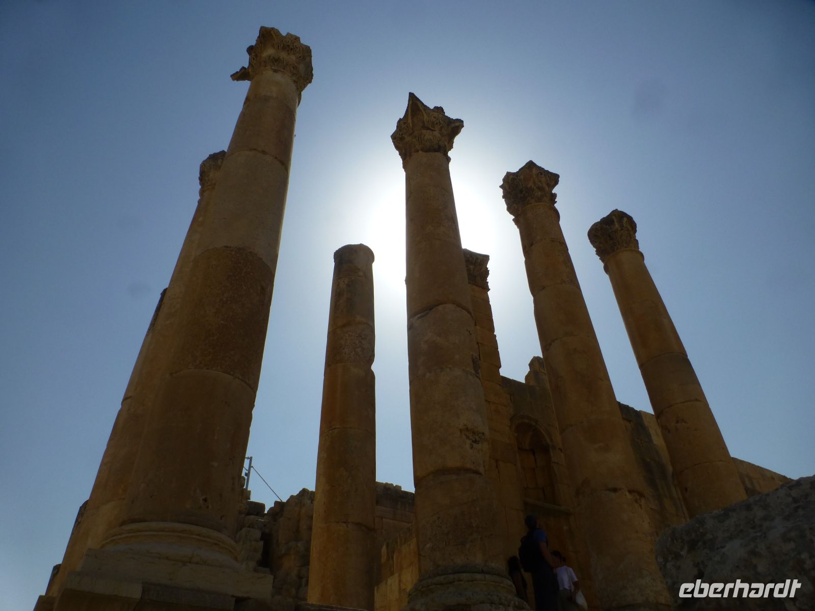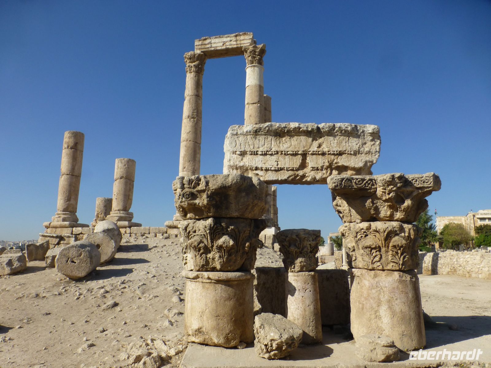 Die Zitadelle Jabal al-Qala führt vom Namen her in die Irre, denn es ist kein Burgberg, den wir besuchen, keine Befestigung, sondern vielmehr hat jede Kultur hier ihr Heiligtum errichtet, weithin sichtbar und nebeneinander. Und so ist ein Spaziergang durch die Kulturen, ein kurzer Abriss über die Herrscher dieses Landes. Es stellen sich vor: die Römer mit einem Herkulestempel aus der Zeit Marc Aurels, 2. Hälfte des 2. Jhs. n.Chr. Um die hohen Säulen mit ihren prächtigen Kapitellen zu errichten, brauchte es womöglich übernatürliche Kräfte. Die Byzantiner haben eine dreischiffige Basilika gebaut. Und der örtliche Gouverneur der Omaijaden ließ sich im frühen 8. Jh.n.Chr. seine Residenz bauen und integrierte die römische Kolonnadenstraße gleich, um sich und seine Herrschaft damit zu schmücken.
