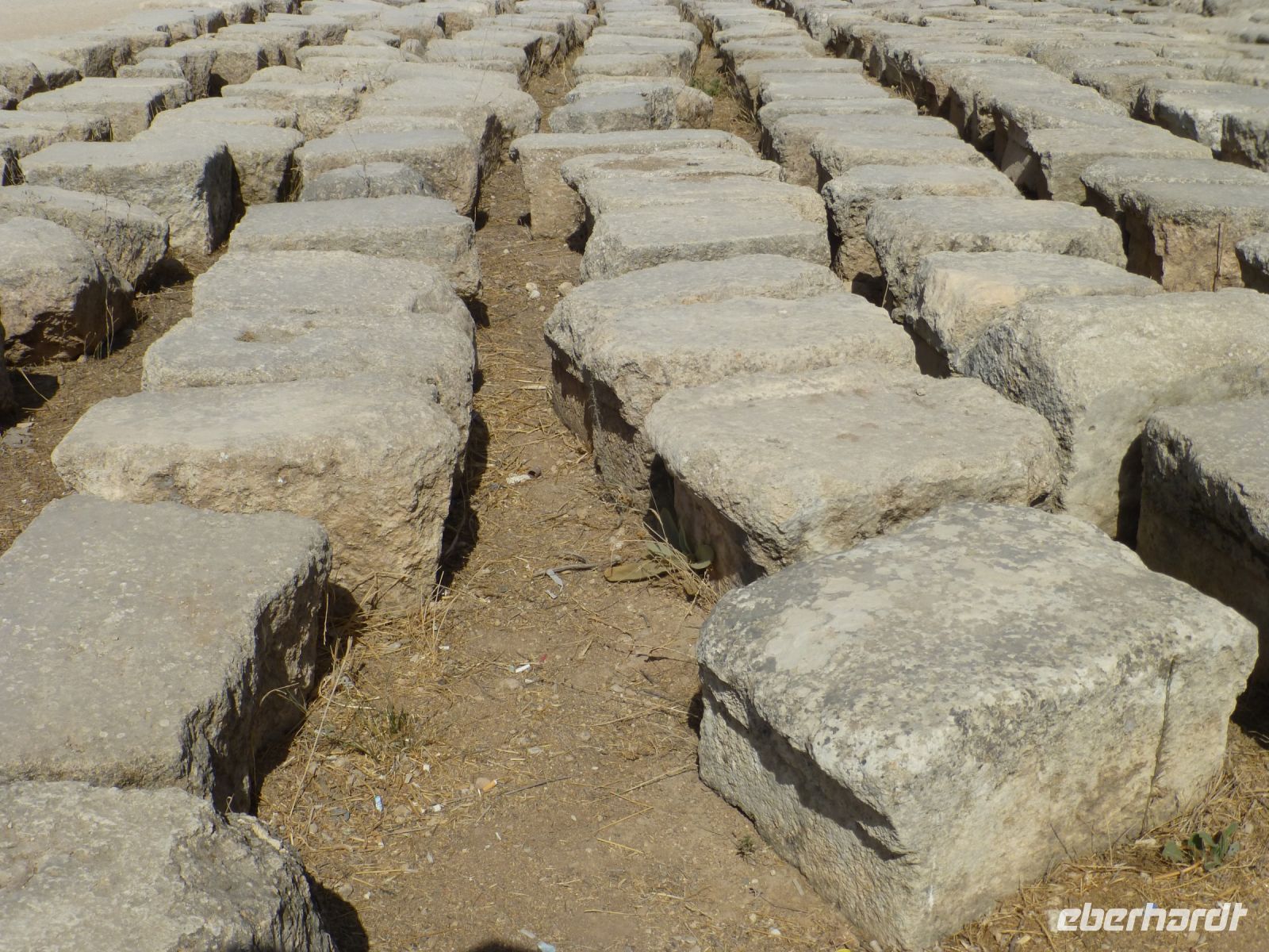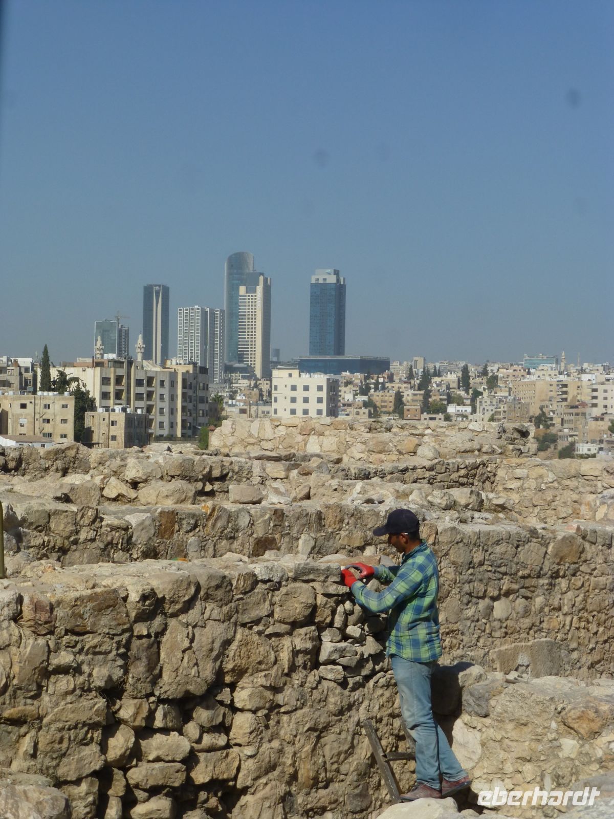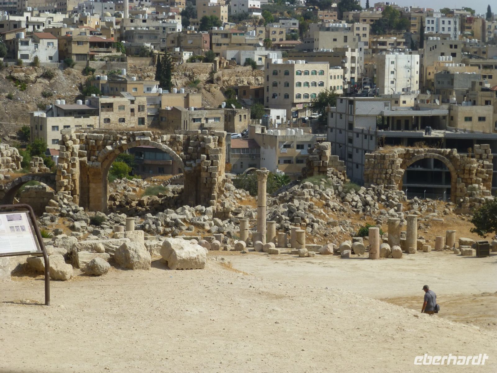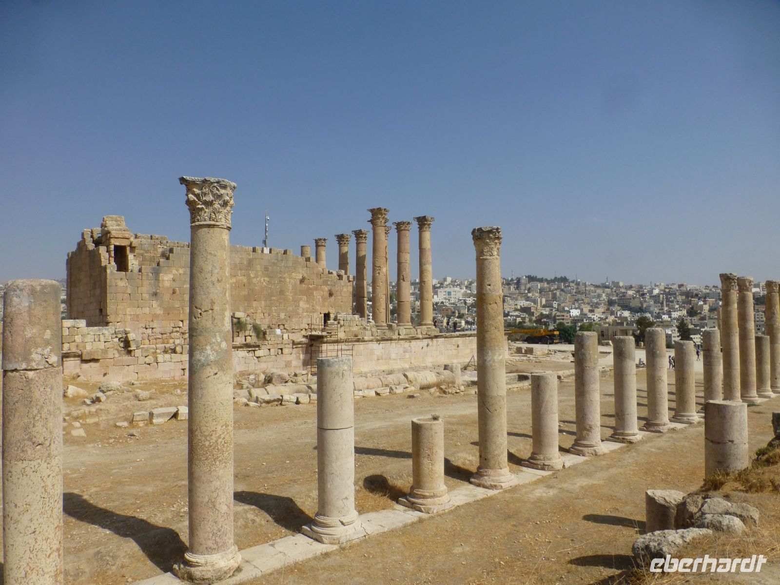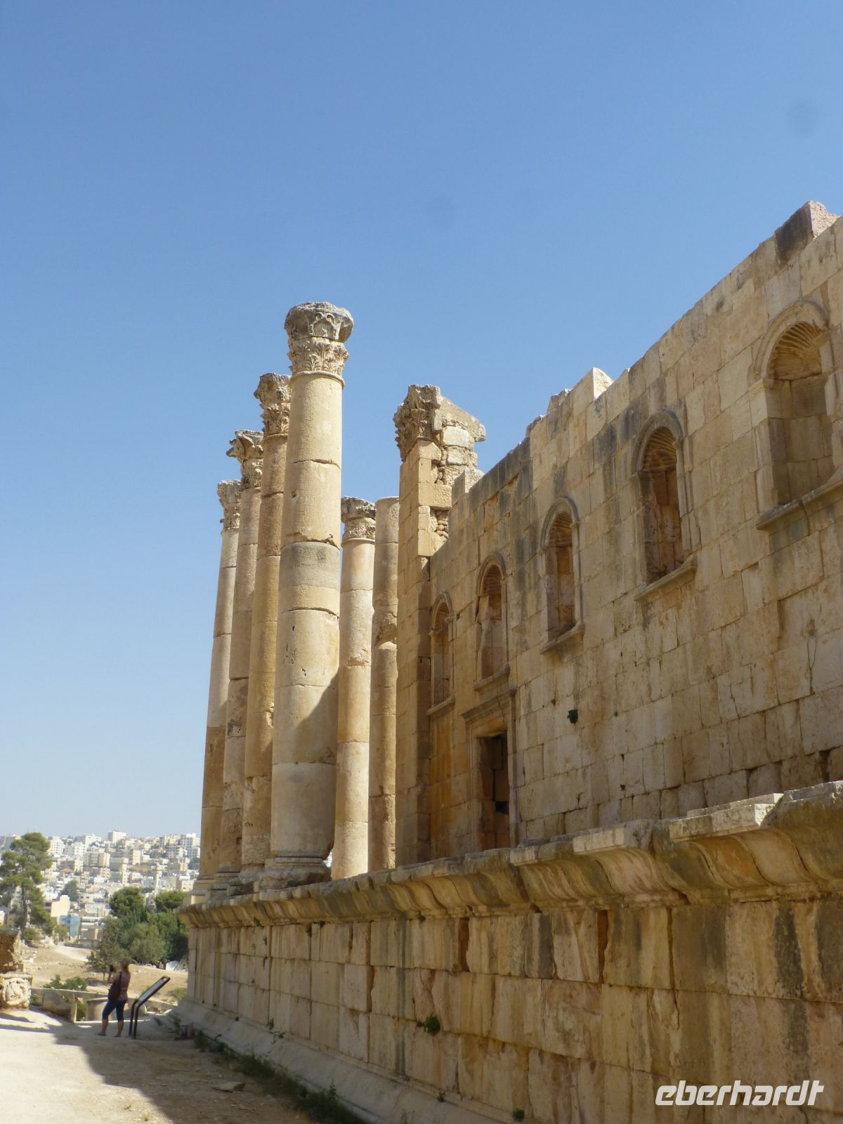 Die Zitadelle Jabal al-Qala führt vom Namen her in die Irre, denn es ist kein Burgberg, den wir besuchen, keine Befestigung, sondern vielmehr hat jede Kultur hier ihr Heiligtum errichtet, weithin sichtbar und nebeneinander. Und so ist ein Spaziergang durch die Kulturen, ein kurzer Abriss über die Herrscher dieses Landes. Es stellen sich vor: die Römer mit einem Herkulestempel aus der Zeit Marc Aurels, 2. Hälfte des 2. Jhs. n.Chr. Um die hohen Säulen mit ihren prächtigen Kapitellen zu errichten, brauchte es womöglich übernatürliche Kräfte. Die Byzantiner haben eine dreischiffige Basilika gebaut. Und der örtliche Gouverneur der Omaijaden ließ sich im frühen 8. Jh.n.Chr. seine Residenz bauen und integrierte die römische Kolonnadenstraße gleich, um sich und seine Herrschaft damit zu schmücken.