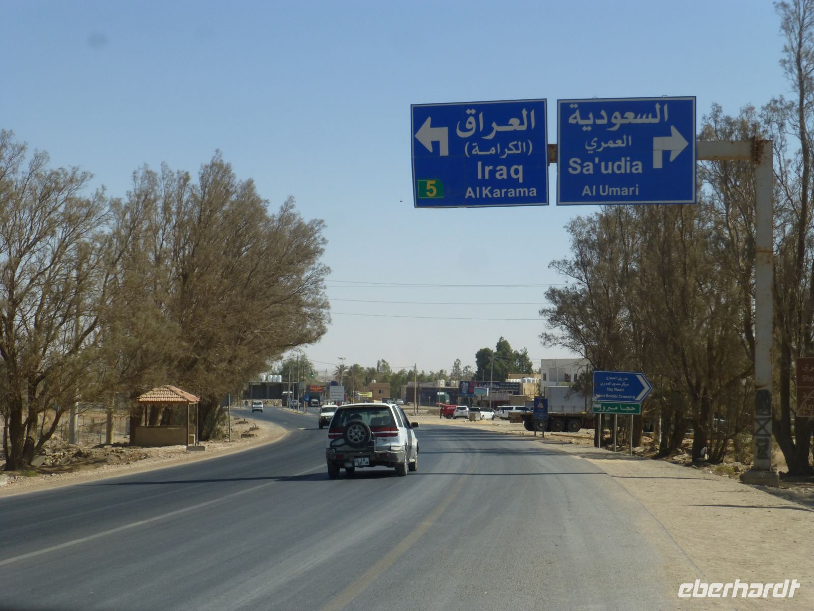 Es gäbe noch so manches zu gucken, doch die Wüstenschlösser der Omaijaden, die als wichtige Zeugnisse der frühislamischen Epoche gelten, locken. Und so stehen wir nach rund einer Stunde Fahrt Richtung Osten vor einer entscheidenden Abzweigung: rechts geht es nach Saudi-Arabien, links nach Syrien. Diese Länder spielen in der Tagesschau eine Rolle und so fühlen wir uns hier ganz weit weg von Zuhause. Wir nehmen die Straße nach links und haben es zum Glück nicht mehr weit. Eigentlich sind wir schon mittendrin - in der Oase Azraq, an der sich die Karawanenrouten kreuzten: von und nach Saudi-Arabien, Irak und Syrien und der Mittelmeerküste. Und wo jeder Reisende nach Tagen und Nächten durch die Wüste auf schaukelnden Dromedarrücken neue Kräfte tankte.
