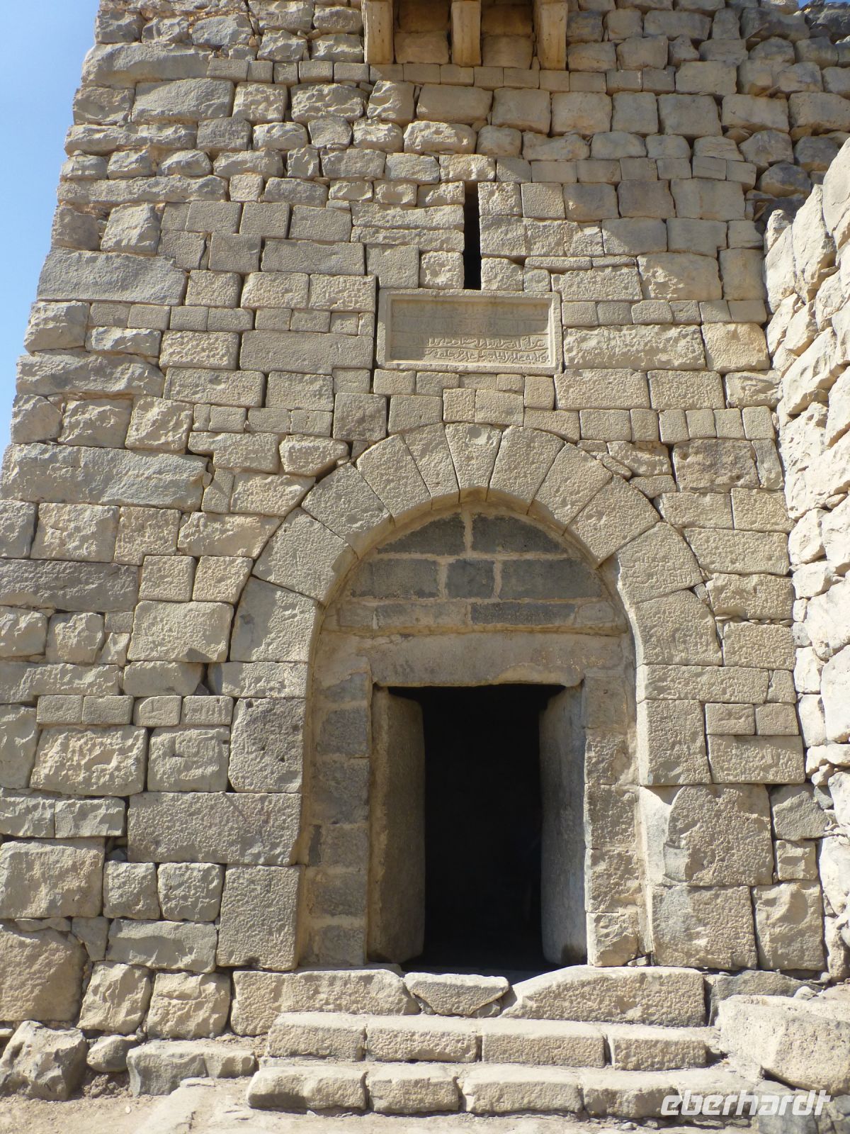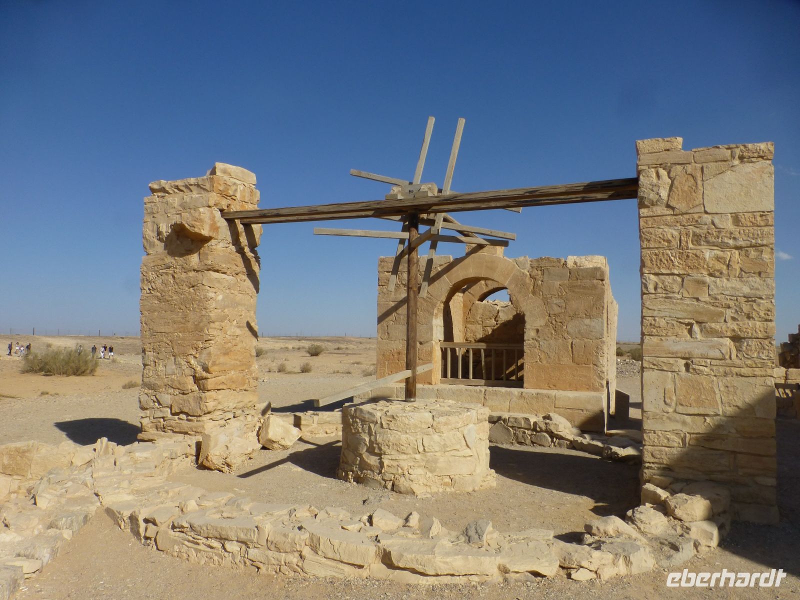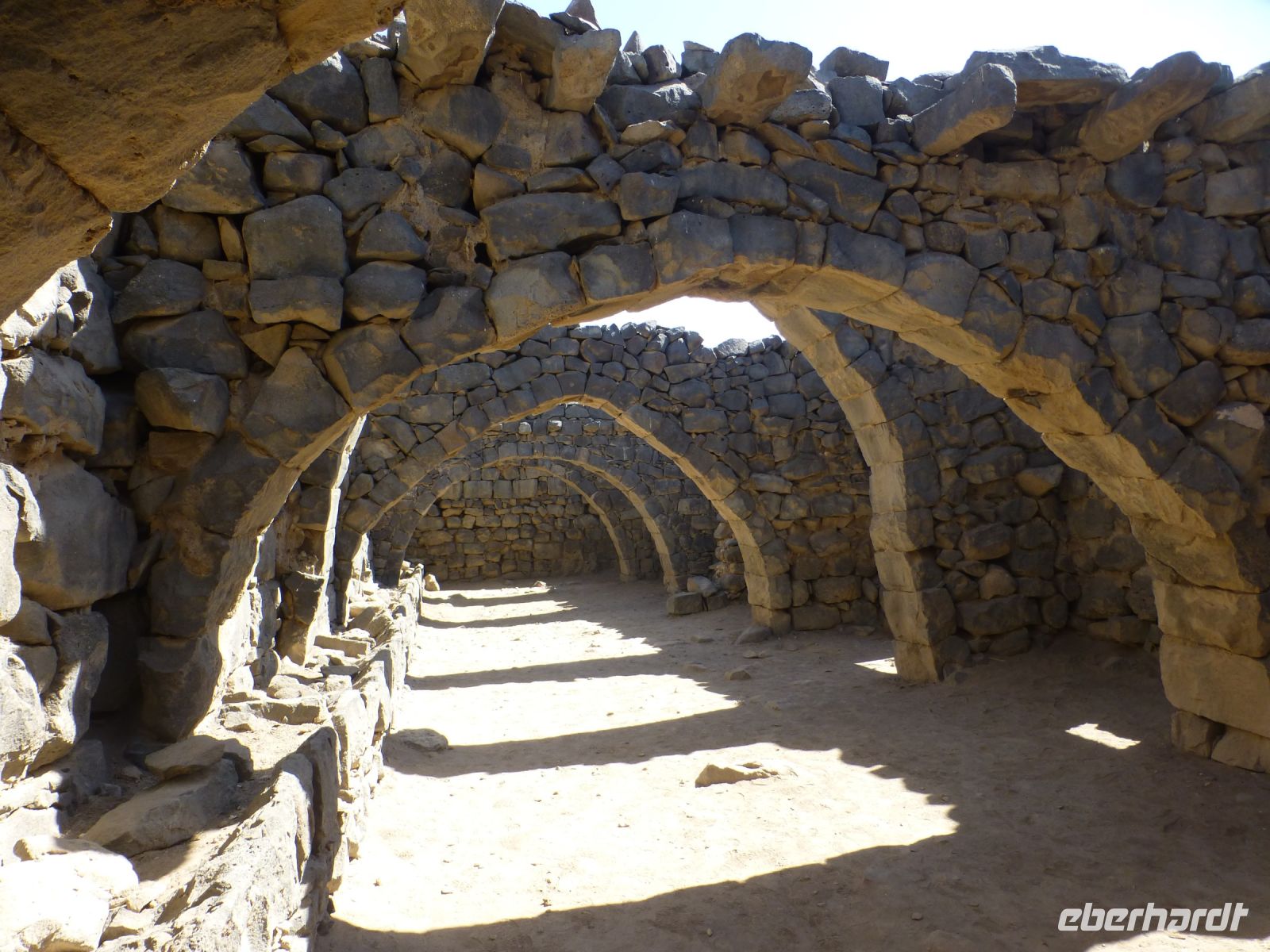 Hier steht das Fort Qasr Azraq, das zur römischen Zeit Straße und Oase gesichert hat, später dann den Kreuzrittern Widerstand leistete. Da Holz Mangelware war, gab, baute man Dachstuhl und Estrich aus zugehauenen Steinblöcken, die noch sehr robust die eine oder andere Decke tragen und auf festen Wänden ruhen. Das Eingangstor sowie die Fluchttür sind aus Stein gehauen wie auch die Angeln. Wie mag sich die Tür gedreht haben?