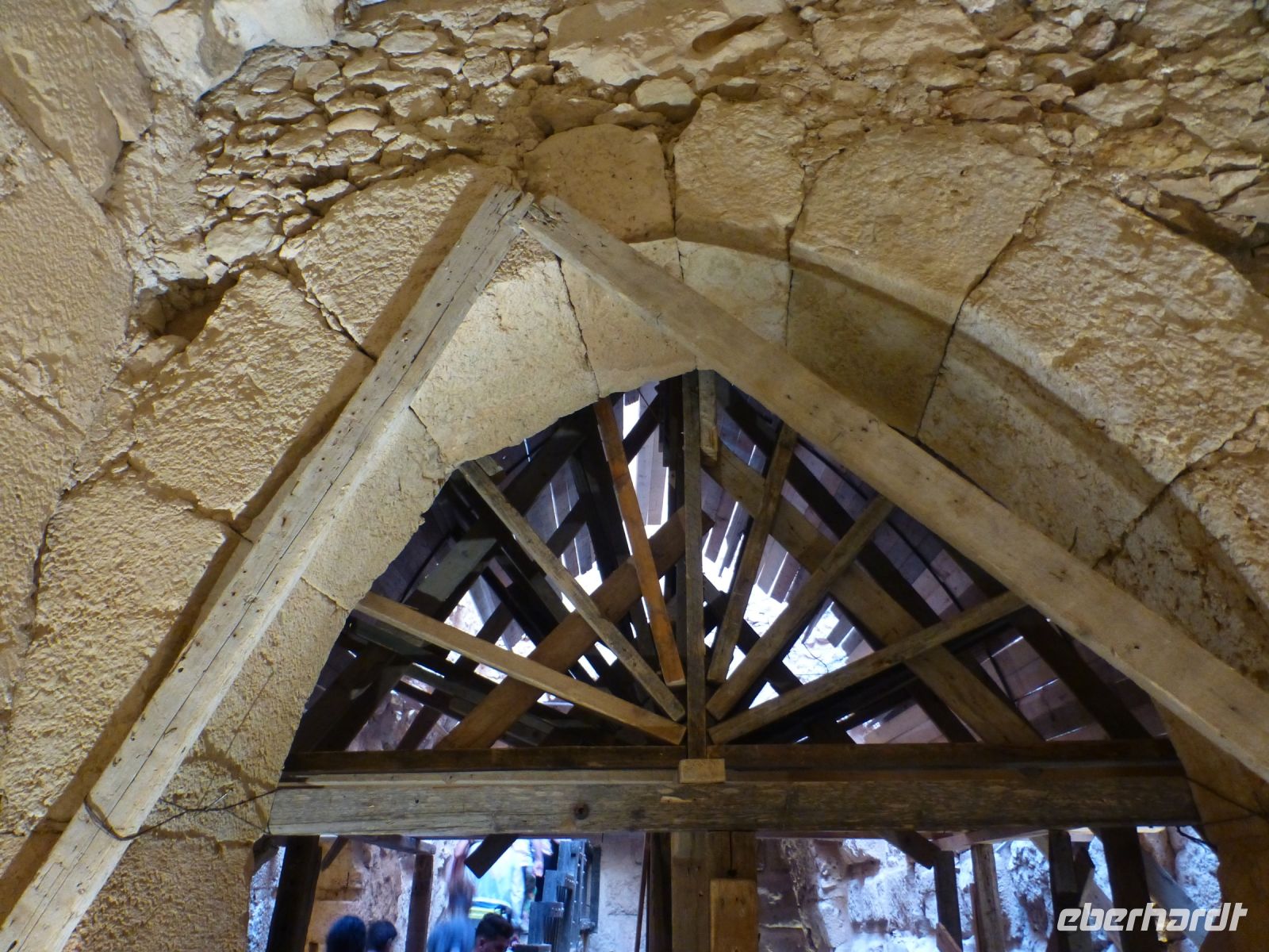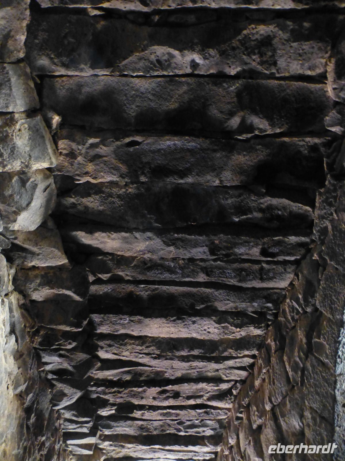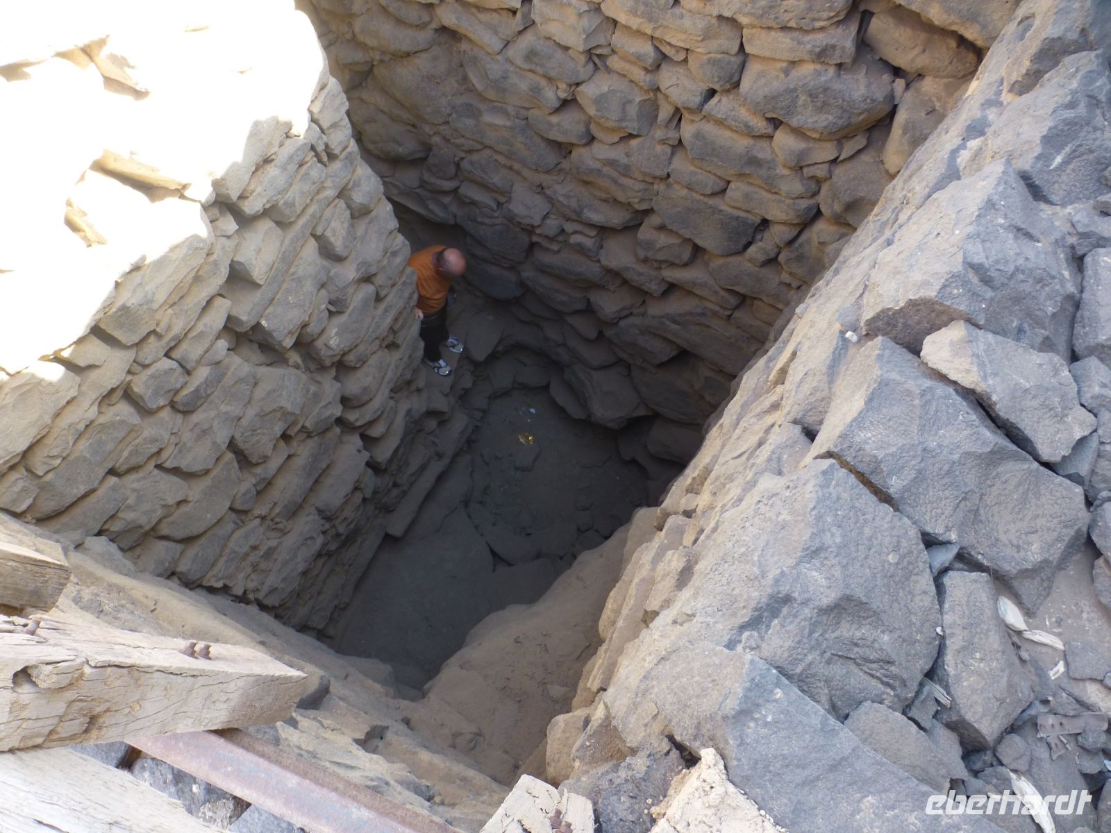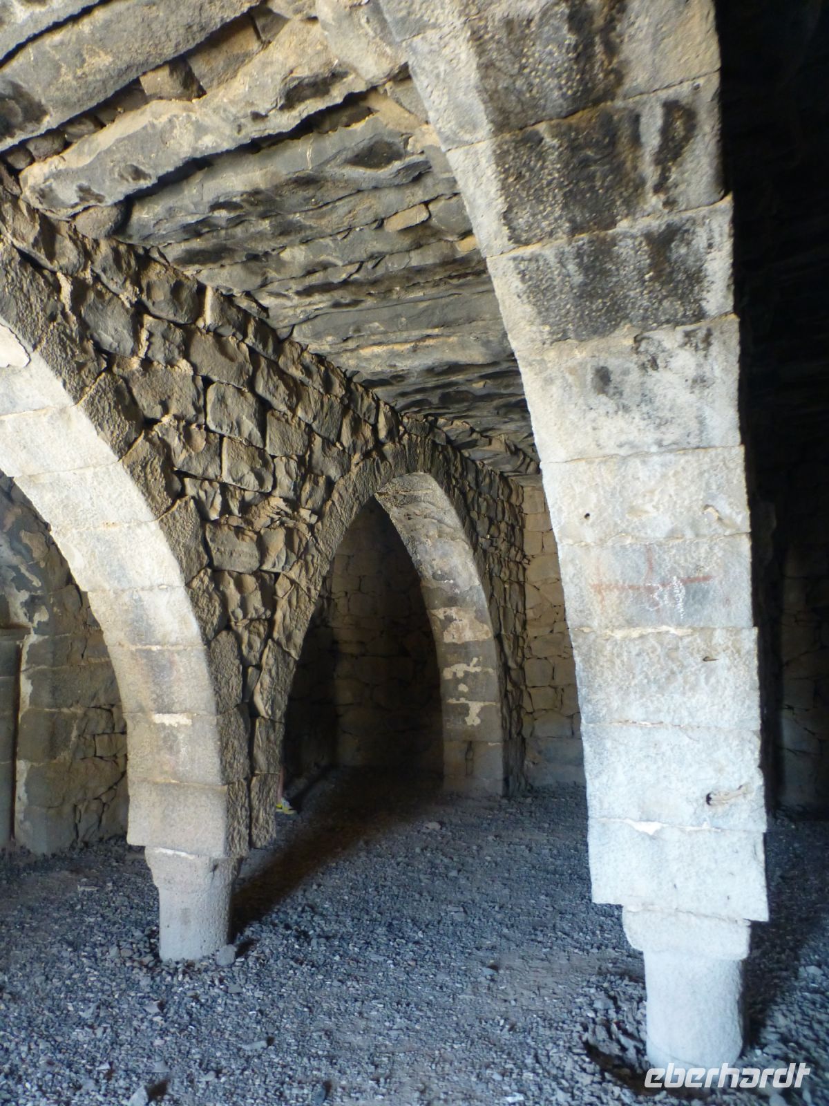 Hier steht das Fort Qasr Azraq, das zur römischen Zeit Straße und Oase gesichert hat, später dann den Kreuzrittern Widerstand leistete. Da Holz Mangelware war, gab, baute man Dachstuhl und Estrich aus zugehauenen Steinblöcken, die noch sehr robust die eine oder andere Decke tragen und auf festen Wänden ruhen. Das Eingangstor sowie die Fluchttür sind aus Stein gehauen wie auch die Angeln. Wie mag sich die Tür gedreht haben?
