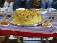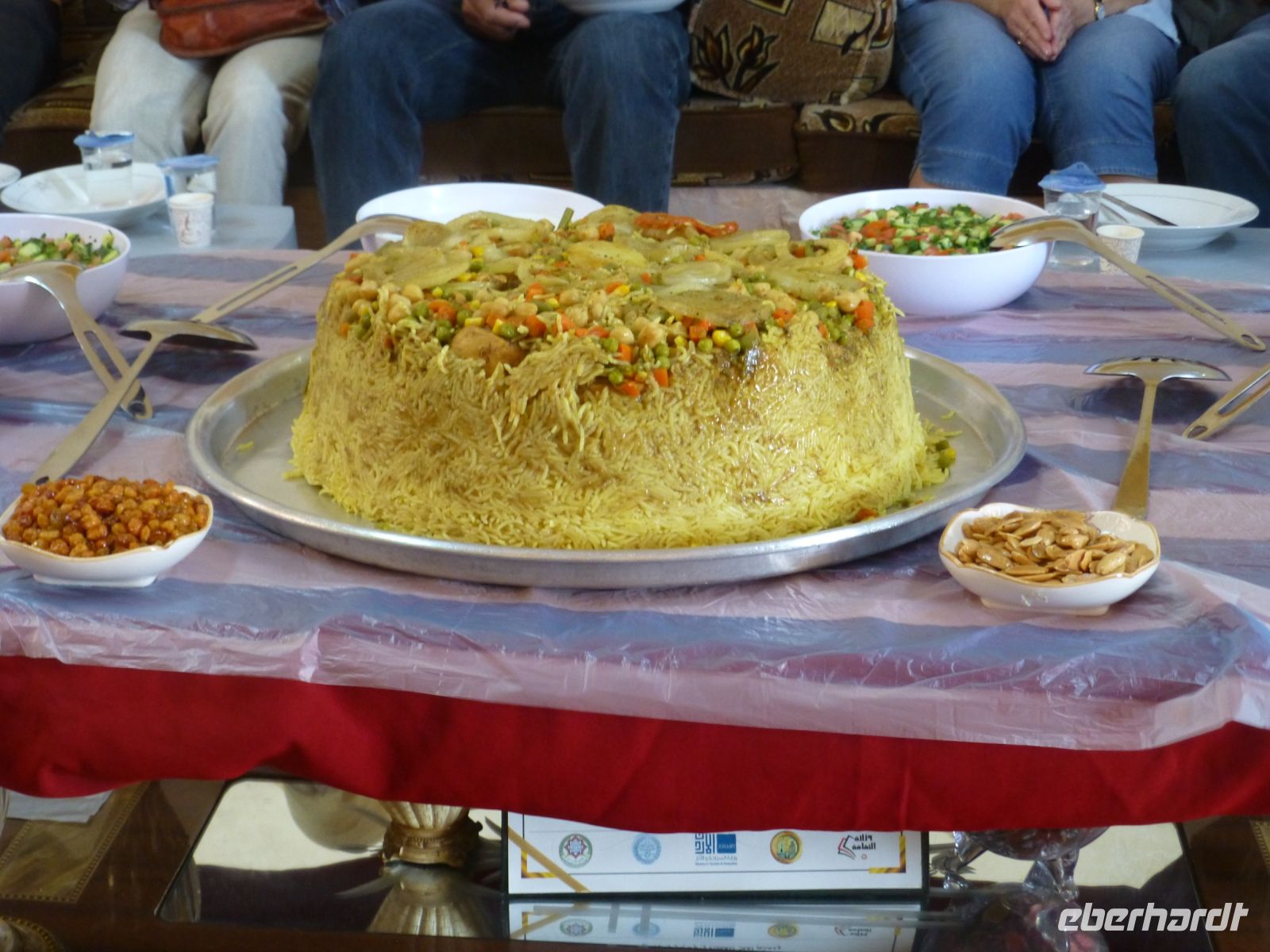 Das Mittagessen ist eine wunderschöne Überraschung, denn wir sind bei einer drusischen Familie eingeladen. Wir sitzen auf Polsterbänken den Wänden entlang und werden mit einem mit Kardamon gewürzten Kaffee begrüßt. Es gibt „Magluba“ „umgestürztes Huhn“, so nenne ich es. Hier das Rezept in Kürze: Die Hühnerteile werden mit Zwiebeln angebraten, Kardamon, Ingwer, Kurkuma, Zimt und evtl Curry dazugeben und mitrösten, Reis dazugeben, mitrösten, dann Wasser dazu gießen, abhängig von der Menge Reis, und Erbsen sowie kleingeschnittene Möhren hinzugeben, salzen und pfeffern, abschmecken und vor sich hingaren lassen. Wenn der Reis fertig gegart ist, eine große Platte auf den Topf legen und das Ganze umdrehen. Dann den Topf langsam hochheben und auf der Platte präsentiert sich das umgestürzte Huhn. Nach dem Essen wird uns ein Tee mit Salbei kredenzt, sehr bekömmlich. Der Sohn des Hauses, ein junger Mann, bewirtet uns während die Mama in der Küche steht.