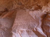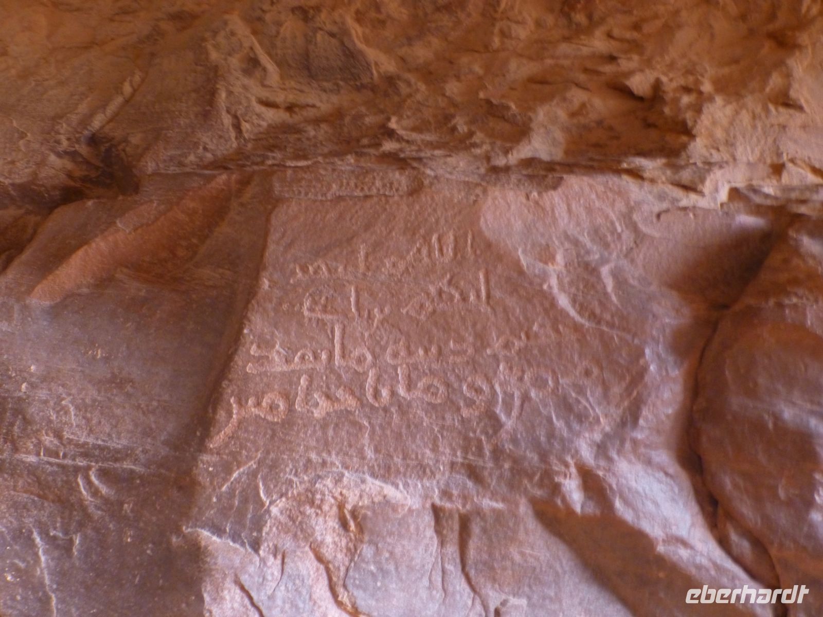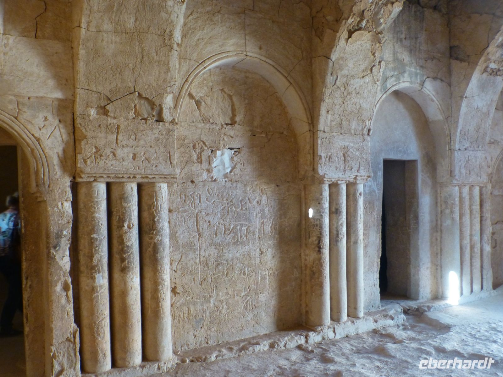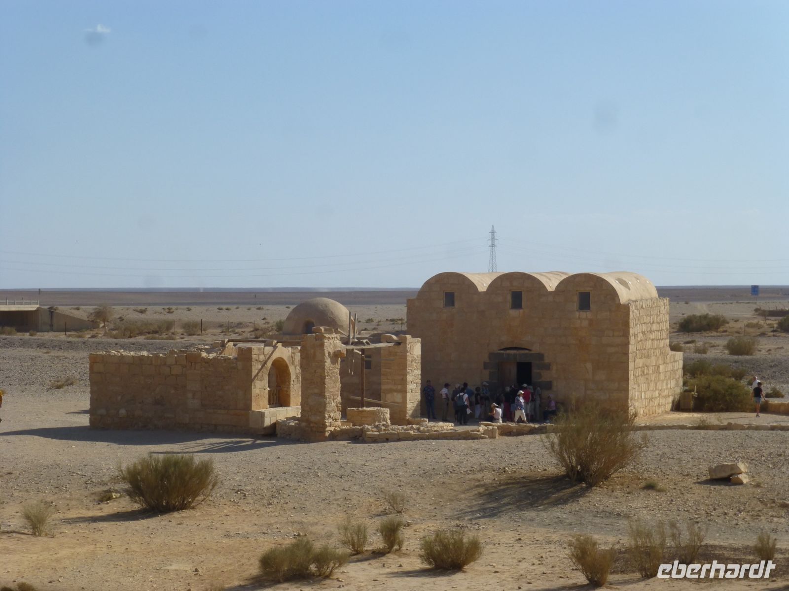 Nicht auf einem Wüstenschiff, doch mit dem Bus geht es zum letzten Besichtigungsort für heute: Qasr-al-Kharana. Die einen deuten es als Festung, dieser viereckige, fensterlose Bau, die anderen als Karawanserei. Eine früharabische Inschrift – eher ein Graffiti – besagt, dass dieses Gebäude bereits 711 stand und somit in der Zeit Kalif Walid I.liegt, von dessen Jagdschlösschen wir gerade kommen. Der Gedanke an eine Karawanserei gefällt mir und passt zu dem, was wir heute gesehen und erfahren haben. Wir durchlaufen die zwei Stockwerke treppauf, treppab, besteigen unsere motorisiertes Wüstenschiff und fahren zurück nach Amman.