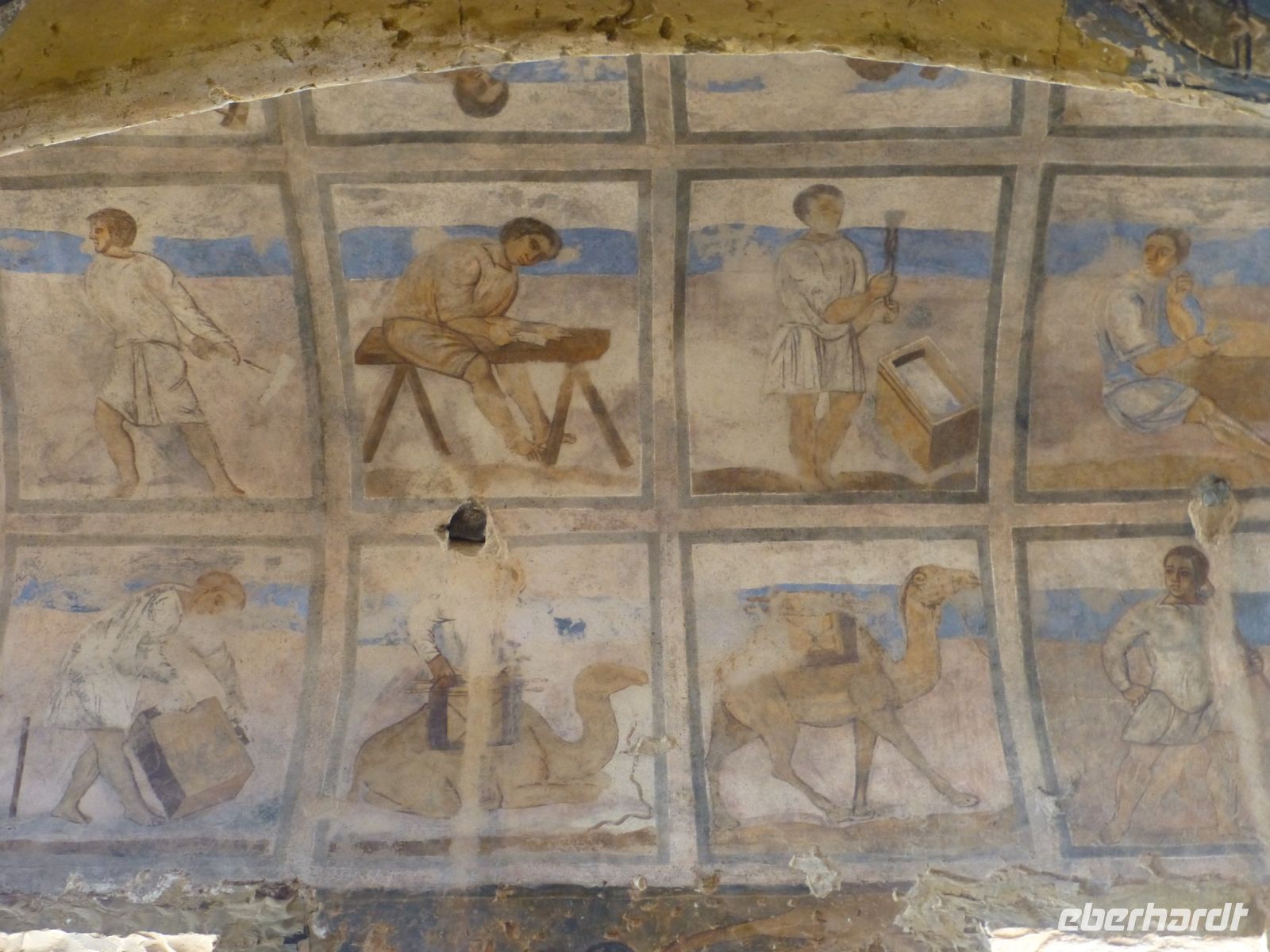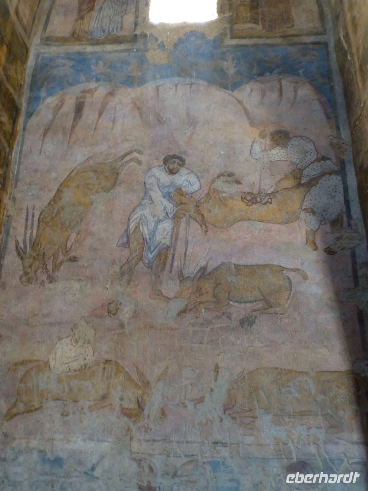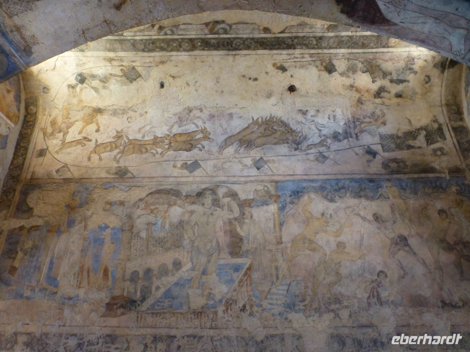 Wir brauchen unsere Phantasie für das kleine Lustschloss Qusair Amra, das in der ersten Hälfte des 8. Jhs. n. Chr. errichtet worden ist. Kalif Walid I. lud hier ein zur Jagd auf Antilopen, ließ vielleicht auch Falken Jagd auf Beute machen. Es war ein Ort, an dem man damals gerne verweilte. Die Lebensfreude teilt sich über die Fresken mit, für die das kleine Anwesen berühmt ist. Jagdszenen, nackte Badende, Musikanten – die Erzählfreude ist groß. Und diese gut erhaltenen Fresken beweisen auch, dass das Verbot im Islam, naturgetreue Bildnisse anzufertigen, erst später kam.