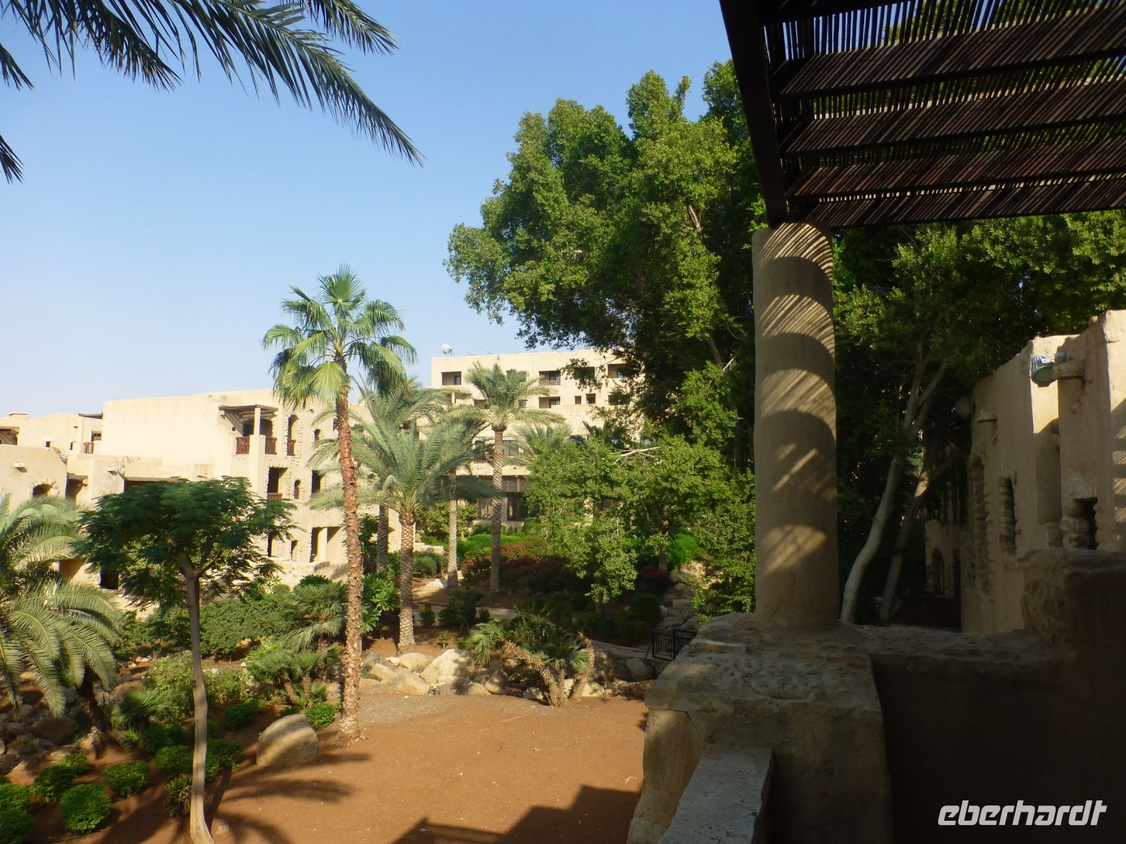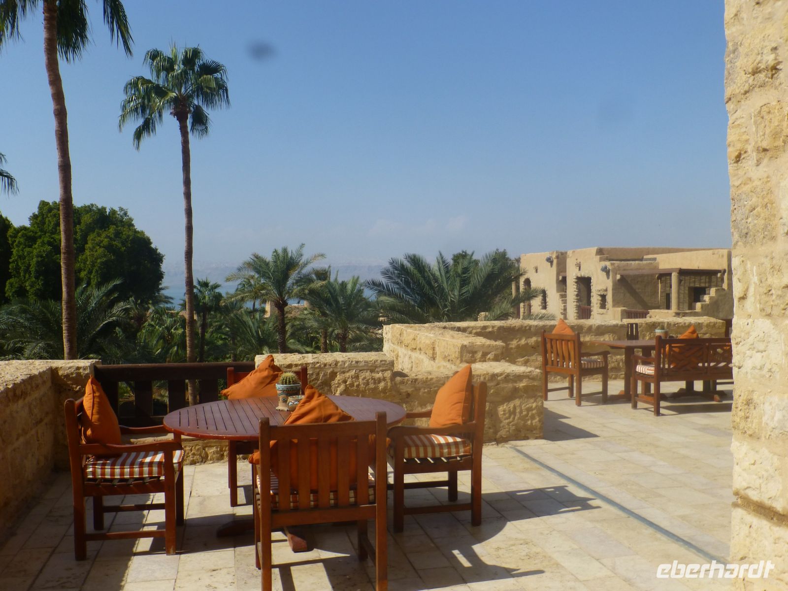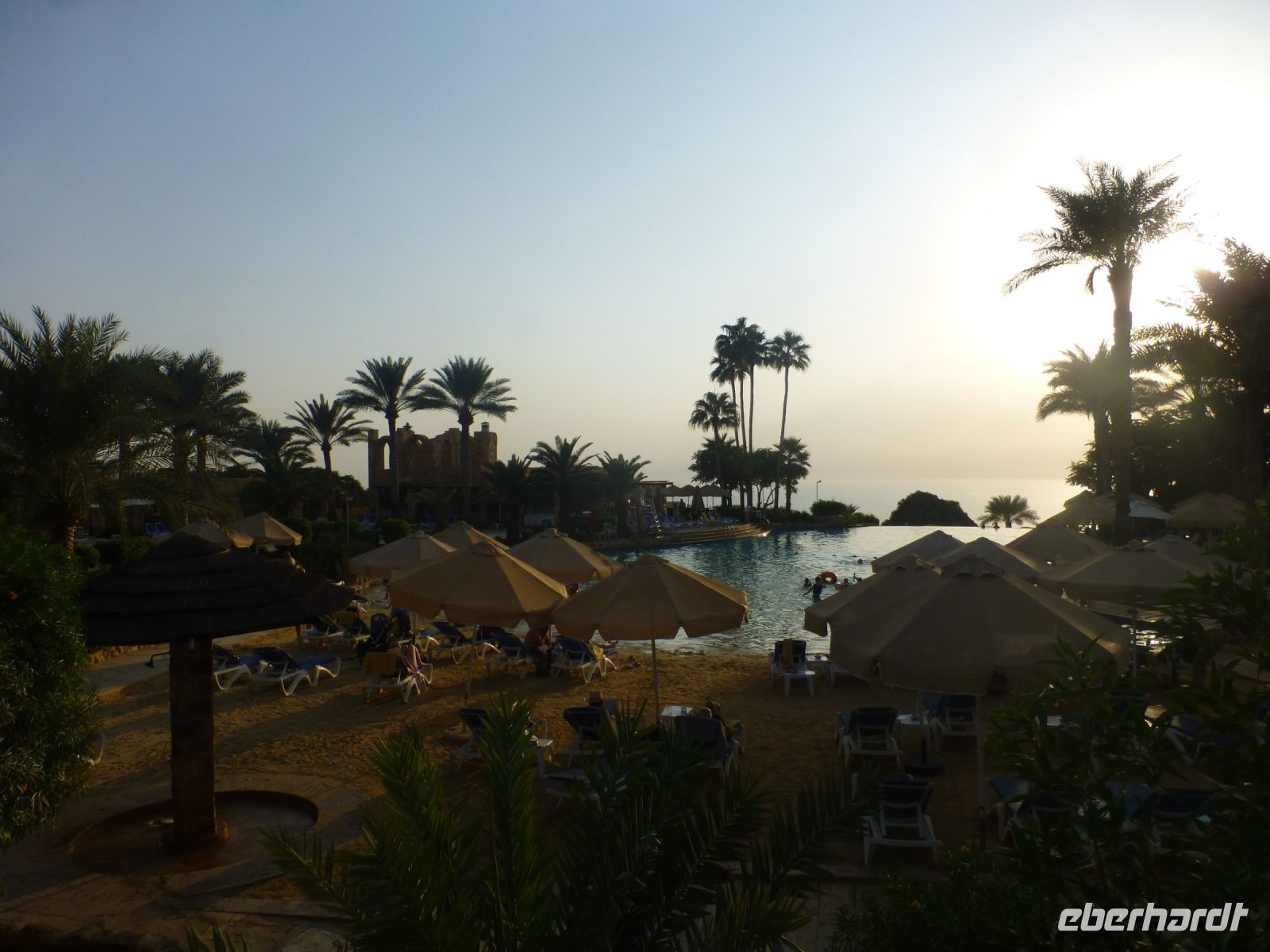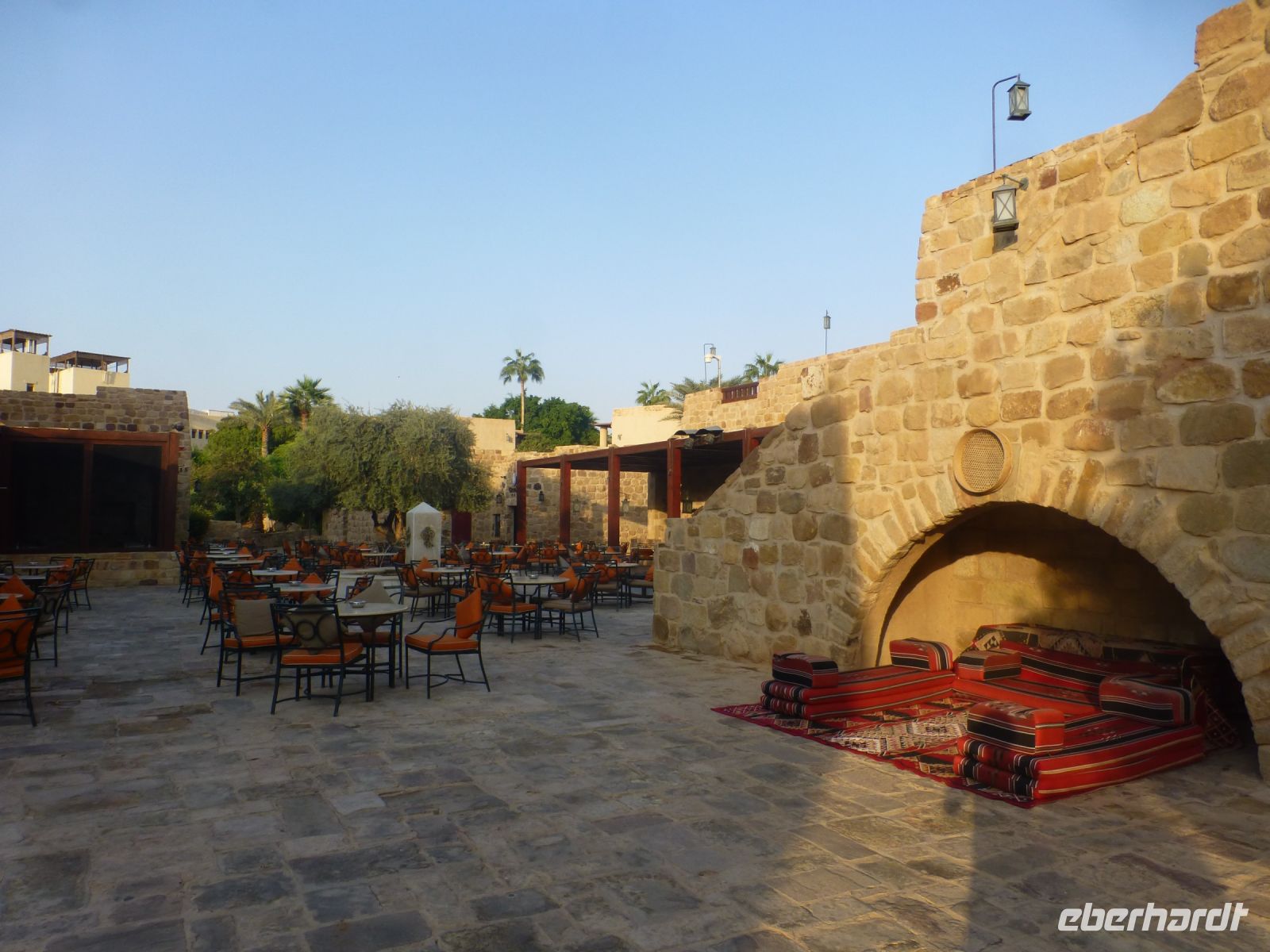 Als wir uns selbst überlassen sind, nehmen wir wahr, in welches zauberhafte Resort es uns verschlagen hat. Wie eine Karawanserei ist das Hotel gebaut, ein Dörfchen inmitten einer Oase, mit Plätzen, Brunnen, Brücken und Treppen. Jedes Zimmer hat eine Terrasse oder einen Balkon. Es gibt zwei Pools, eine Aktionsfläche, auf der den ganzen Tag über Programm läuft, einen Marktplatz mit Restaurant und Bühne und den Zugang zum Toten Meer.