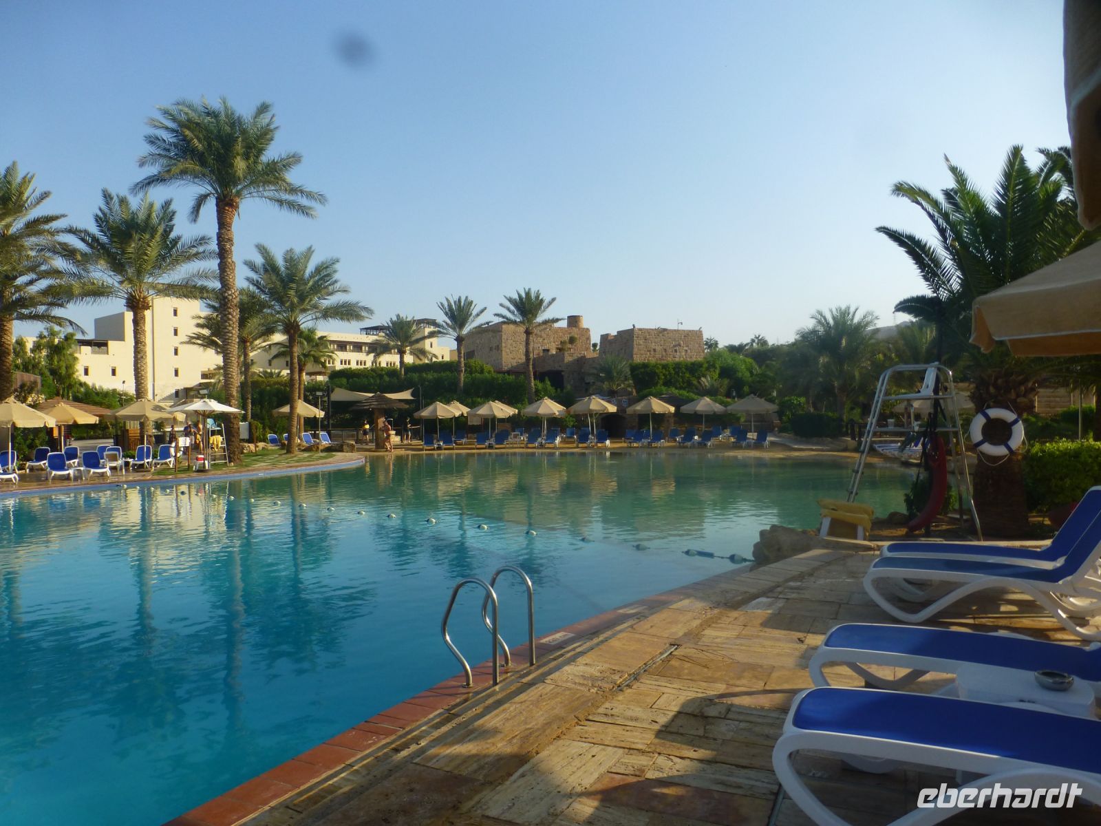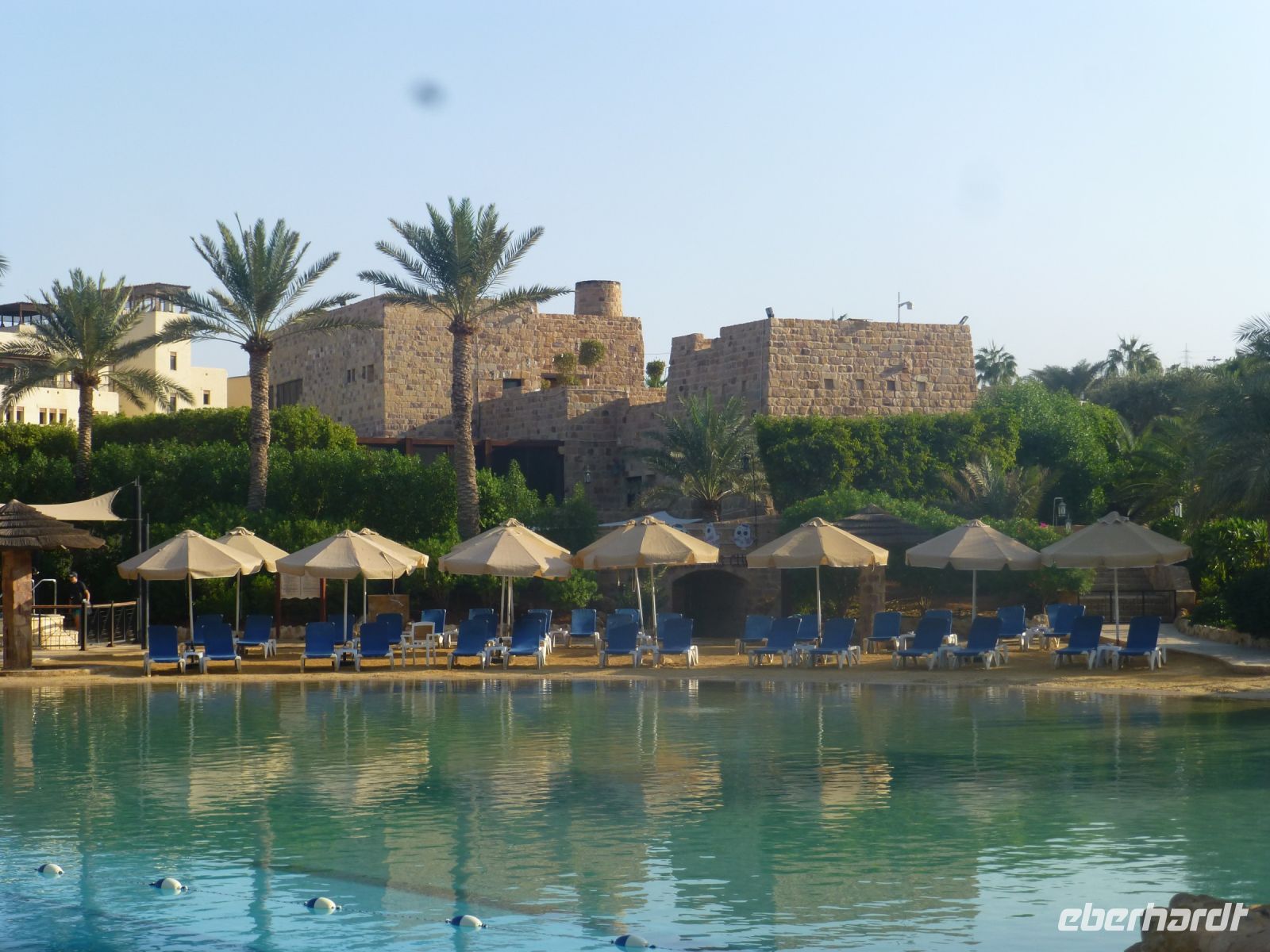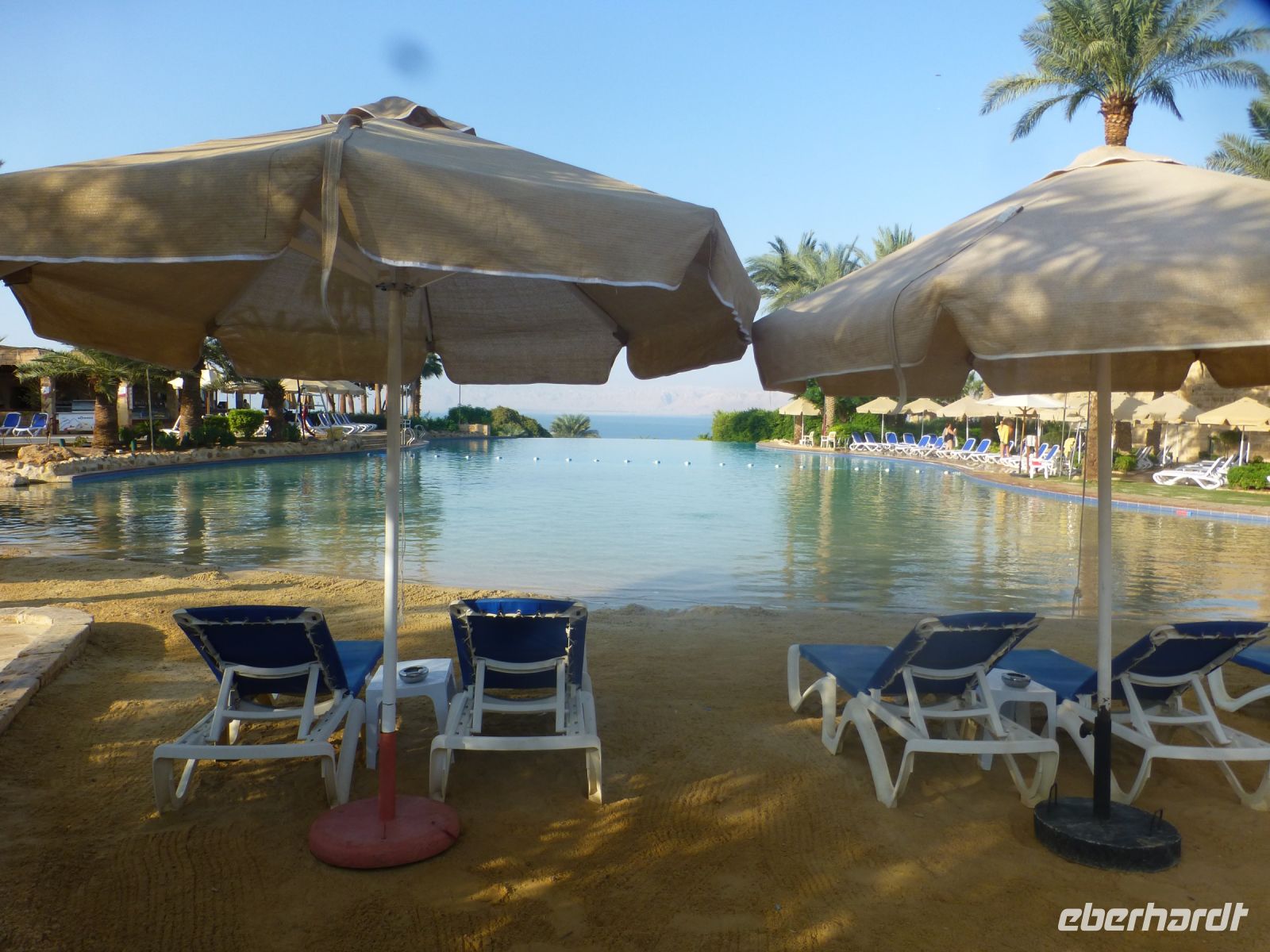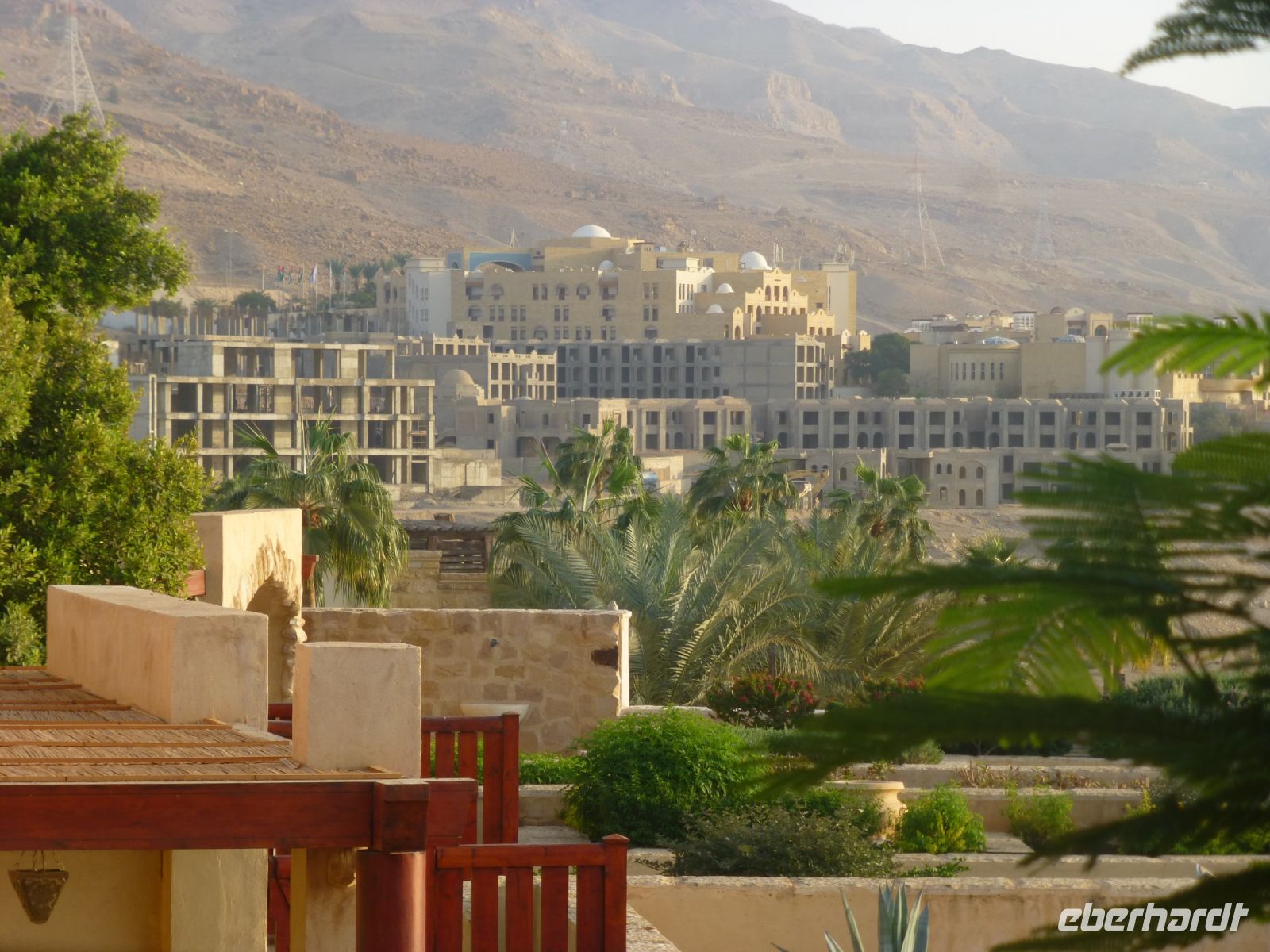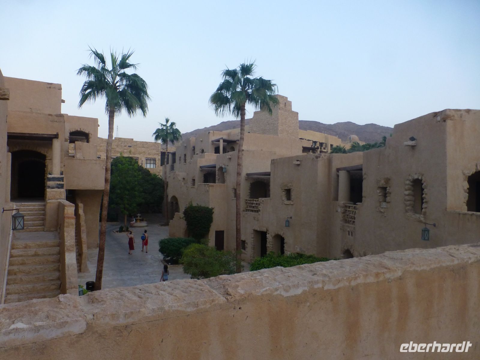 Als wir uns selbst überlassen sind, nehmen wir wahr, in welches zauberhafte Resort es uns verschlagen hat. Wie eine Karawanserei ist das Hotel gebaut, ein Dörfchen inmitten einer Oase, mit Plätzen, Brunnen, Brücken und Treppen. Jedes Zimmer hat eine Terrasse oder einen Balkon. Es gibt zwei Pools, eine Aktionsfläche, auf der den ganzen Tag über Programm läuft, einen Marktplatz mit Restaurant und Bühne und den Zugang zum Toten Meer.