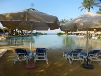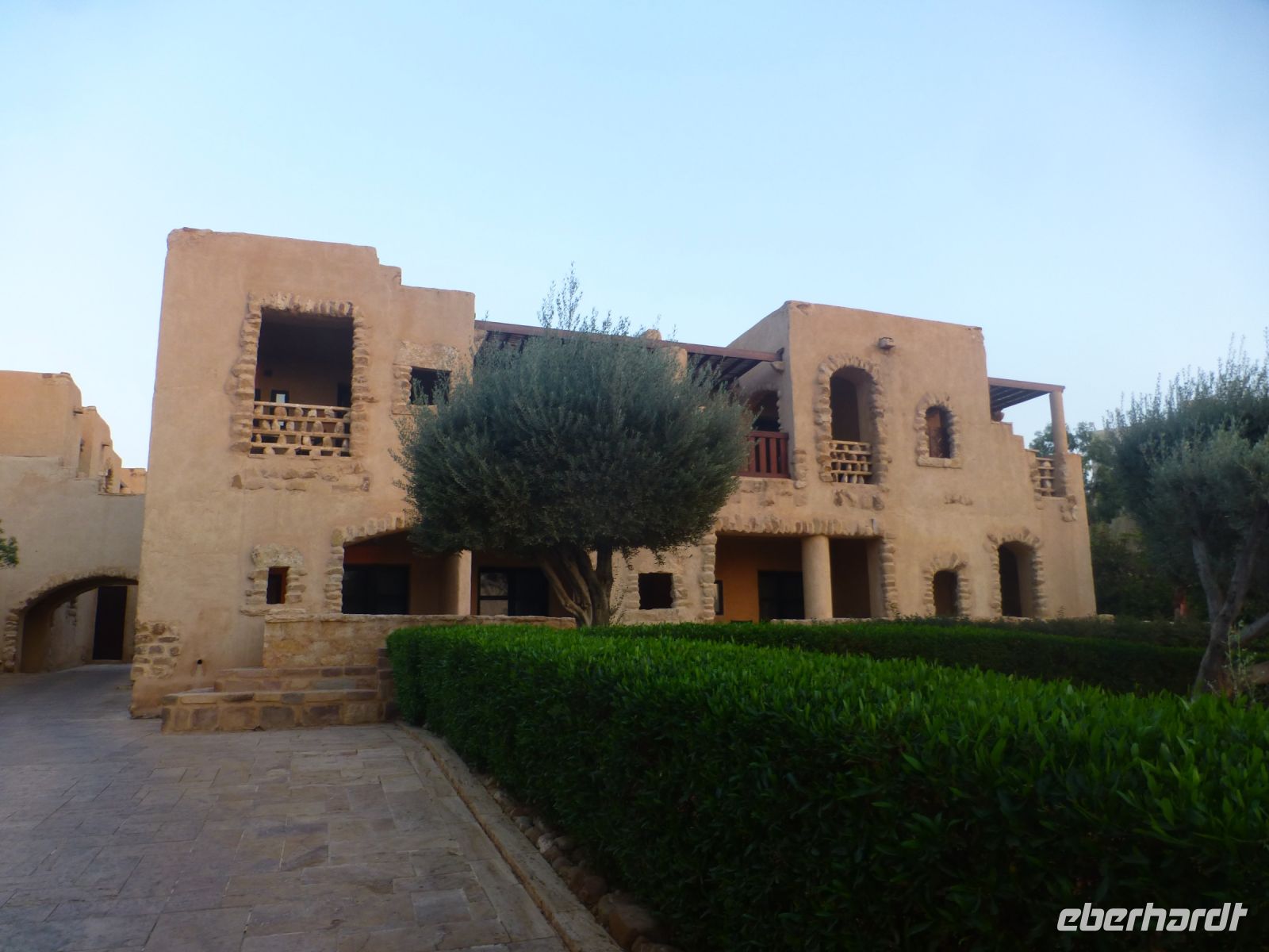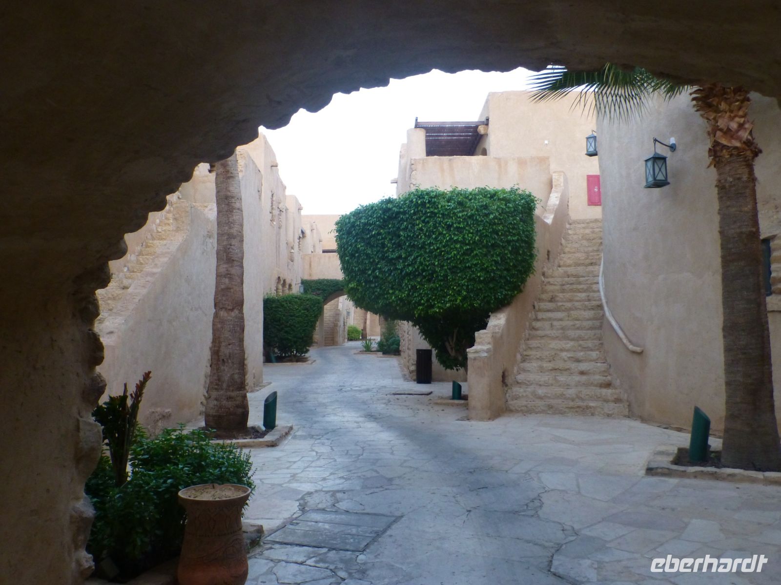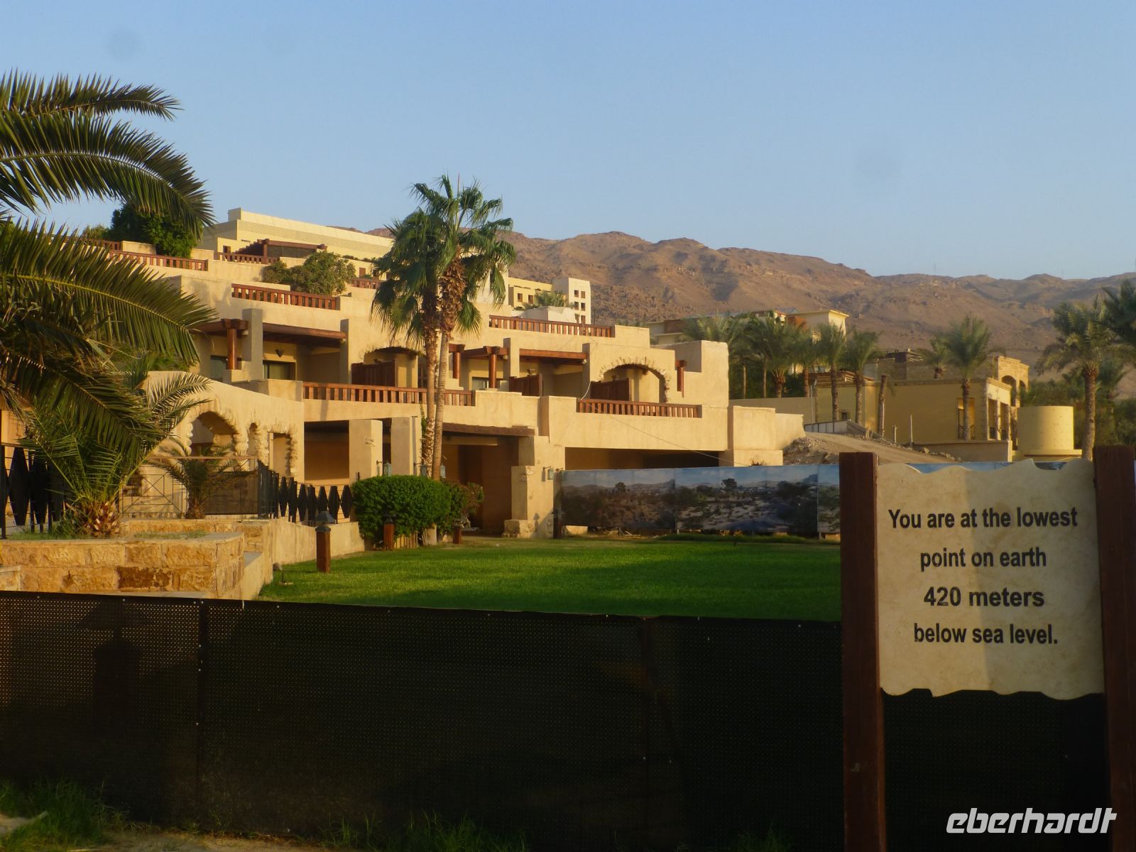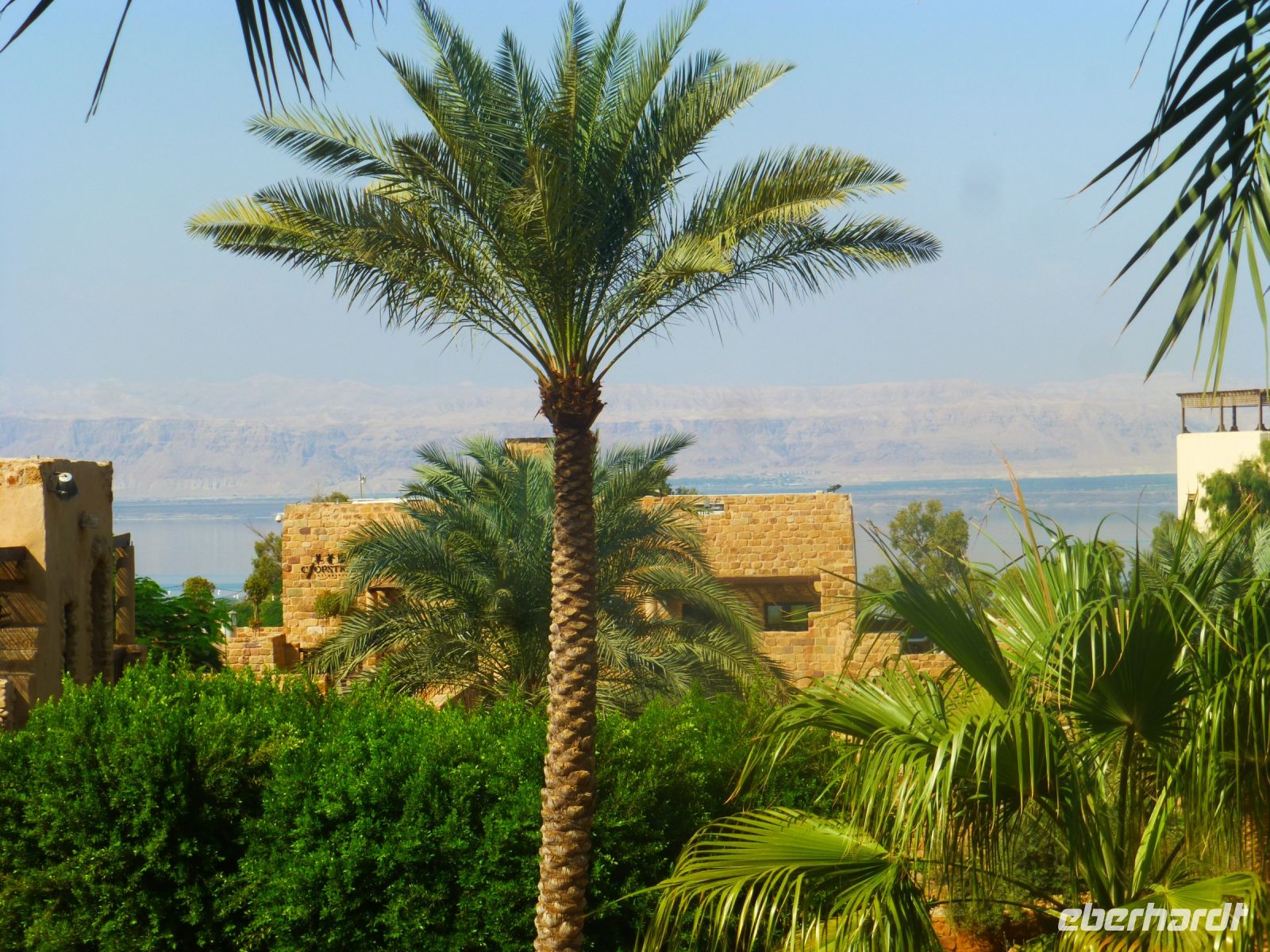 Als wir uns selbst überlassen sind, nehmen wir wahr, in welches zauberhafte Resort es uns verschlagen hat. Wie eine Karawanserei ist das Hotel gebaut, ein Dörfchen inmitten einer Oase, mit Plätzen, Brunnen, Brücken und Treppen. Jedes Zimmer hat eine Terrasse oder einen Balkon. Es gibt zwei Pools, eine Aktionsfläche, auf der den ganzen Tag über Programm läuft, einen Marktplatz mit Restaurant und Bühne und den Zugang zum Toten Meer.