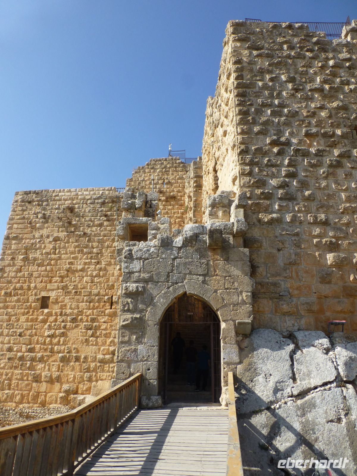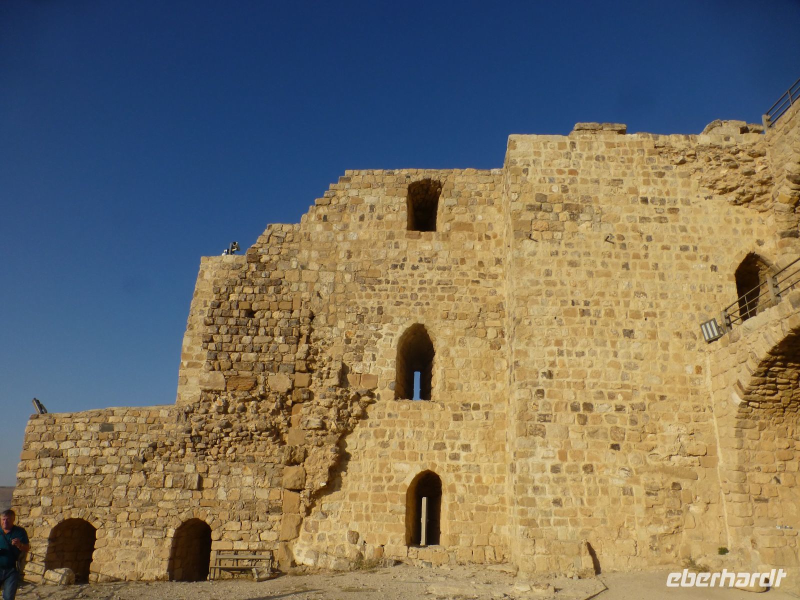 Wir lassen uns bequem wie Könige durch die Landschaft fahren. Unser nächstes Highlight ist landschaftlicher Natur: das Wadi Mujib, der Grand Canyon Jordaniens. Ein imposantes breites Teil, das von einem Fluss durchzogen war. Nun hemmt ein Stausee seinen Lauf, doch enthält er kein Wasser. 2019 war er das letzte Mal gefüllt. Nun freuen sich die Schafe am frischen Grün der Stauseesohle. Beduinenzelte sehen wir rechts und links der Straße; anstatt des Dromedars übernimmt das Auto nun den Transport. Unser Busfahrer Achmed fährt die vielen Kurven sehr achtsam runter und auf der anderen Seite wieder hoch. Für uns ergeben sich immer neue Blicke bis wir in Kerak landen. Es ist die imposanteste Kreuzritterburg, die hoch oben über der Kleinstadt thront und wichtiges Glied in einer ganzen Kette von Burgen, die von der Südtürkei über Syrien bis an das Rote Meer reichte. Obgleich die Burg 1142 den neuesten Verteidigungsmaßgaben entsprach, hielt sie gerade 40 Jahre, bevor Saladin sie 1188 eroberte. Die Gewölbegänge und Säle sind imposant und zeugen von einer großen Wehrhaftigkeit der Burg.