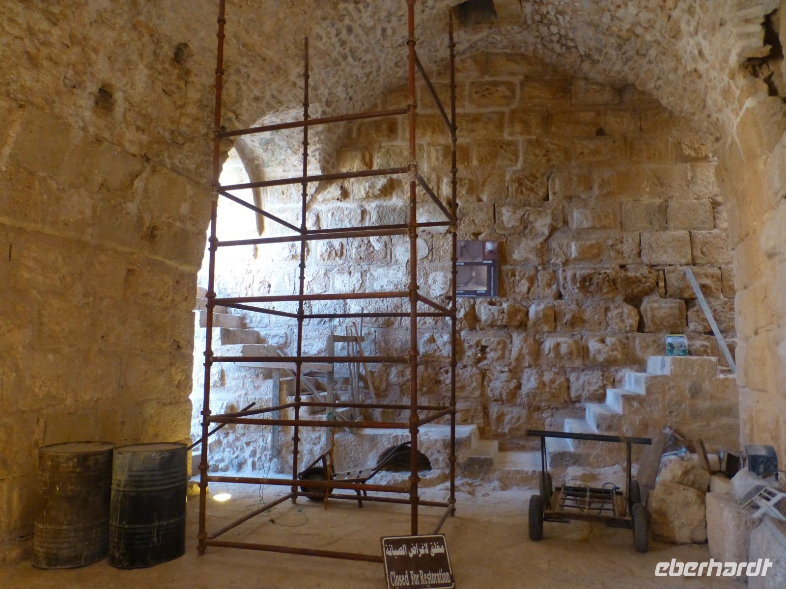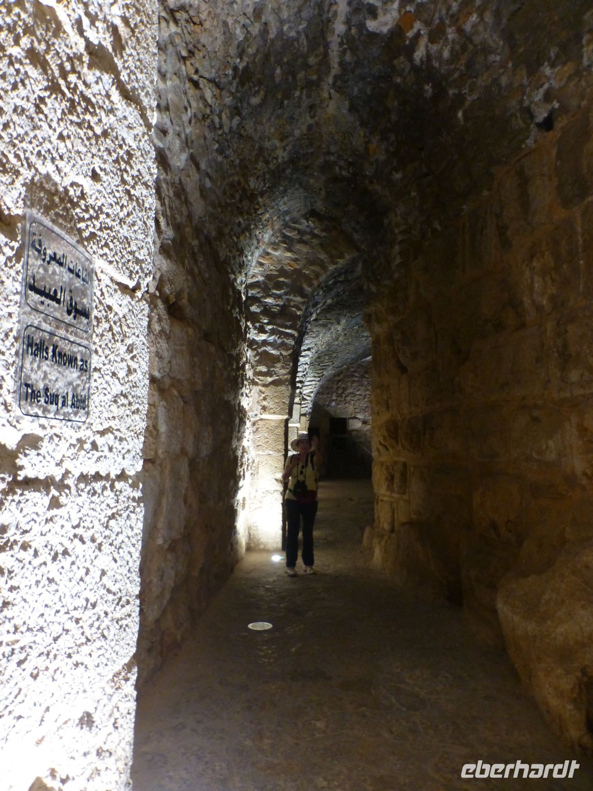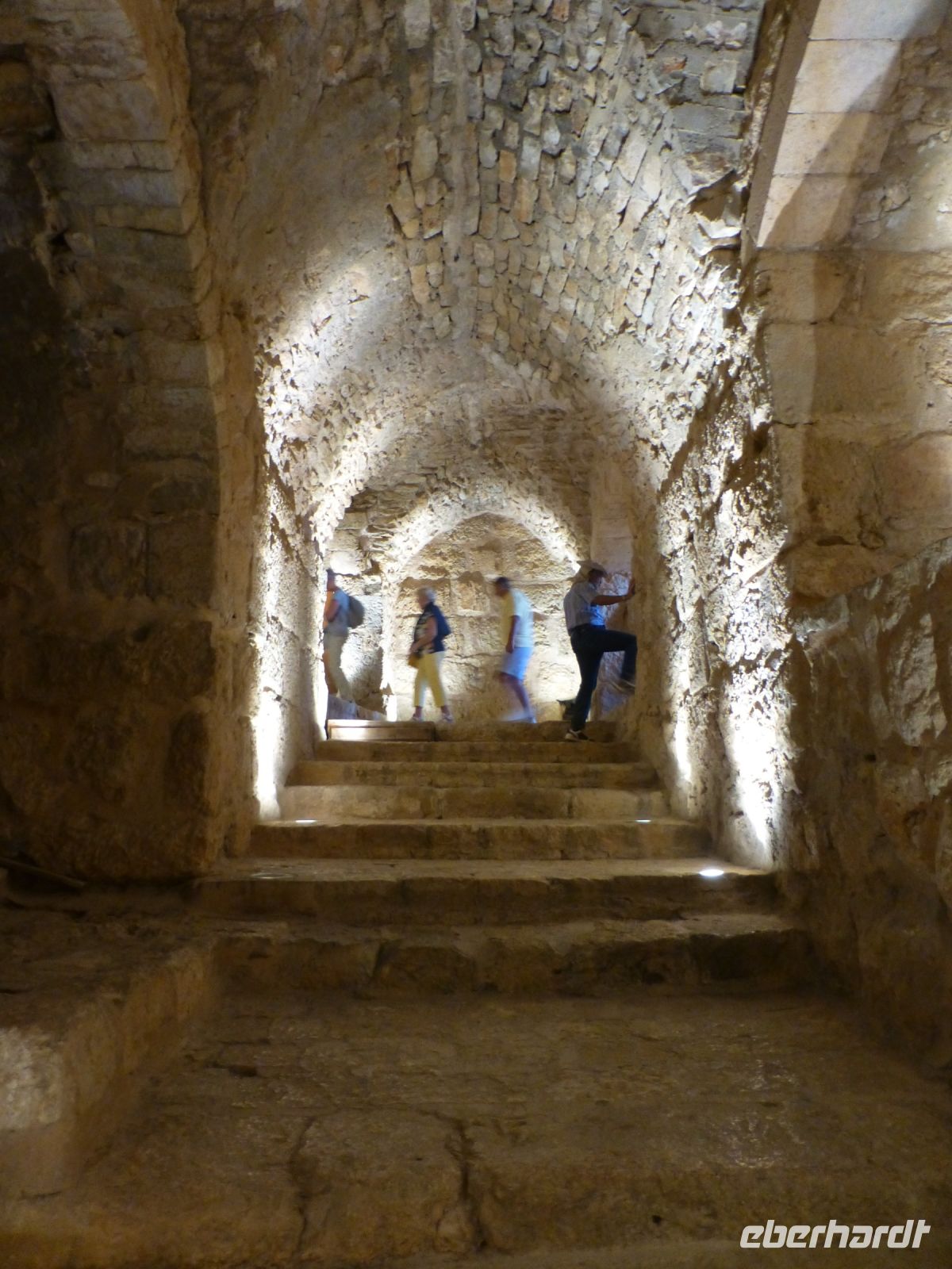 Wir fahren über Jerash, entlang der Ausgrabungsstätte, so dass wir sehen, was uns nachher noch erwartet. Noch einige Kilometer, dann kommt die Burg in den Blick. Wie ein Adlerhorst sitzt sie oben auf dem Berg – wie es sich für eine richtige Burg gehört. Von Saladin hören wir nun zum ersten Mal, jener, dem Lessing im „Nathan der Weise“ ein Denkmal gesetzt hat. Denn sein Neffe errichtete im späten 12. Jahrhunder eine Kette von Burgen gegen die Kreuzritter, um die Pilgerroute nach Mekka zu schützen und drei Hauptrouten, darunter die wichtigste zwischen Jordanien und Syrien. Die Burg ist sehr schön restauriert und auch jetzt wird noch weiter ausgegraben und das Gemäuer instand gesetzt. Und auch hier: Zisternen sorgten für das Überleben bei Belagerungen und ein Wasserkanal zieht sich sogar durch einen der Räume. Früher war die Burg gar durch einen Wassergraben gesichert.