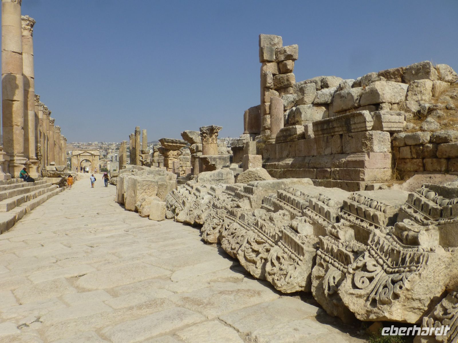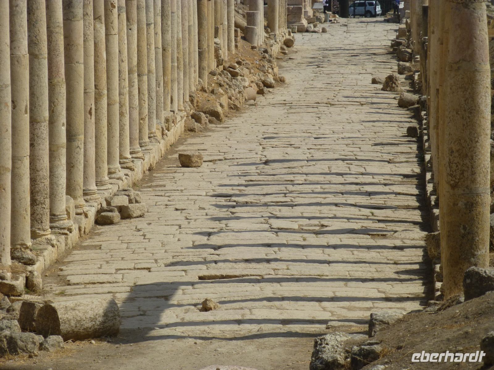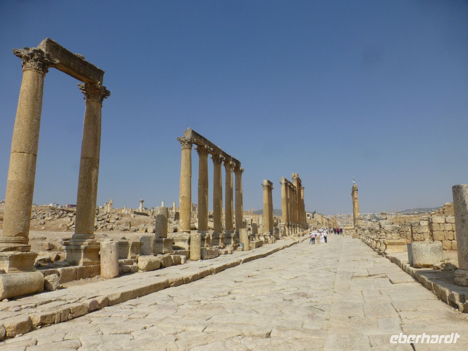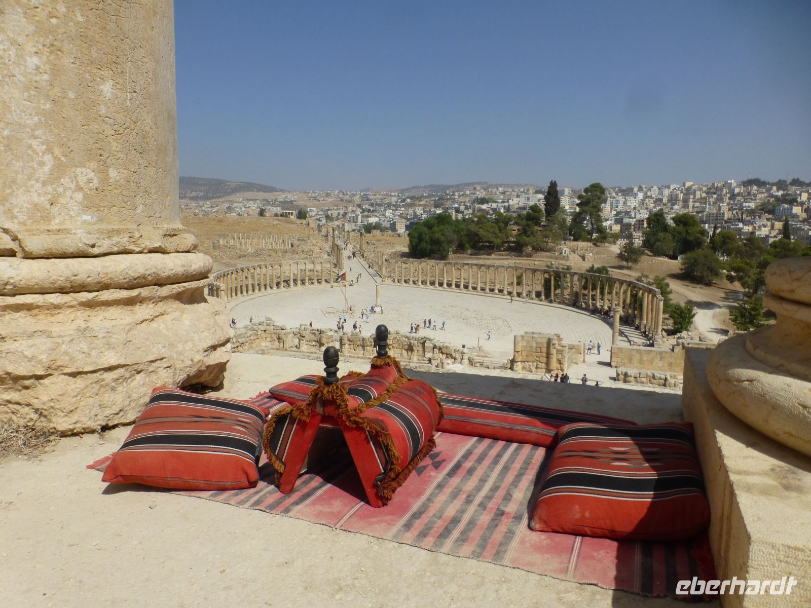 Wir fahren zurück nach Jerash, der römischen Ausgrabung, die zu Recht „Pompeji des Ostens“ genannt wird. Wasser war auch hier ein Grund für die Ansiedlung am Westufer des Chrysorhoas. Bis ins erste Jahrhundert n.Chr. unbedeutend, erlebt die Stadt unter der römischen Herrschaft einen ungeheuren Aufschwung. Sie wird Mitglied der Dekapolis, einem Zusammenschluss von zehn antiken Städten unter der Herrschaft der syrischen Provinz Syrien. Die mit Erzvorkommen gesegnete Handelsstadt investiert in eine rege Bautätigkeit. Was für ein Reichtum, von dem die Ausgrabung zeugt. Triumphtor, gleich daneben das Hippodrom, der Zeustempel, das Theater mit 3000 Sitzplätzen, der Artemistempel, ein weiteres Theater, die Prachtstraßen Cardo Maximus, mit rund 260 Säulen gesäumt und geschmückt mit einem großzügigen Nymphäum und das ovale von Säulen umstandene Forum. Über die Kolonnaden gelangte das Frischwasser in die Stadt. Man kann sich auch heute noch gut vorstellen, wie die Straße damals belebt war, mit Pferd und Wagen, deren Abdrücke sieht man noch im antiken Pflaster, Bürgerinnen, die ihre Besorgungen machten, sich auf dem breiten Bürgersteigen ergingen und sich am kühlenden Prachtbrunnen erfrischten.