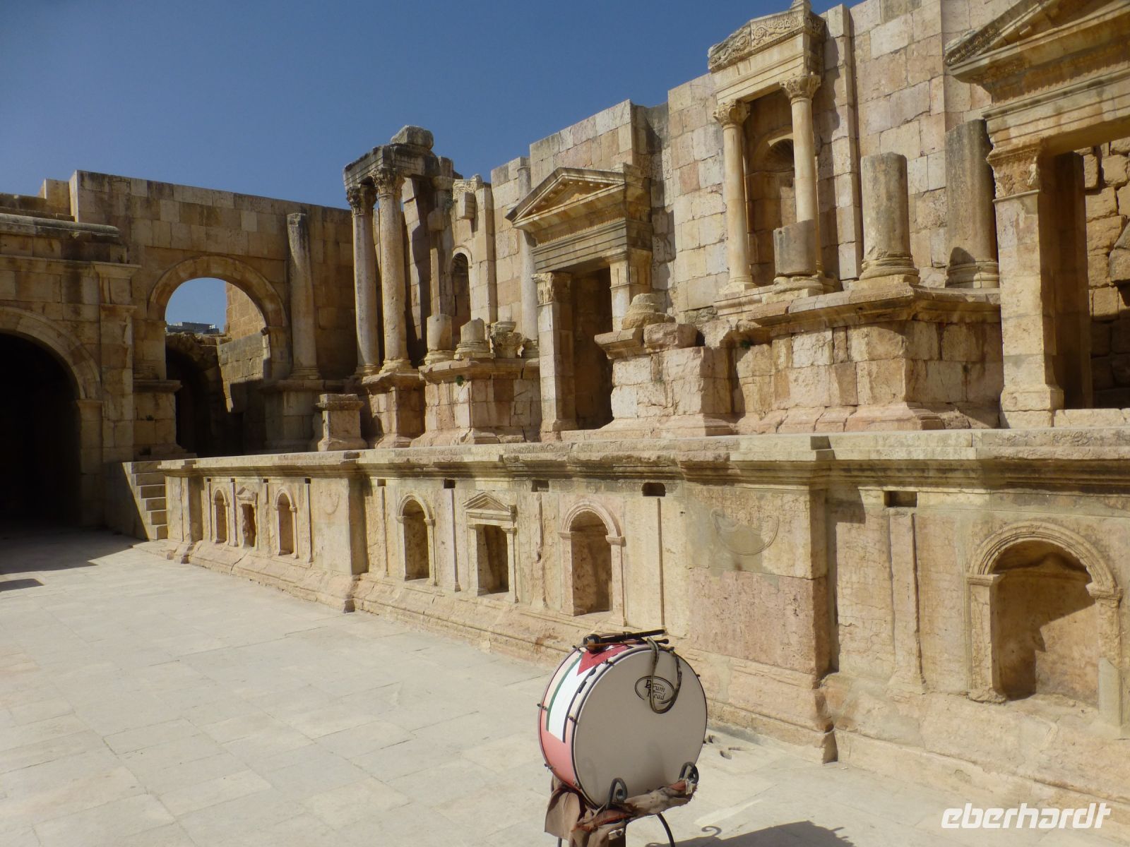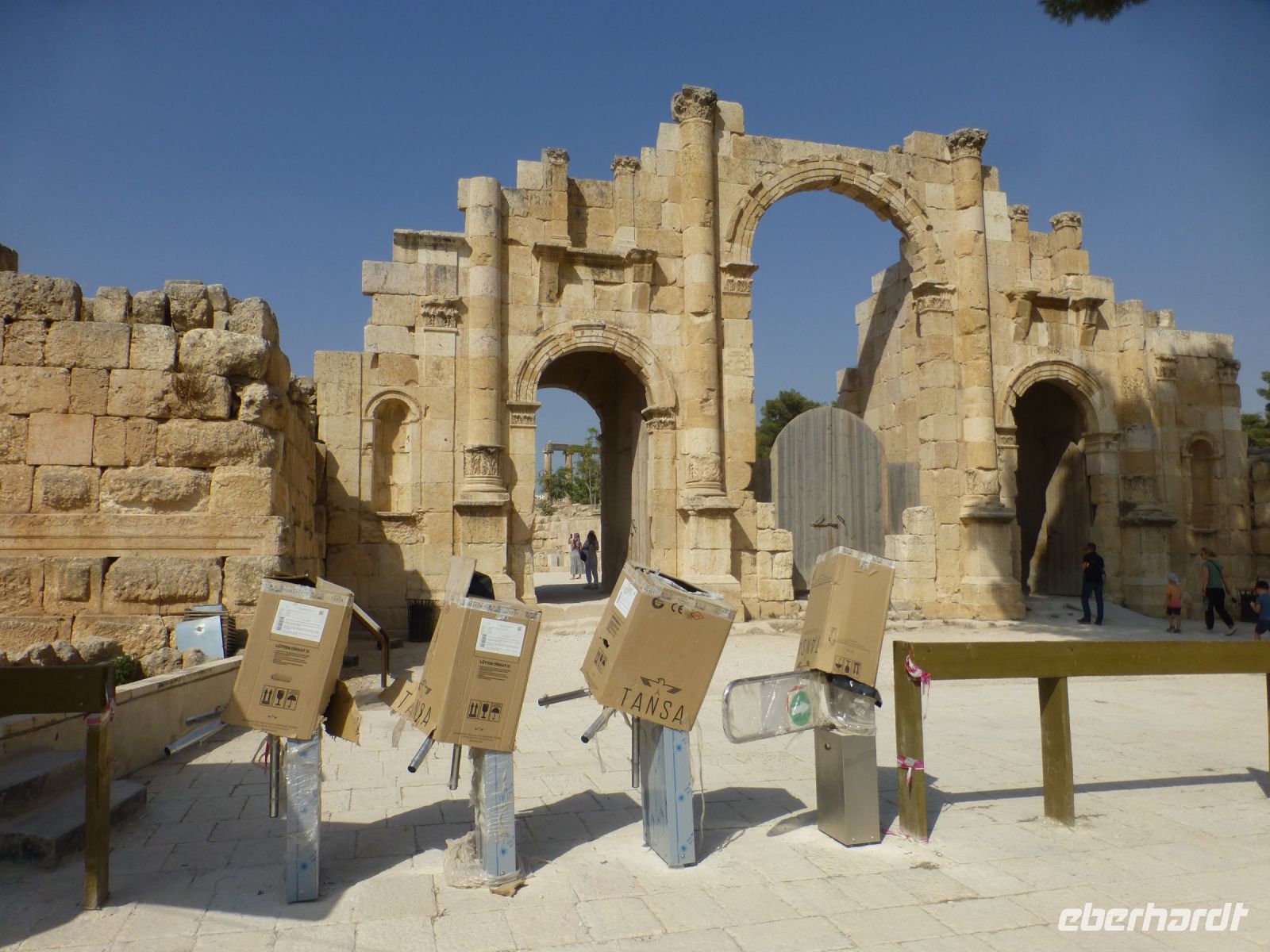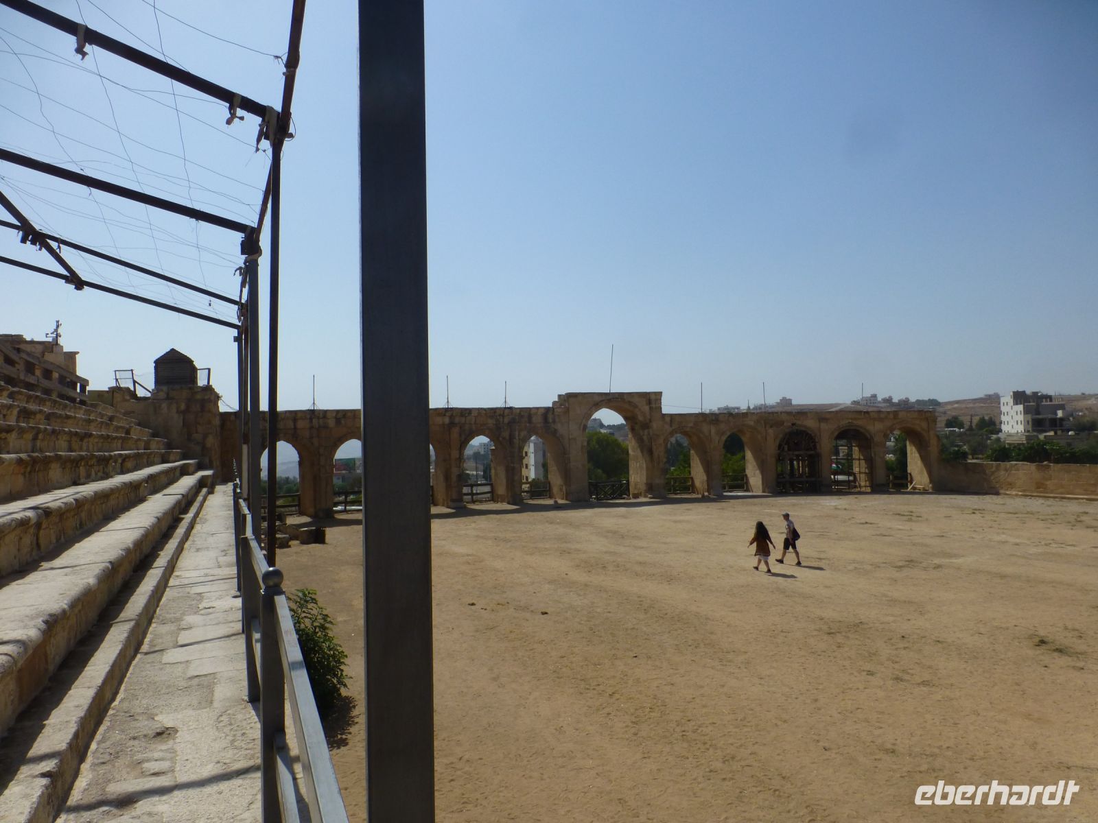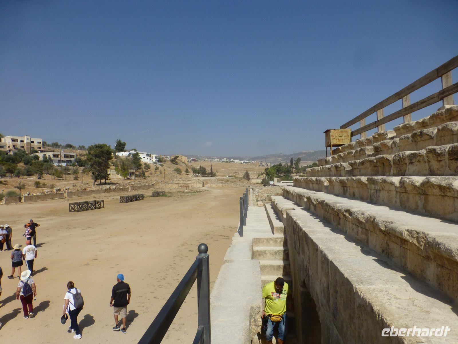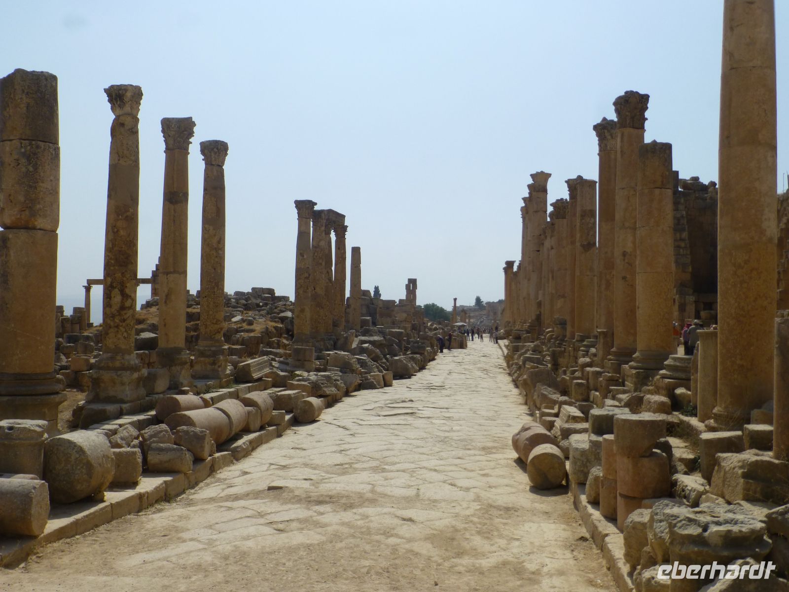 Wir fahren zurück nach Jerash, der römischen Ausgrabung, die zu Recht „Pompeji des Ostens“ genannt wird. Wasser war auch hier ein Grund für die Ansiedlung am Westufer des Chrysorhoas. Bis ins erste Jahrhundert n.Chr. unbedeutend, erlebt die Stadt unter der römischen Herrschaft einen ungeheuren Aufschwung. Sie wird Mitglied der Dekapolis, einem Zusammenschluss von zehn antiken Städten unter der Herrschaft der syrischen Provinz Syrien. Die mit Erzvorkommen gesegnete Handelsstadt investiert in eine rege Bautätigkeit. Was für ein Reichtum, von dem die Ausgrabung zeugt. Triumphtor, gleich daneben das Hippodrom, der Zeustempel, das Theater mit 3000 Sitzplätzen, der Artemistempel, ein weiteres Theater, die Prachtstraßen Cardo Maximus, mit rund 260 Säulen gesäumt und geschmückt mit einem großzügigen Nymphäum und das ovale von Säulen umstandene Forum. Über die Kolonnaden gelangte das Frischwasser in die Stadt. Man kann sich auch heute noch gut vorstellen, wie die Straße damals belebt war, mit Pferd und Wagen, deren Abdrücke sieht man noch im antiken Pflaster, Bürgerinnen, die ihre Besorgungen machten, sich auf dem breiten Bürgersteigen ergingen und sich am kühlenden Prachtbrunnen erfrischten.