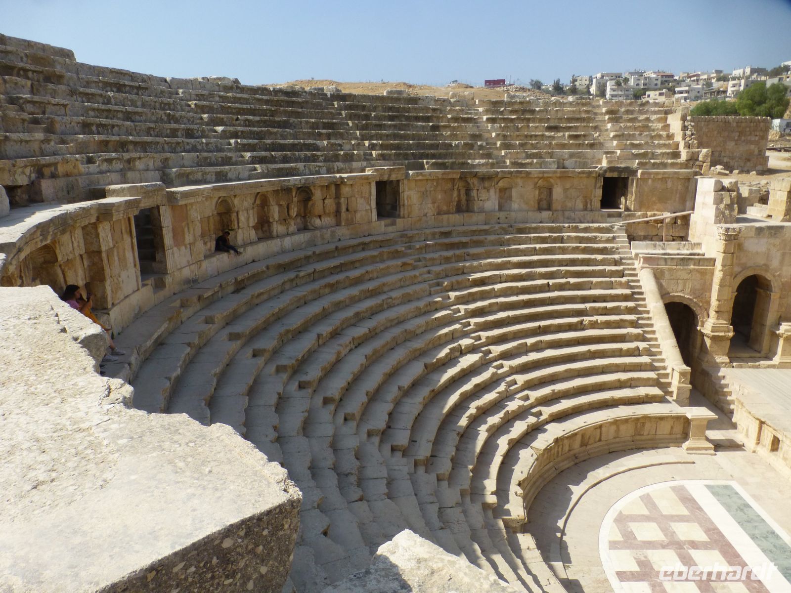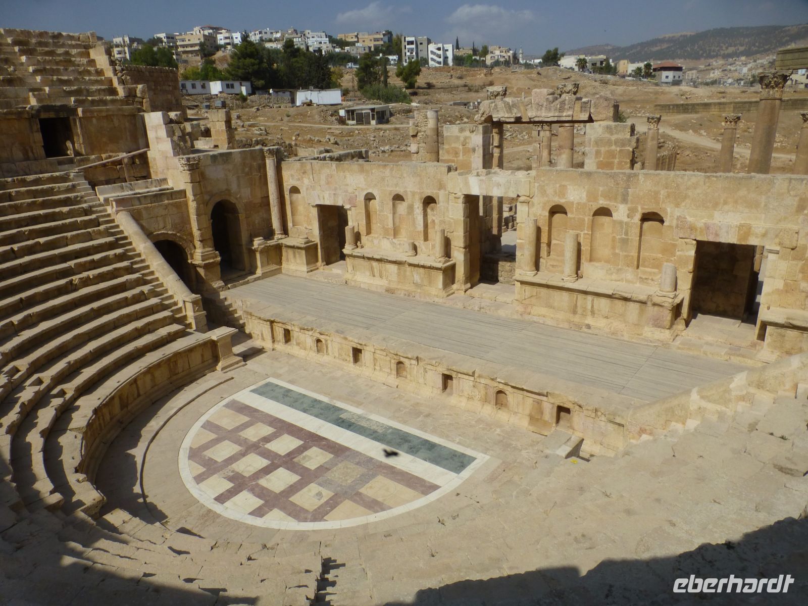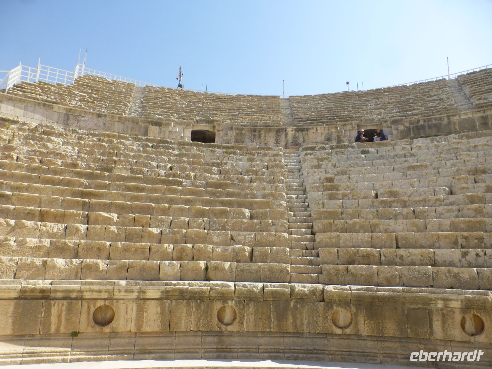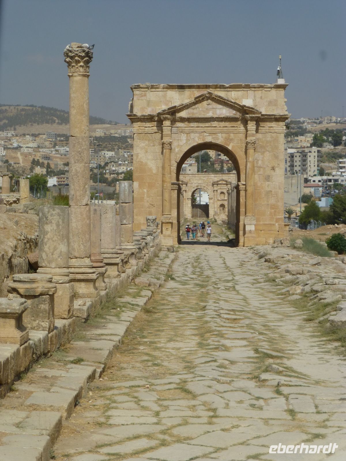 Wir fahren zurück nach Jerash, der römischen Ausgrabung, die zu Recht „Pompeji des Ostens“ genannt wird. Wasser war auch hier ein Grund für die Ansiedlung am Westufer des Chrysorhoas. Bis ins erste Jahrhundert n.Chr. unbedeutend, erlebt die Stadt unter der römischen Herrschaft einen ungeheuren Aufschwung. Sie wird Mitglied der Dekapolis, einem Zusammenschluss von zehn antiken Städten unter der Herrschaft der syrischen Provinz Syrien. Die mit Erzvorkommen gesegnete Handelsstadt investiert in eine rege Bautätigkeit. Was für ein Reichtum, von dem die Ausgrabung zeugt. Triumphtor, gleich daneben das Hippodrom, der Zeustempel, das Theater mit 3000 Sitzplätzen, der Artemistempel, ein weiteres Theater, die Prachtstraßen Cardo Maximus, mit rund 260 Säulen gesäumt und geschmückt mit einem großzügigen Nymphäum und das ovale von Säulen umstandene Forum. Über die Kolonnaden gelangte das Frischwasser in die Stadt. Man kann sich auch heute noch gut vorstellen, wie die Straße damals belebt war, mit Pferd und Wagen, deren Abdrücke sieht man noch im antiken Pflaster, Bürgerinnen, die ihre Besorgungen machten, sich auf dem breiten Bürgersteigen ergingen und sich am kühlenden Prachtbrunnen erfrischten.