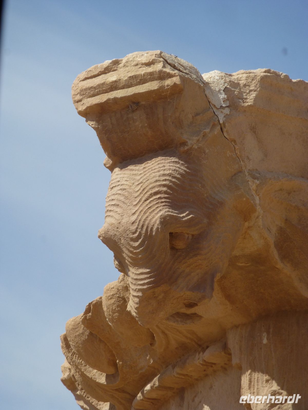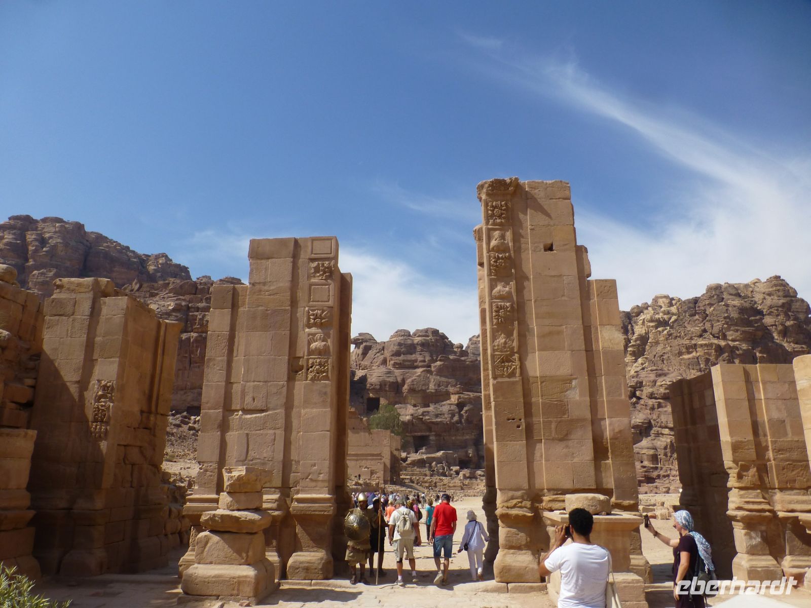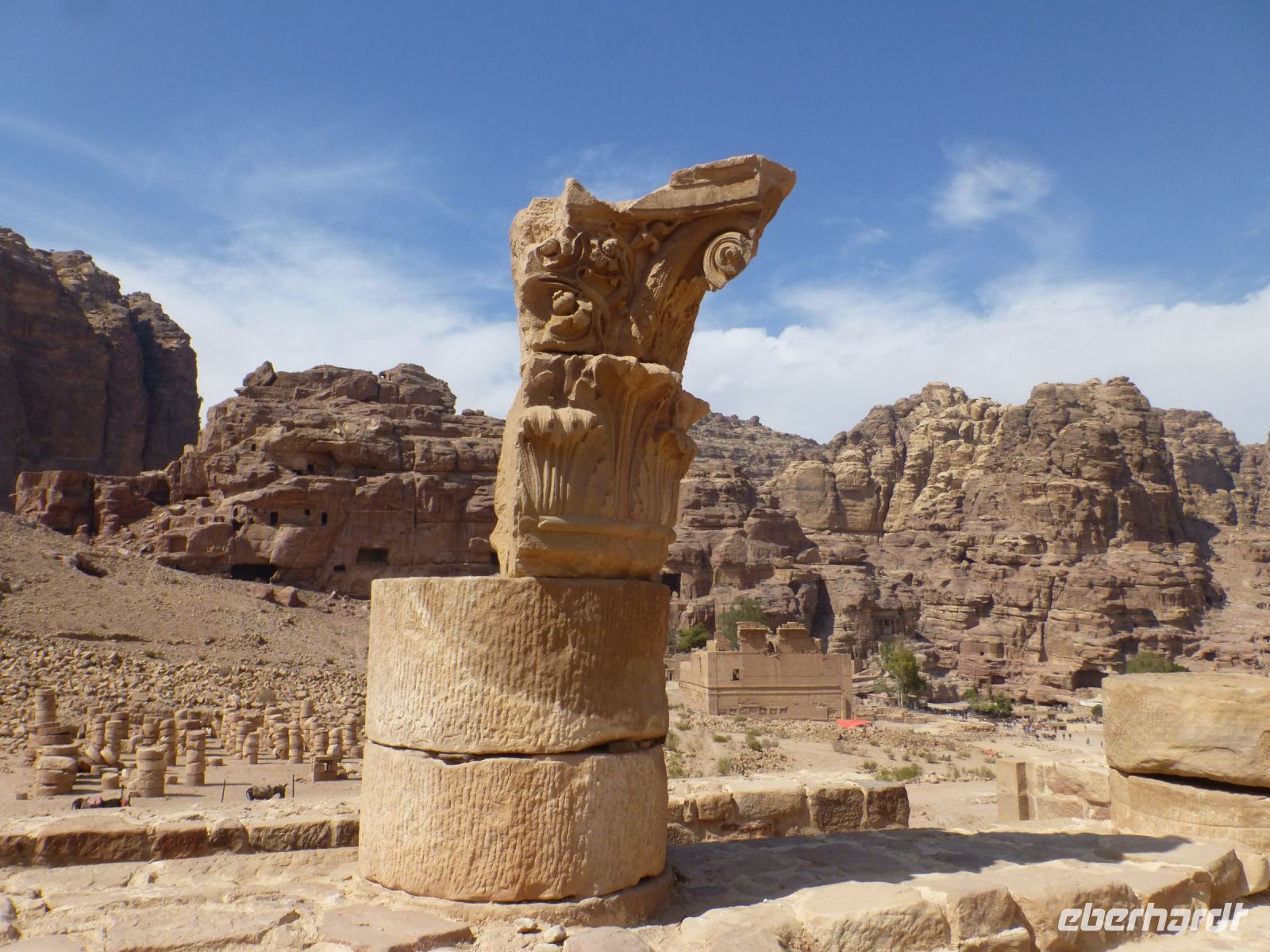 Hier beim Großen Tempel schmücken Elefantenköpfe schmücken die Kapitelle, rund 480 individuelle Tierköpfe. Ein besonders schöner ist im Petra Museum ausgestellt. Und daneben war das große Wasserbassin, Wasserbecken mit Inselpavillon und Ziergärten davor. Es diente dem Genuss, der Erholung, dem Prestige, hiermit wurde die kostbare Ressource Wasser zur Schau gestellt.