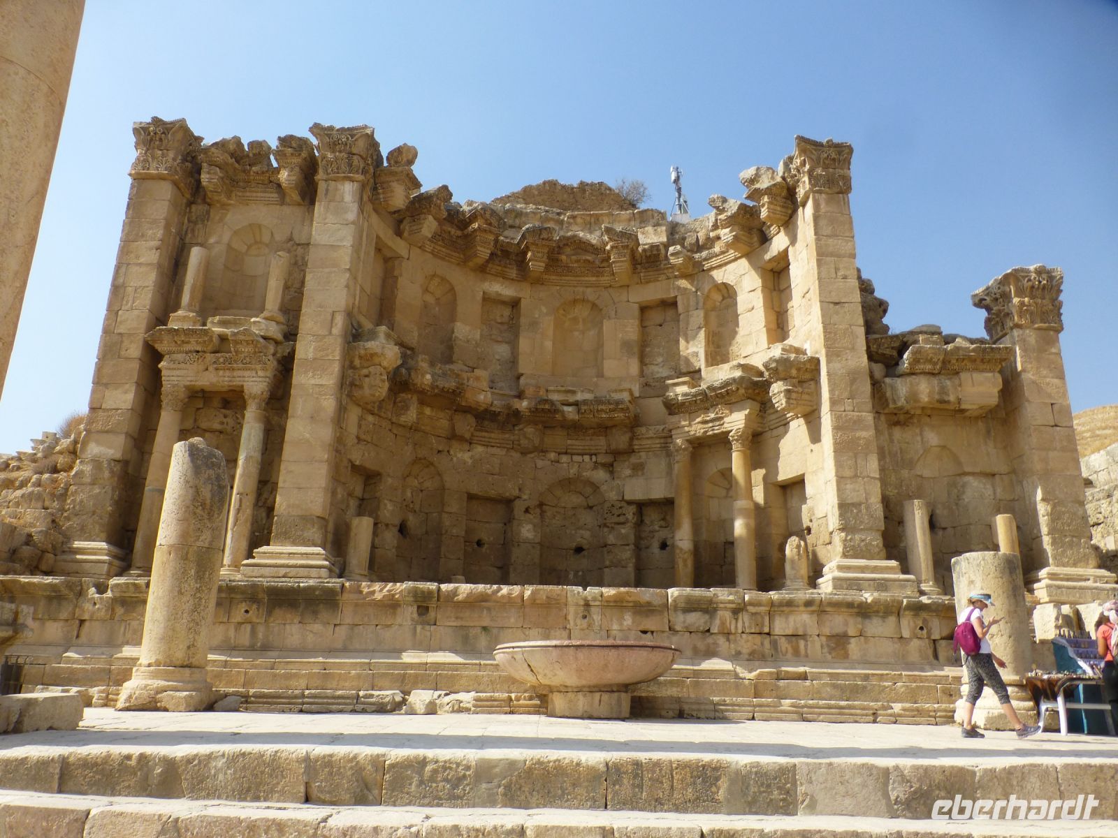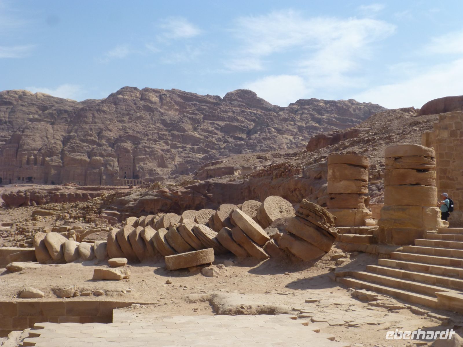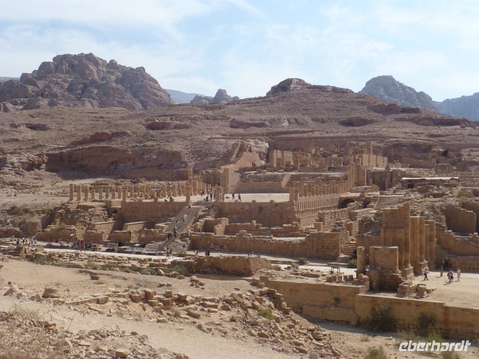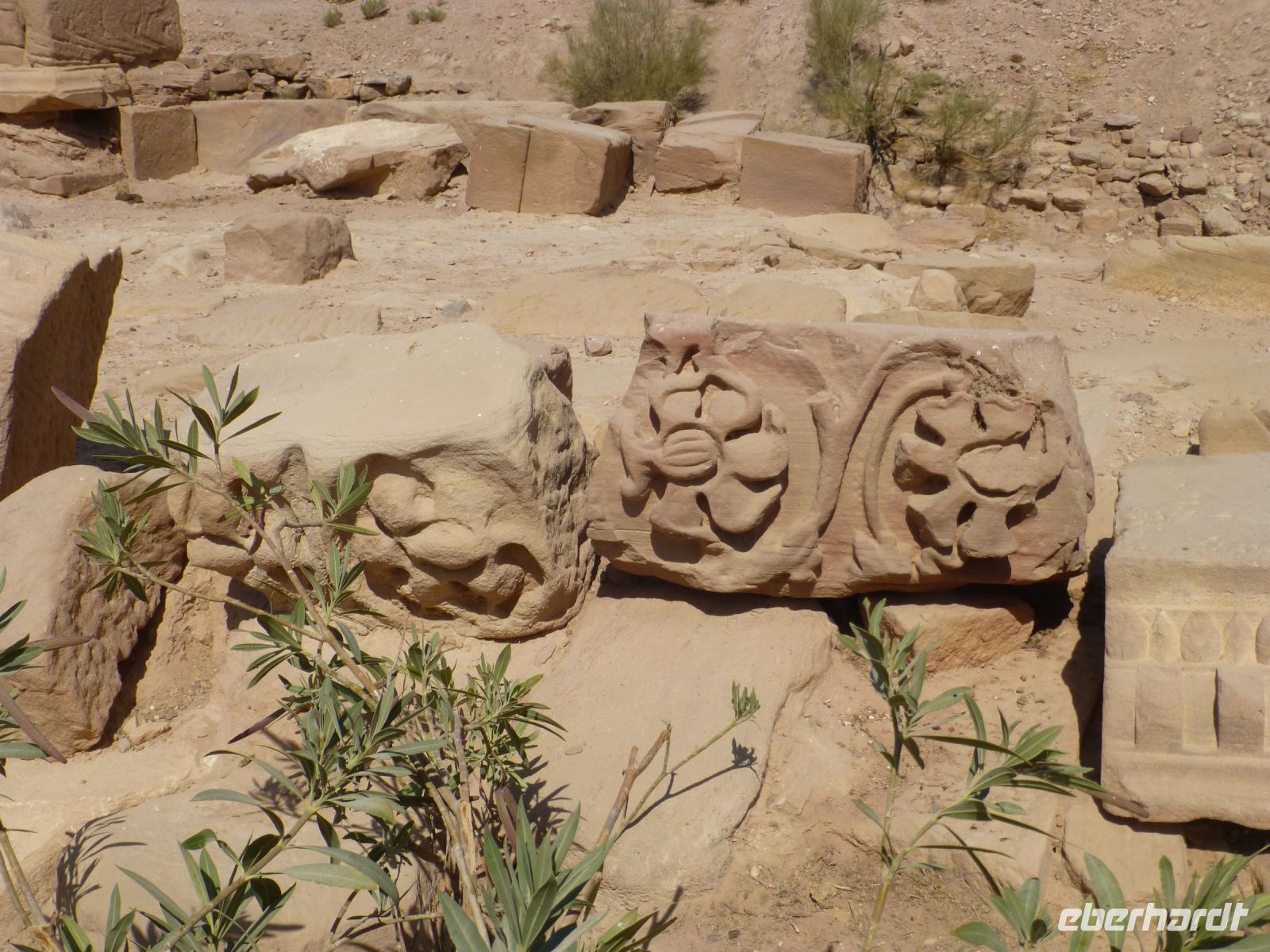 Hier beim Großen Tempel schmücken Elefantenköpfe schmücken die Kapitelle, rund 480 individuelle Tierköpfe. Ein besonders schöner ist im Petra Museum ausgestellt. Und daneben war das große Wasserbassin, Wasserbecken mit Inselpavillon und Ziergärten davor. Es diente dem Genuss, der Erholung, dem Prestige, hiermit wurde die kostbare Ressource Wasser zur Schau gestellt.